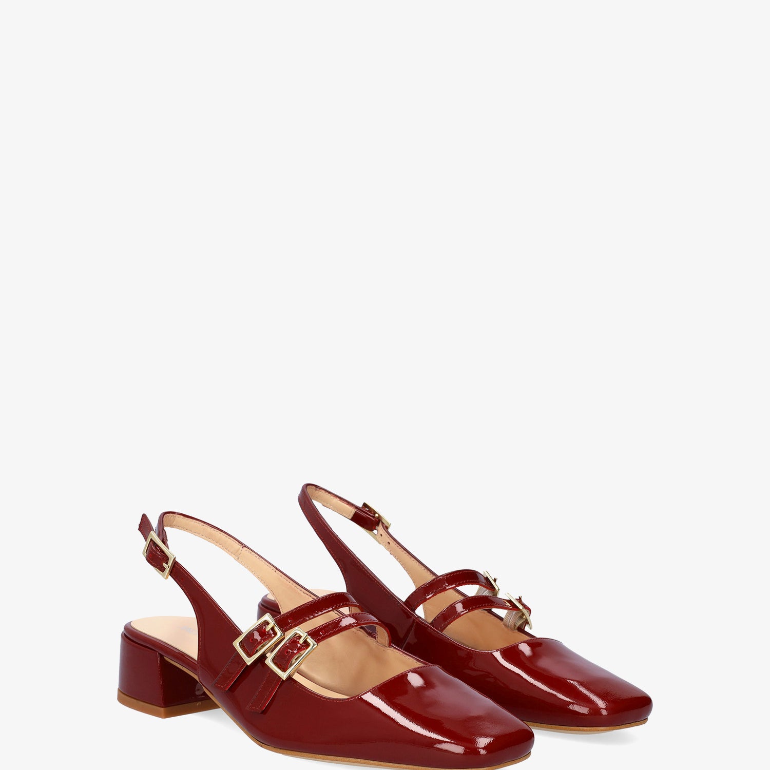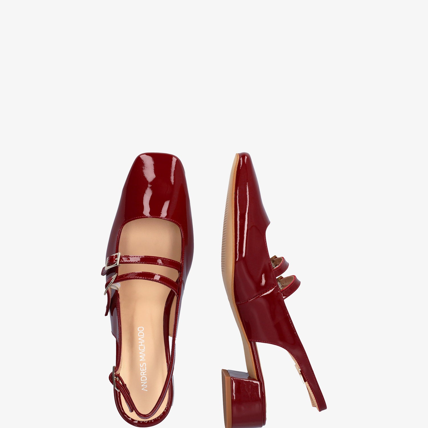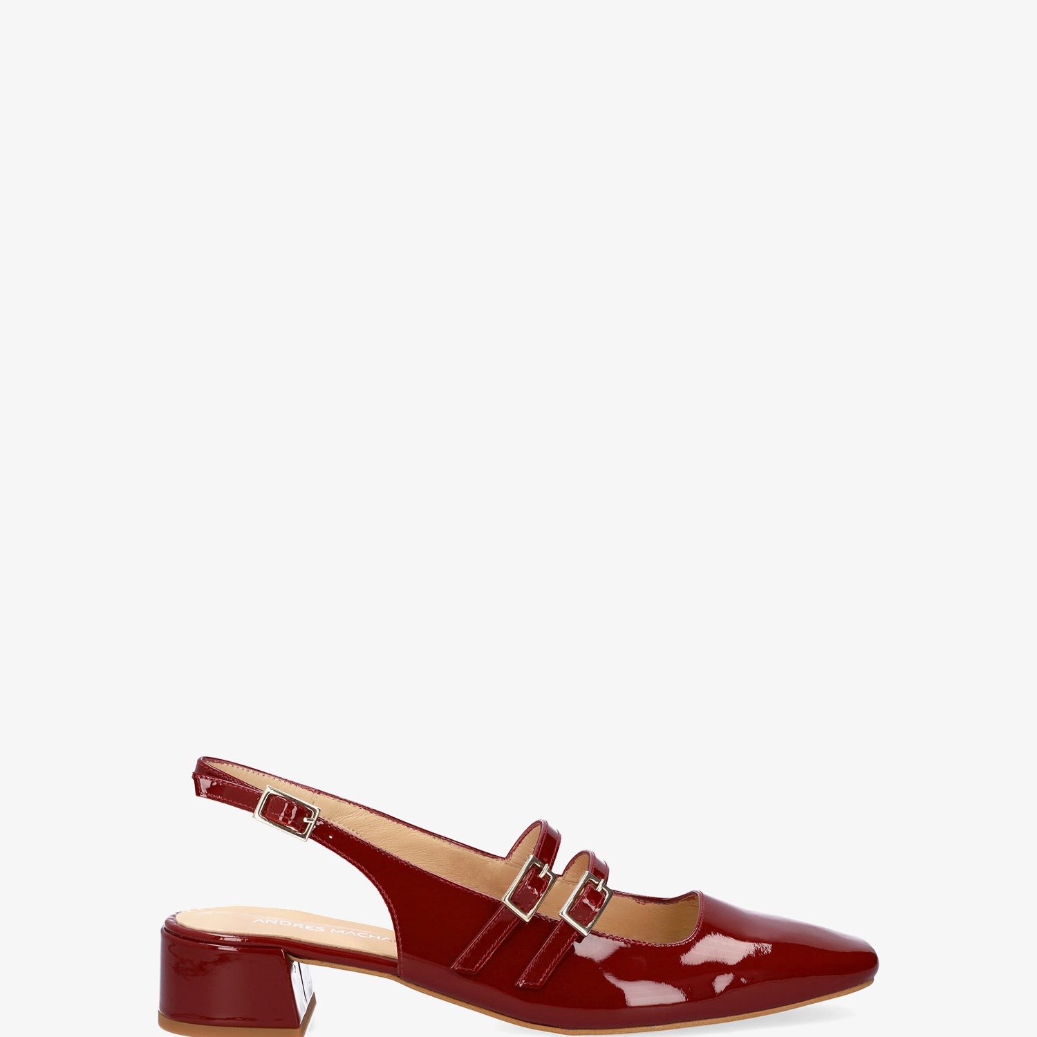 Tänzerin aus kastanienbraunem Lackleder. Rückenfreies Design mit dünnen Trägern und Metallschnallenverschluss am Spann. Abgerundet durch eine quadratische, geschlossene Zehenpartie. Schnallenverschluss seitlich am Knöchel. Innenfutter aus beigefarbenem Leder. 3,5 cm hoher gefütterter Absatz für die kleinen Größen 32 bis 35. 4 cm hoher Absatz für die großen Größen 42 bis 45. Hergestellt in Spanien.