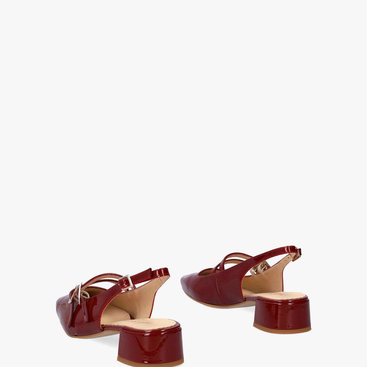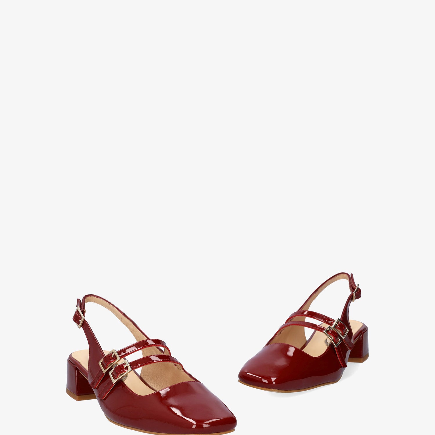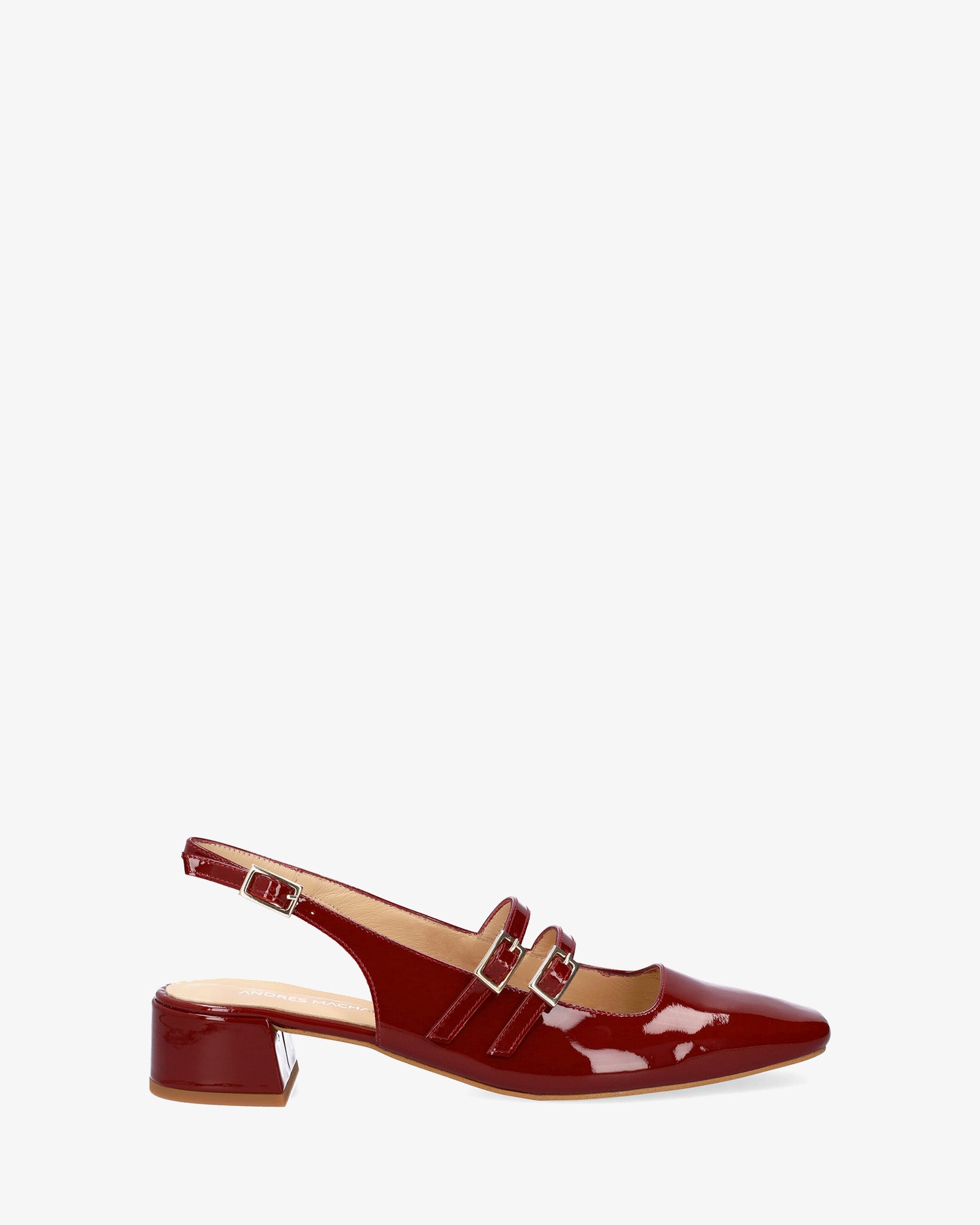 Tänzerin aus kastanienbraunem Lackleder. Rückenfreies Design mit dünnen Trägern und Metallschnallenverschluss am Spann. Abgerundet durch eine quadratische, geschlossene Zehenpartie. Schnallenverschluss seitlich am Knöchel. Innenfutter aus beigefarbenem Leder. 3,5 cm hoher gefütterter Absatz für die kleinen Größen 32 bis 35. 4 cm hoher Absatz für die großen Größen 42 bis 45. Hergestellt in Spanien.