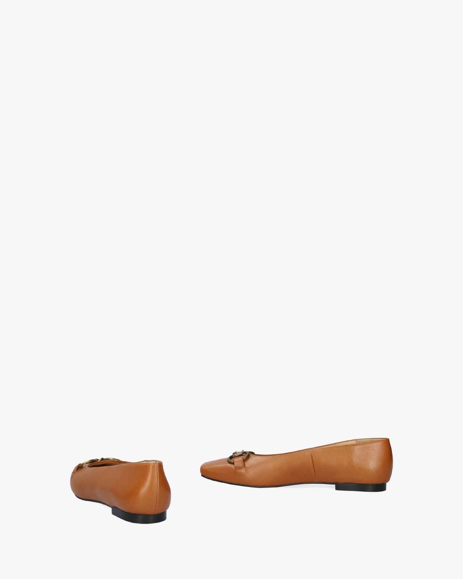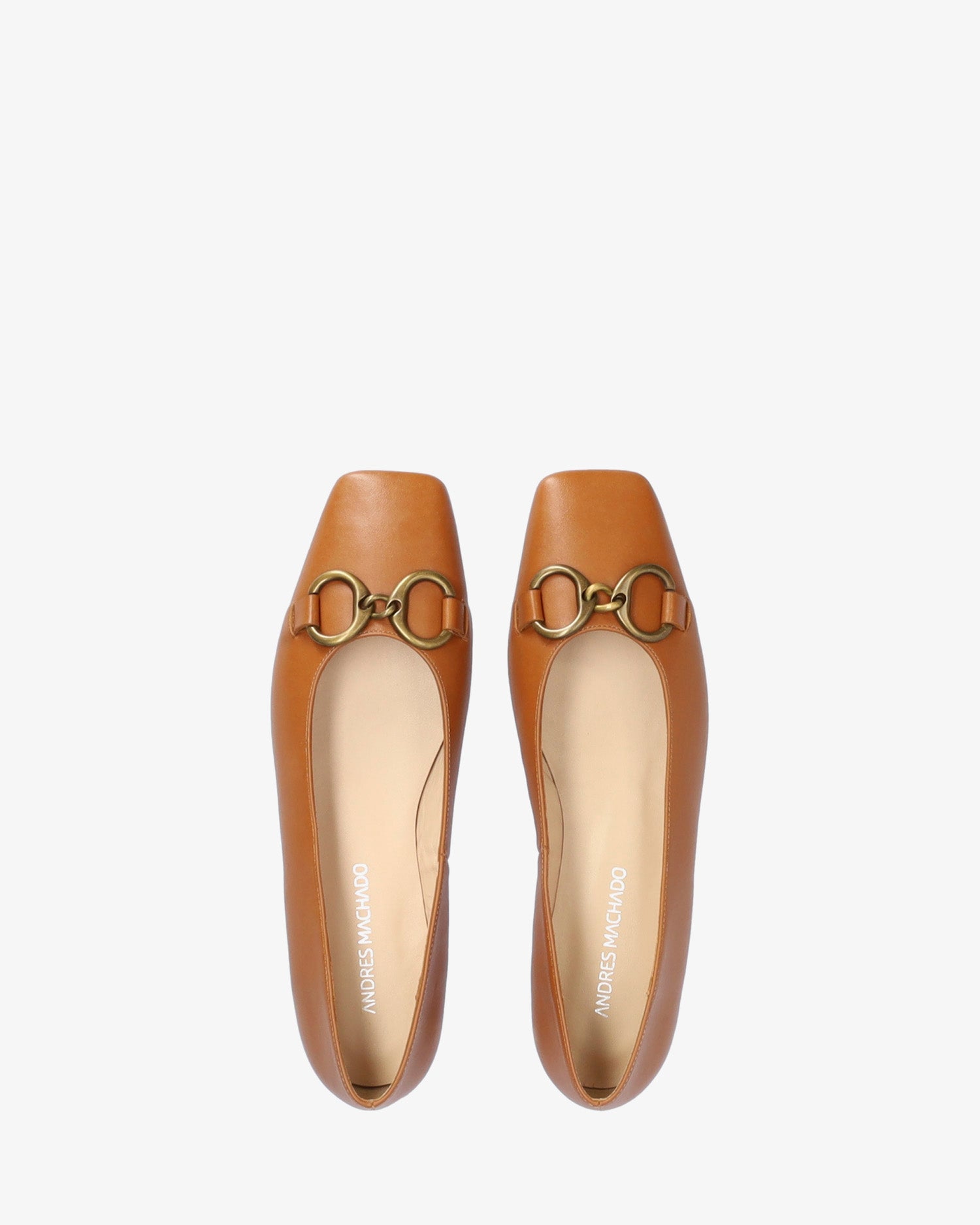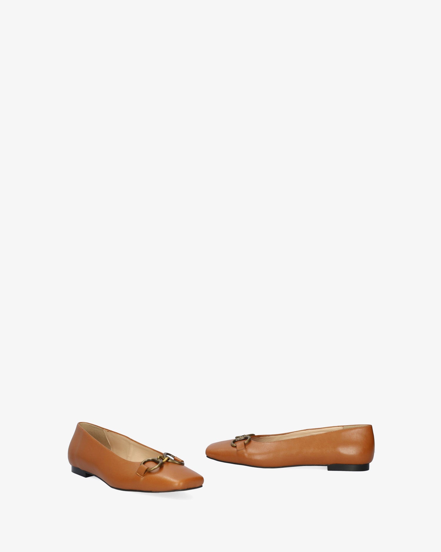 Tänzerin aus lederfarbenem Leder. Dekoratives Metallschnallendetail in gealtertem Gold an der Spitze. Innenfutter aus beigefarbenem Leder. Quadratische Zehenpartie. Erhältlich in den Größen 32 bis 45. Hergestellt in Spanien.