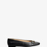 Tänzerin in schwarzem Leder. Dekoratives Metallschnallendetail in gealtertem Gold an der Spitze. Innenfutter aus beigefarbenem Leder. Quadratische Zehenpartie. Erhältlich in den Größen 32 bis 45. Hergestellt in Spanien.
