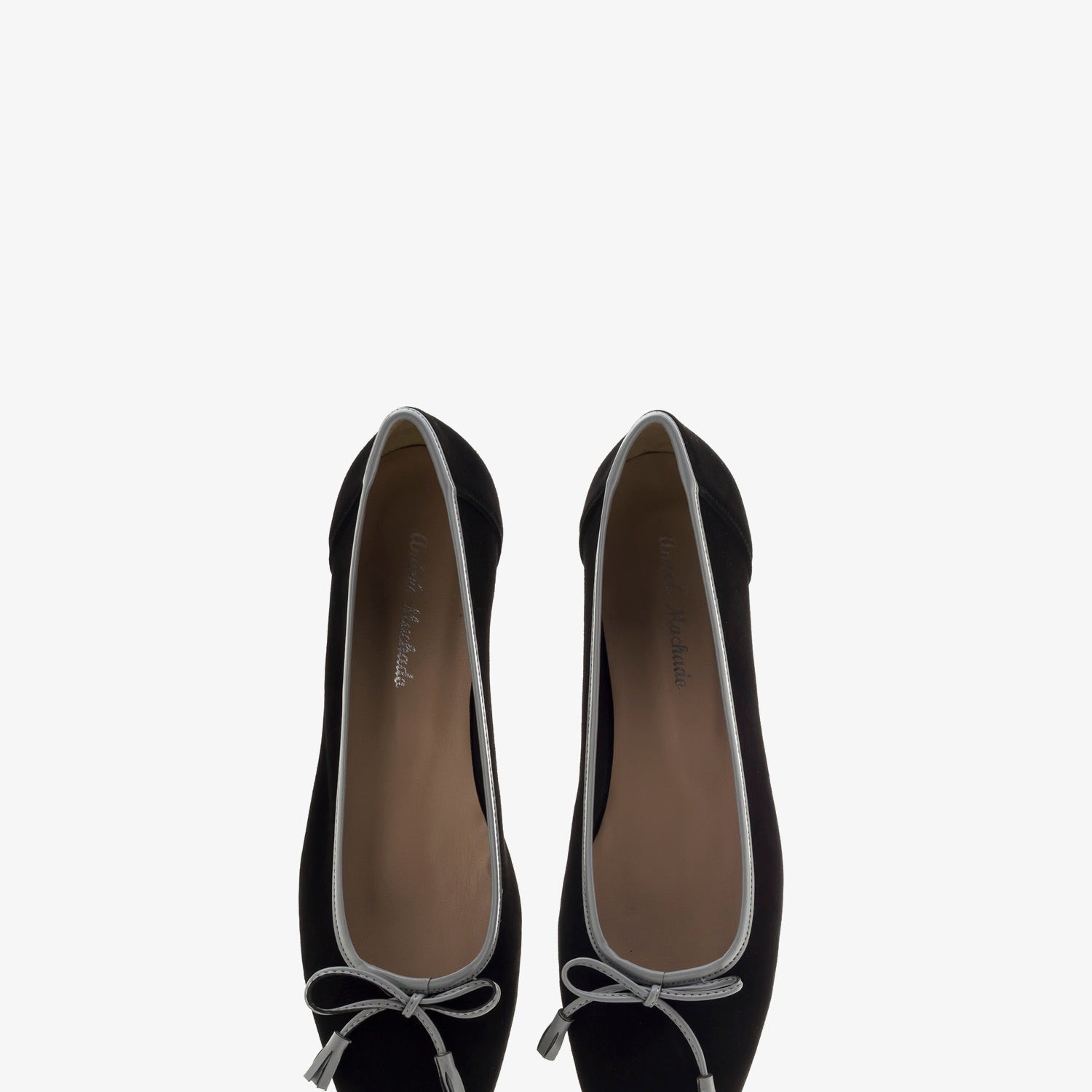 Schwarze Wildleder-Ballerinas. Detail der dekorativen grauen Quastenverzierung und Schleife. Quadratische Zehenpartie und Lederfutter. Mini-Absatz gefüttert in passender 1,5 cm Höhe für große Größen von 42 bis 45. Hergestellt in Spanien.