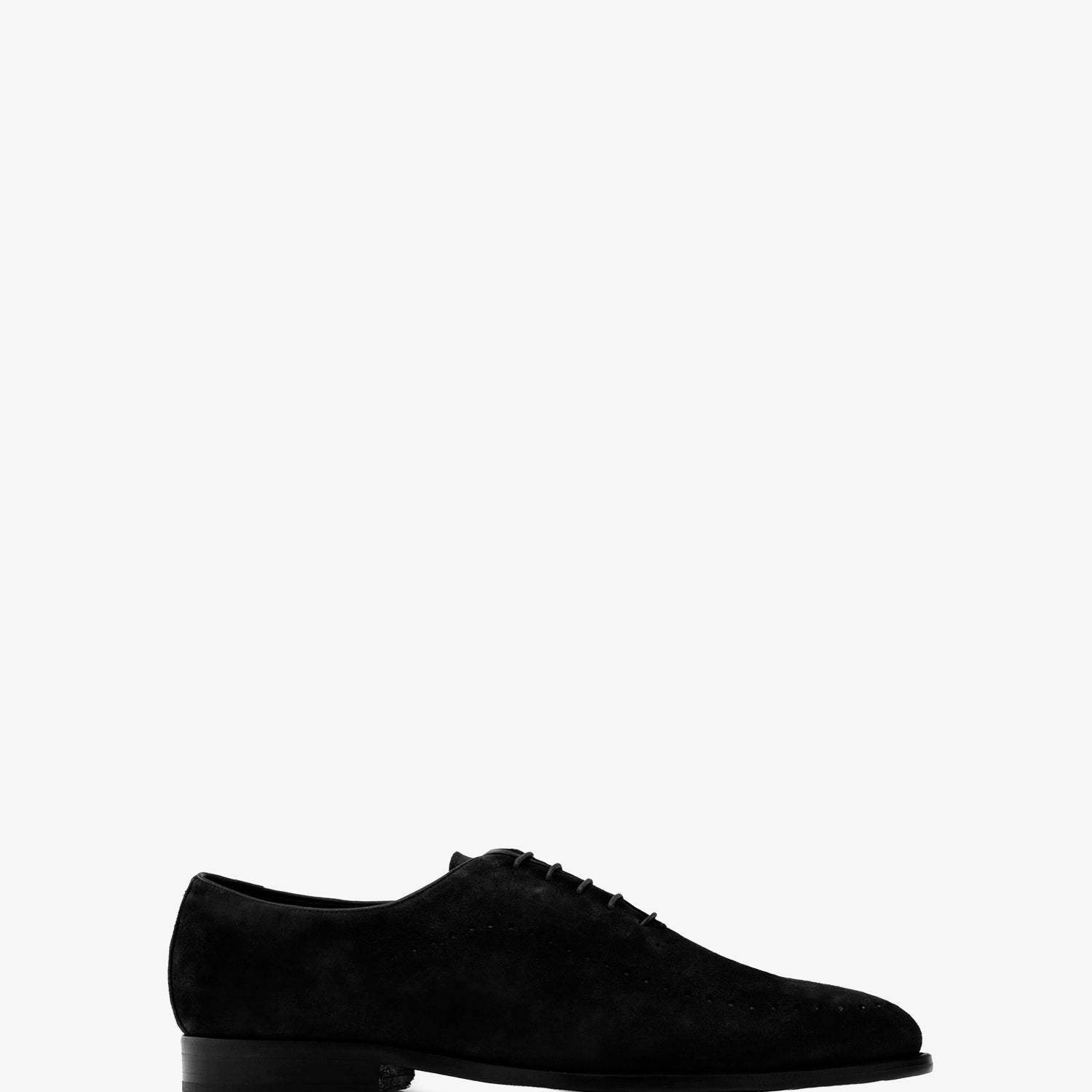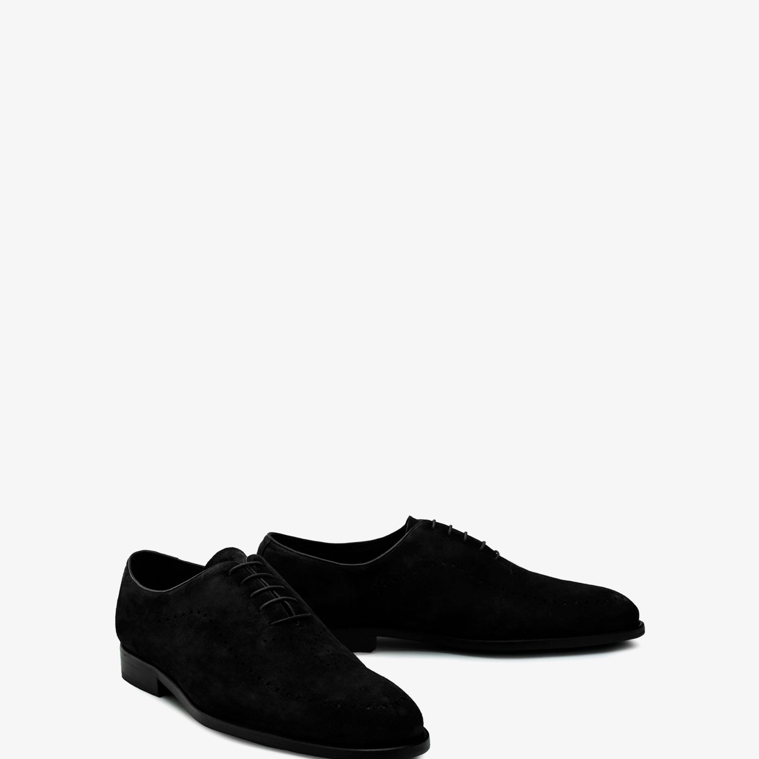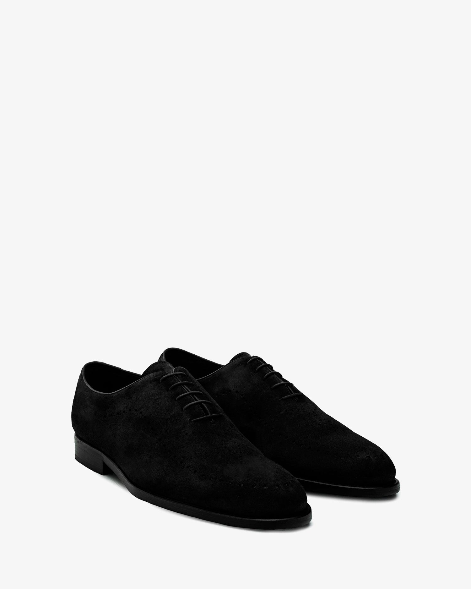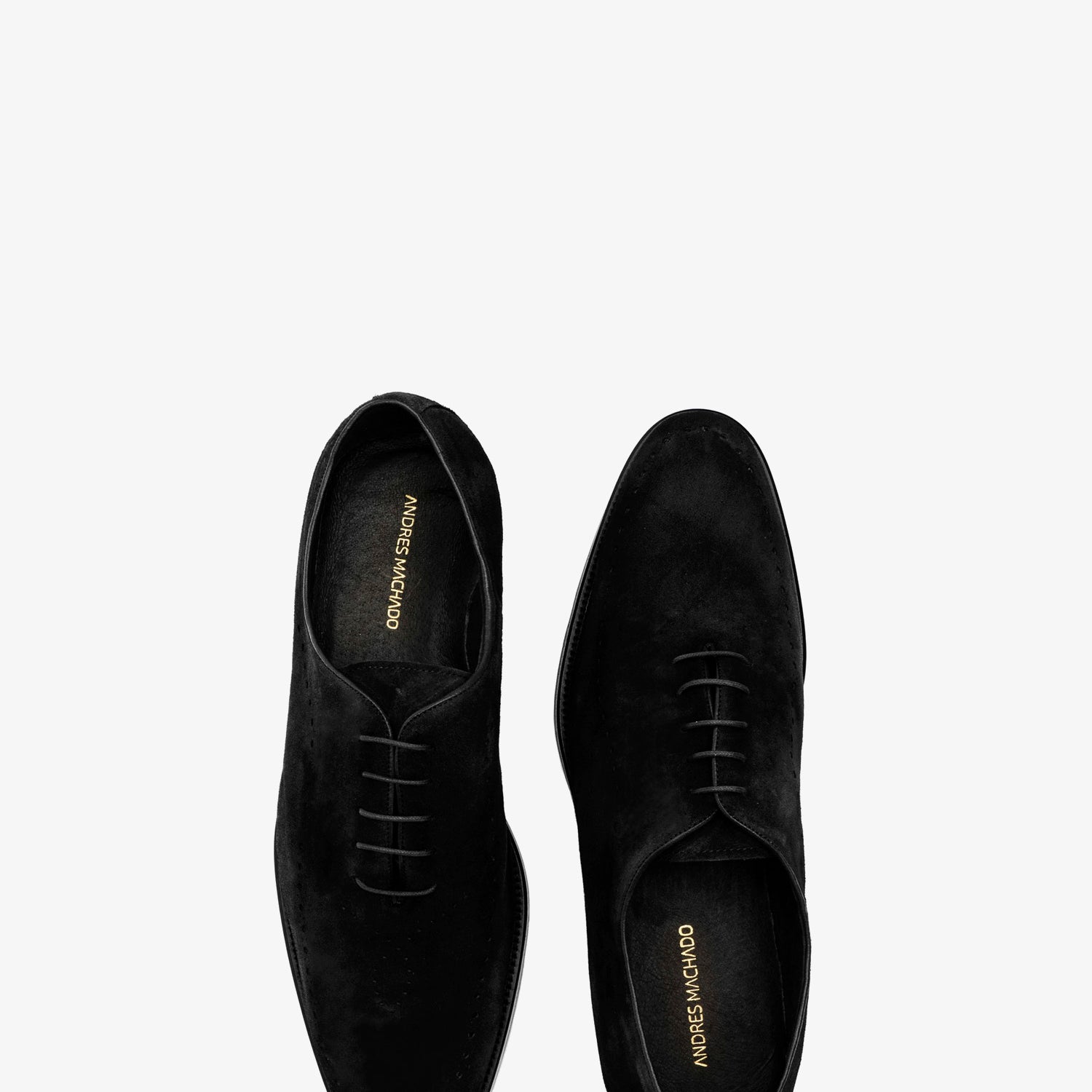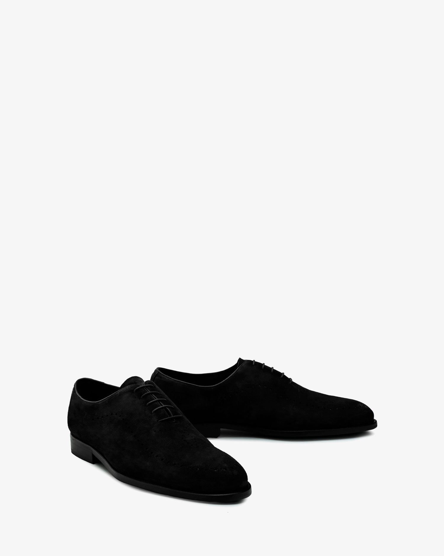 Herrenschuh aus gebürstetem schwarzem Wildleder. Dekoratives Ornamentdetail aus gehackten Kanten am Schnitt. Schwarzes Lederfutter. Schwarzer Schnürverschluss. Schwarze Ledersohle. Große Herrengrößen von 47 bis 50. Hergestellt in Spanien