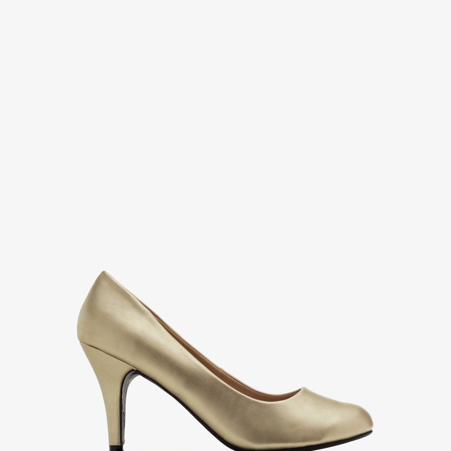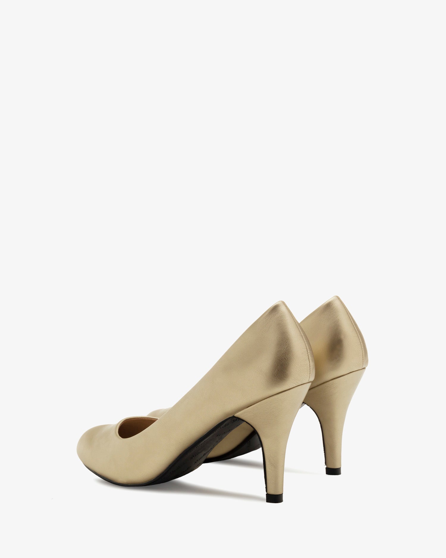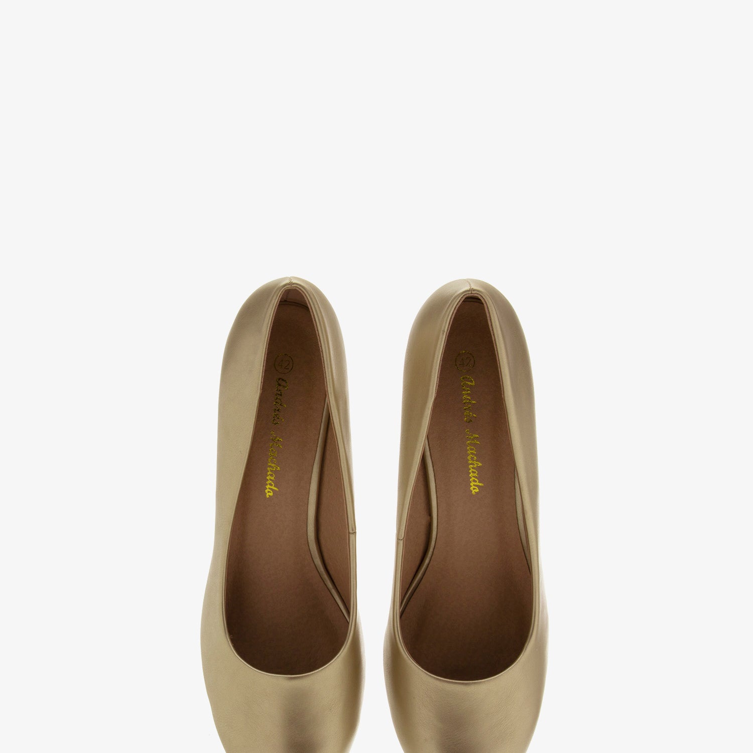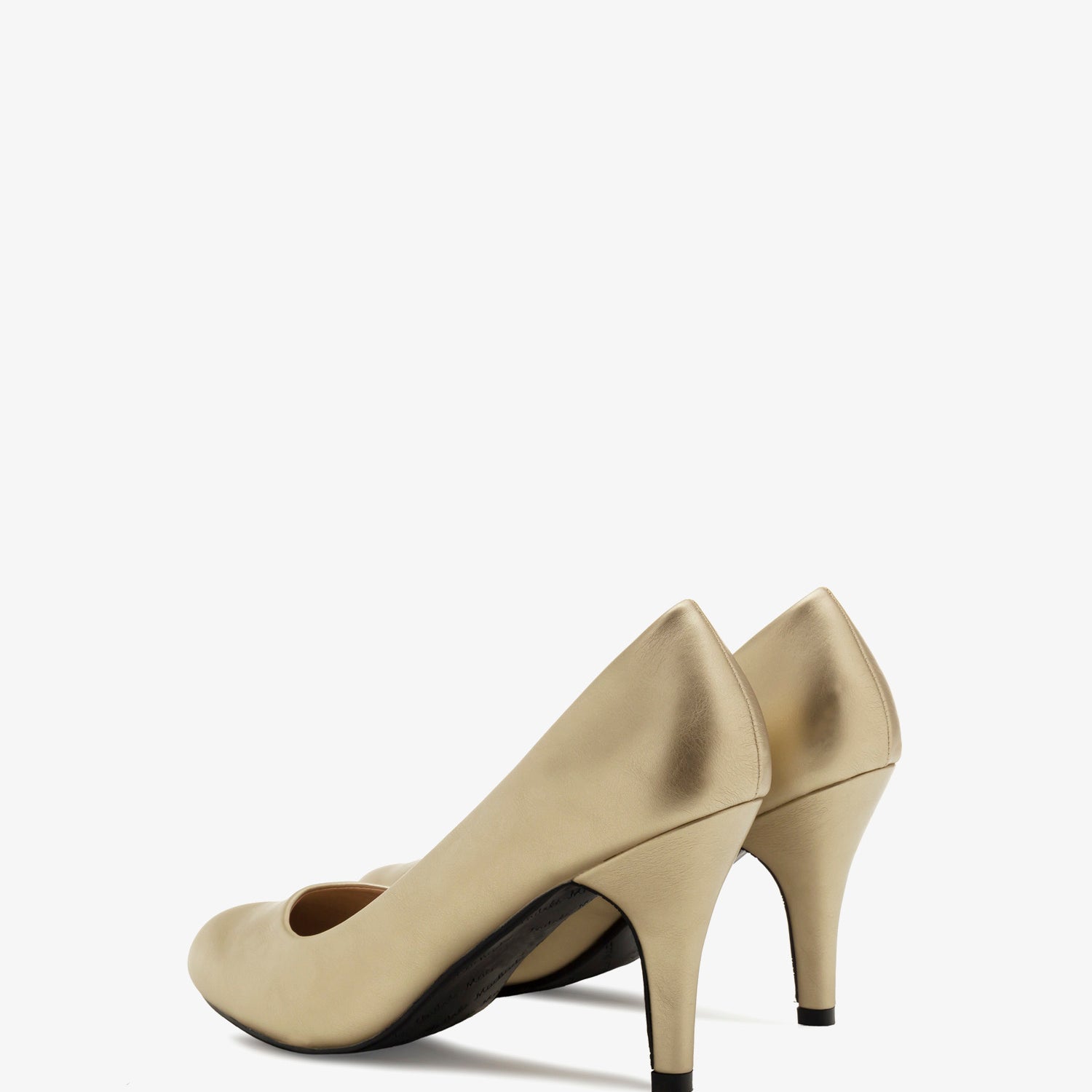 Klassische Lounge in sanftem Gold. Klassischer Leisten und Absatz. Abgerundete Spitze und schmaler Absatz, für alle Größen in der gleichen Farbe gefüttert. Kleine Größen von 32 bis 35 mit 9 cm Absatz. Mittlere Größen von 36 bis 41 mit 9,5 cm Absatz. Übergrößen von 42 bis 46 mit 10 cm Absatz. Dieses Modell fällt klein aus, es wird empfohlen, eine Nummer größer als üblich zu nehmen.
