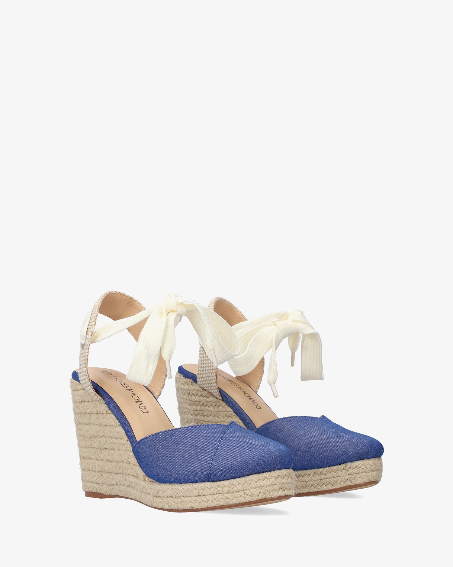 Espadrilles mit Keilabsatz aus jeansblauem Stoff. Rückenfreies Design mit einem in den Rückengurt eingenähten Fadenband. Runde, geschlossene Spitze mit genähten und gekreuzten Fadendetails auf der Vorderseite. Verschluss mit breiten weißen Schnürsenkeln am Knöchel. Keilabsätze und Plateau vorne aus Jute. 10,5 cm Keilabsatz und 2,5 cm Plateau für die kleinen Größen 32 bis 35. 12 cm Keilabsatz und 2,5 cm Plateau für die großen Größen 42 bis 45