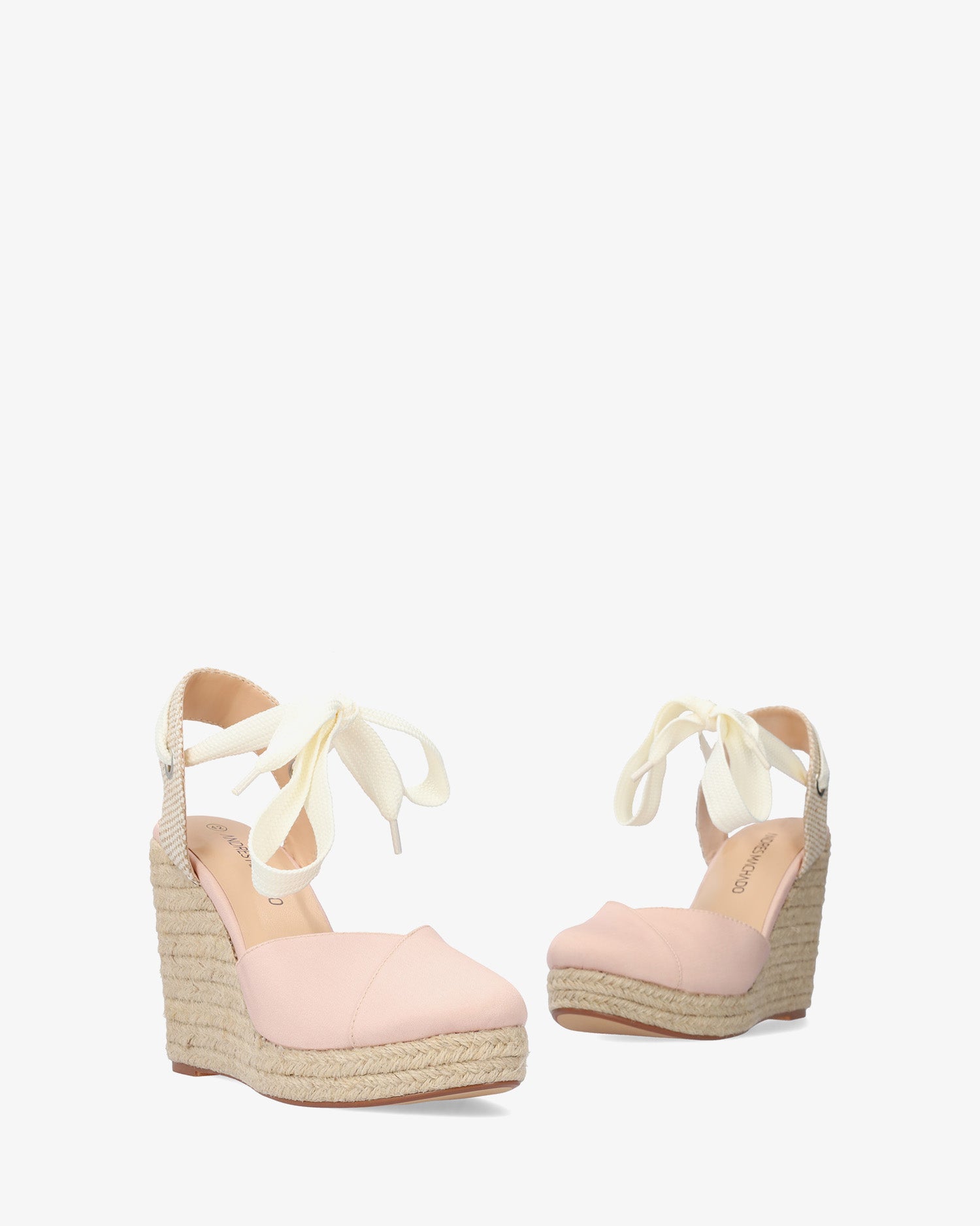 Espadrilles mit Keilabsatz aus Stoff in der Farbe Makeup. Rückenfreies Design mit einem in den Rückengurt eingenähten Fadenband. Runde, geschlossene Spitze mit genähten und gekreuzten Fadendetails auf der Vorderseite. Verschluss mit breiten weißen Schnürsenkeln am Knöchel. Keilabsätze und Plateau vorne aus Jute. 10,5 cm Keilabsatz und 2,5 cm Plateau für die kleinen Größen 32 bis 35. 12 cm Keilabsatz und 2,5 cm Plateau für die großen Größen 42 bis 45.