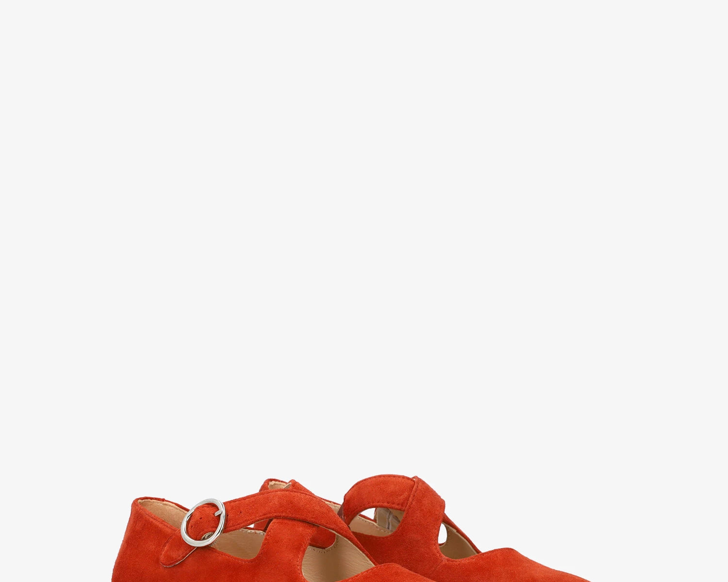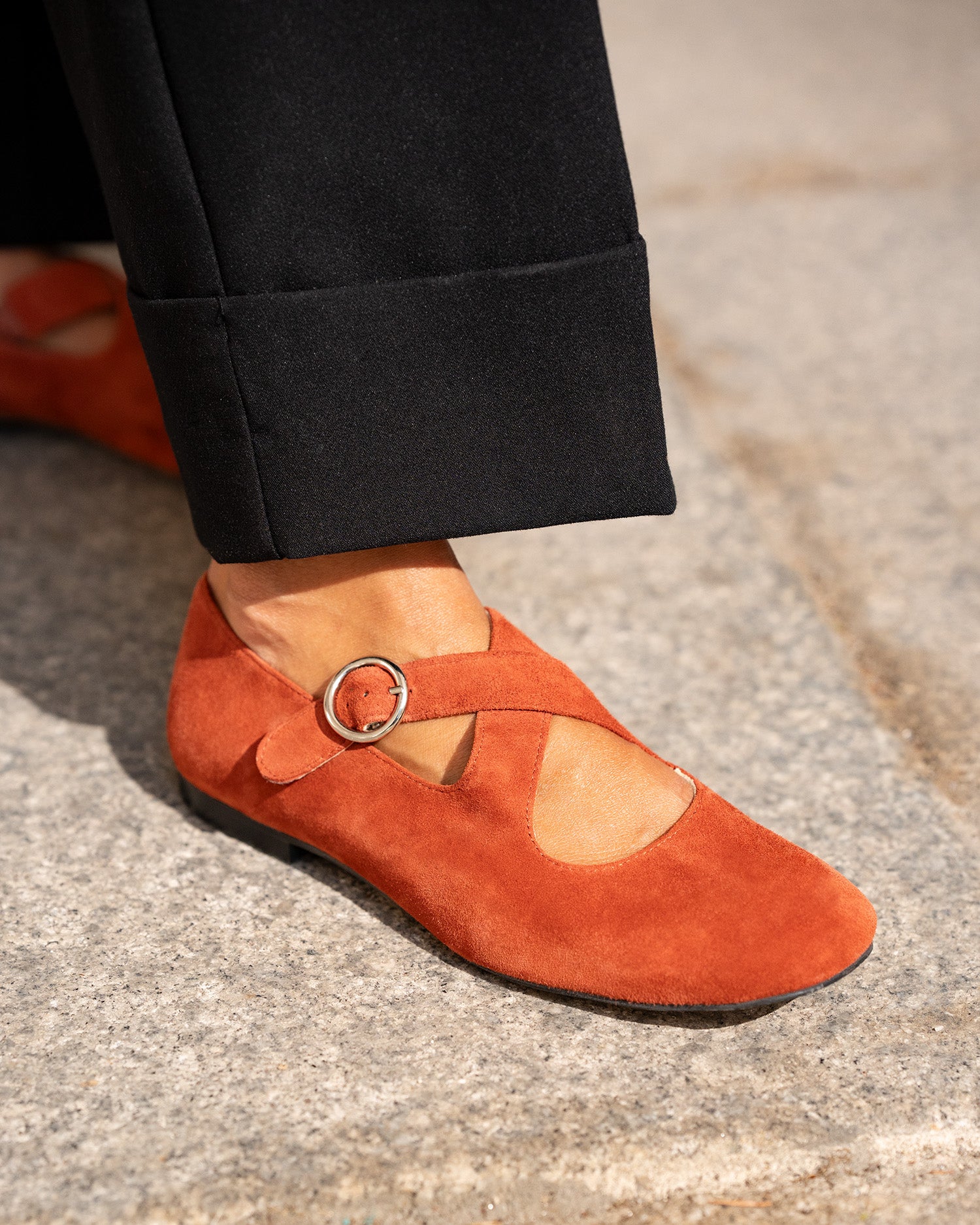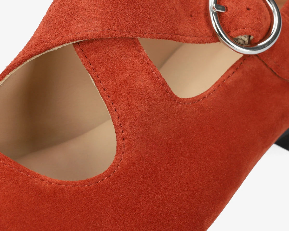 Flache Ballerina aus Veloursleder. Mit eckiger Spitze, zwei breiten, farblich abgestimmten, über dem Spann gekreuzten Riemen und seitlichem Schnallenverschluss. Erhältlich in kleinen Größen von 32 bis 35 und in großen Größen von 42 bis 45. Hergestellt in Spanien.