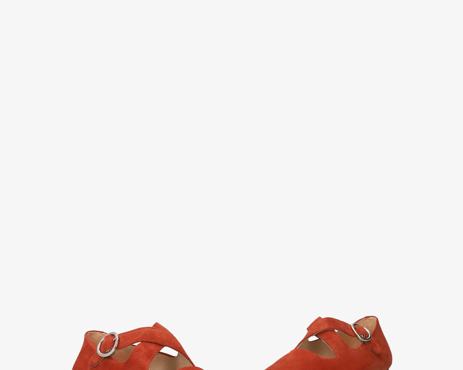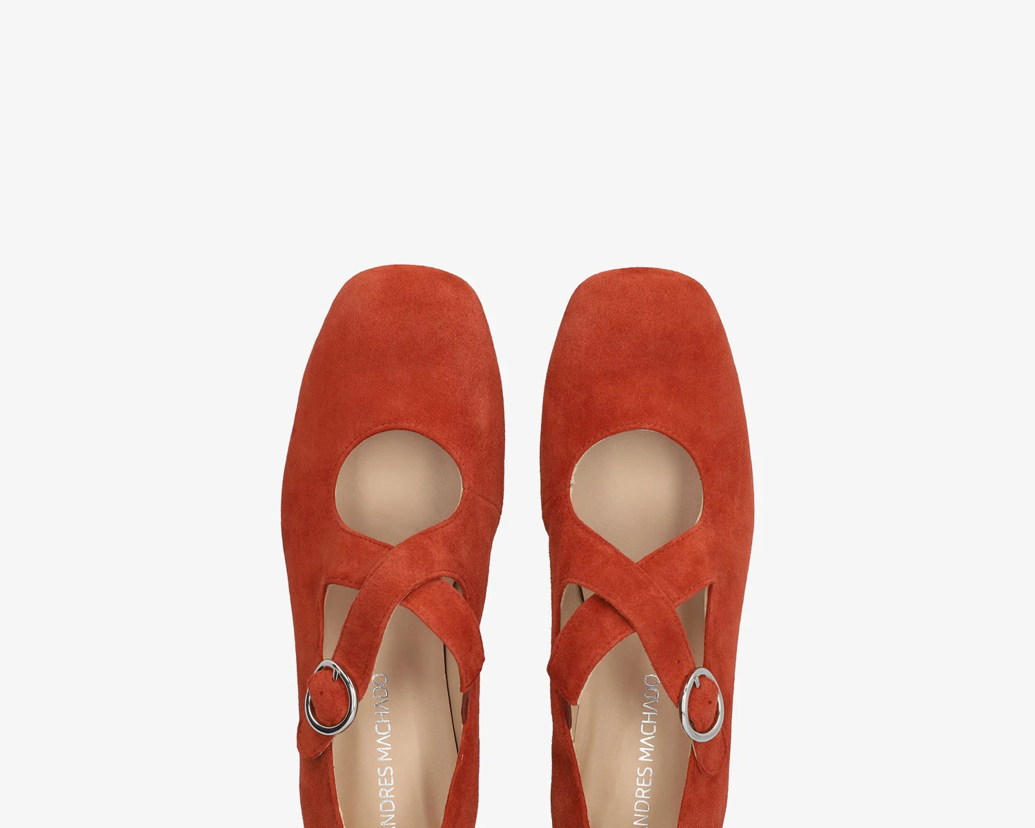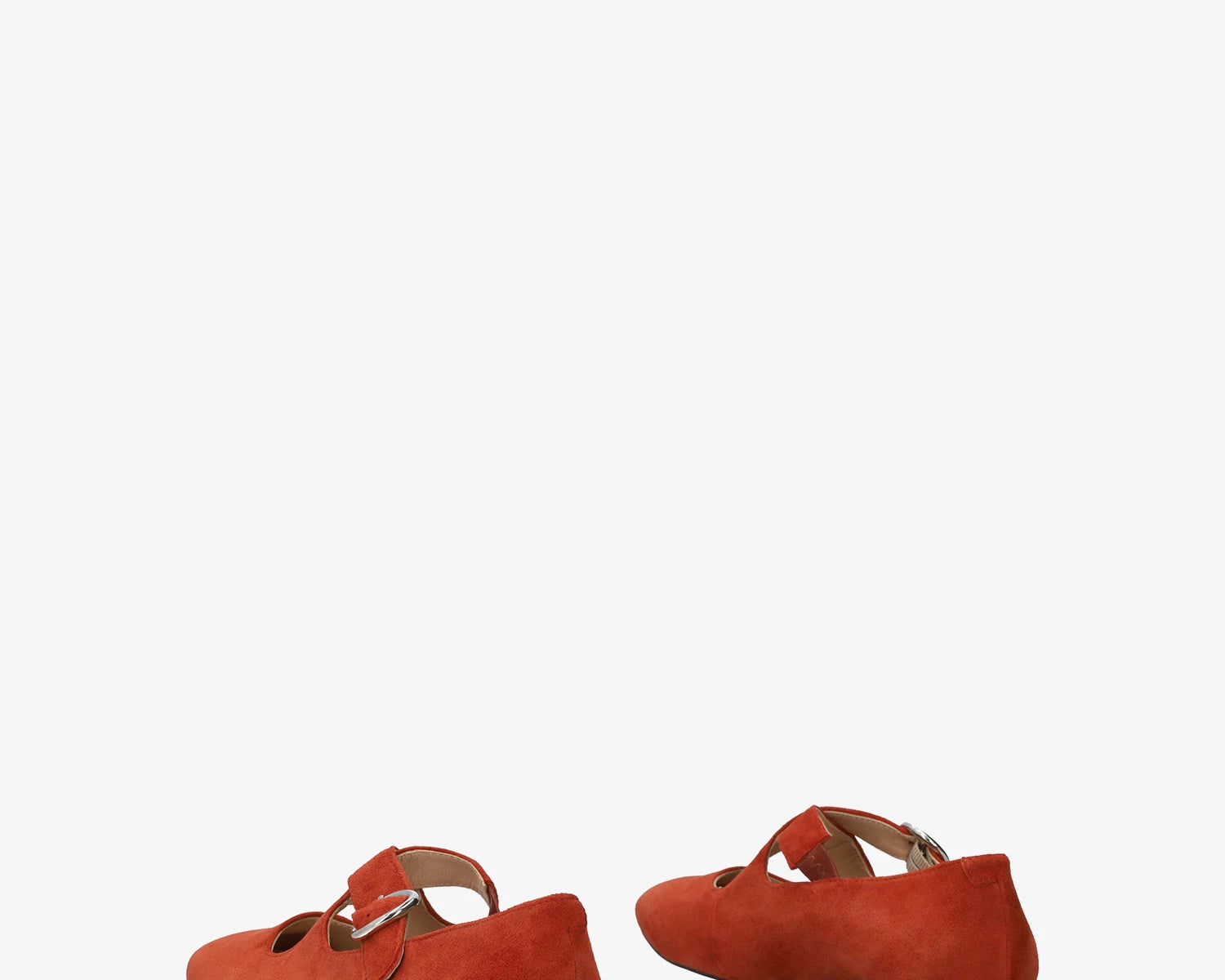 Flache Ballerina aus Veloursleder. Mit eckiger Spitze, zwei breiten, farblich abgestimmten, über dem Spann gekreuzten Riemen und seitlichem Schnallenverschluss. Erhältlich in kleinen Größen von 32 bis 35 und in großen Größen von 42 bis 45. Hergestellt in Spanien.