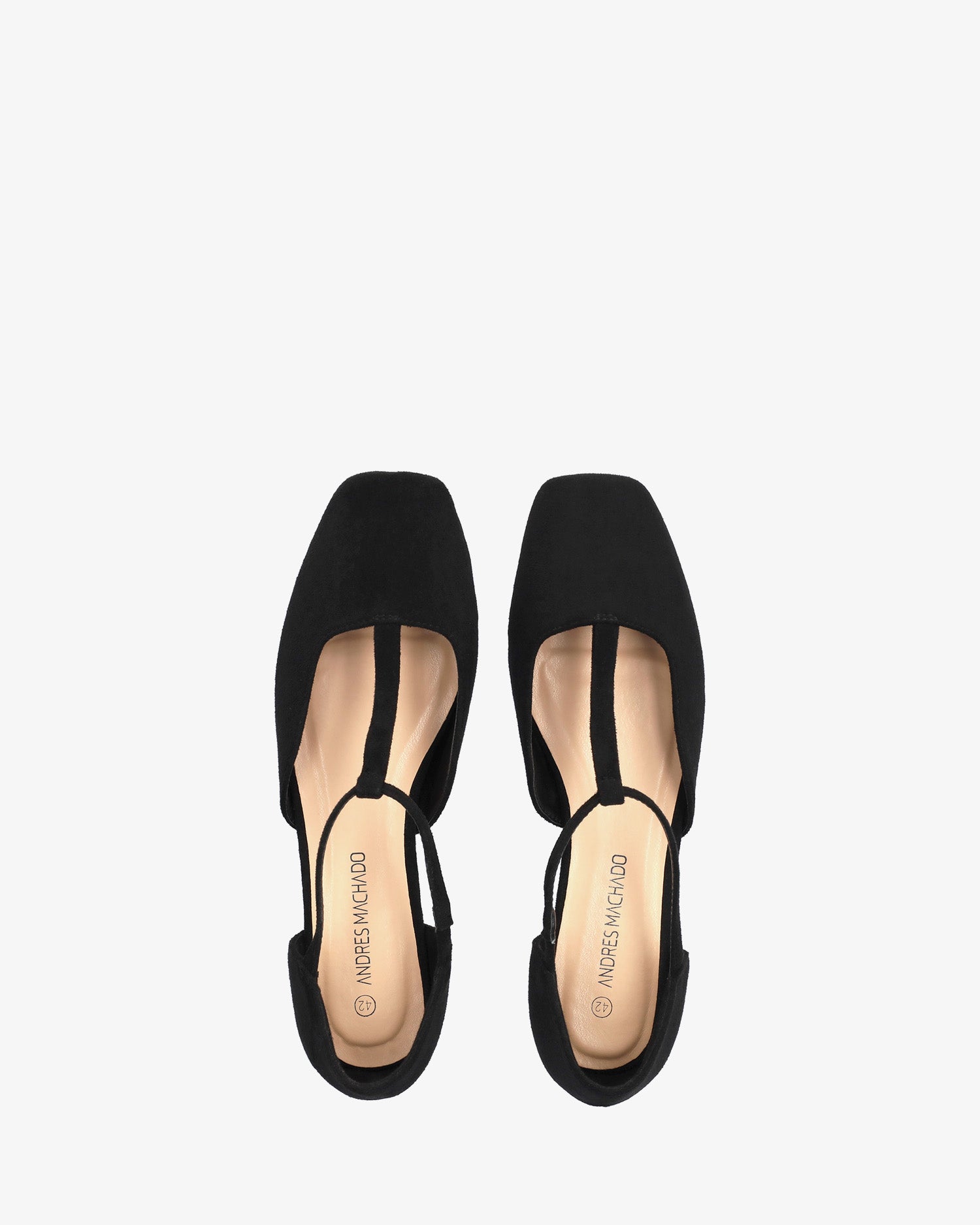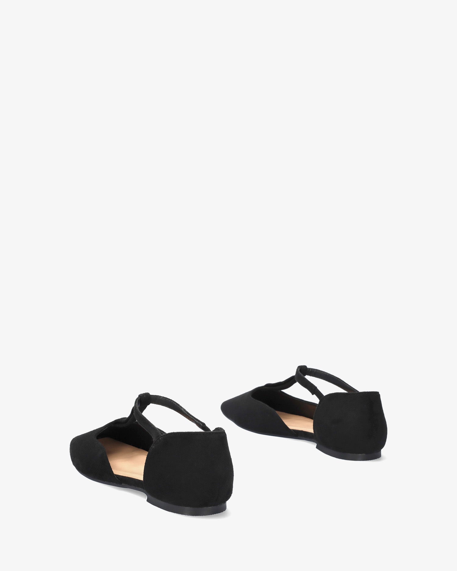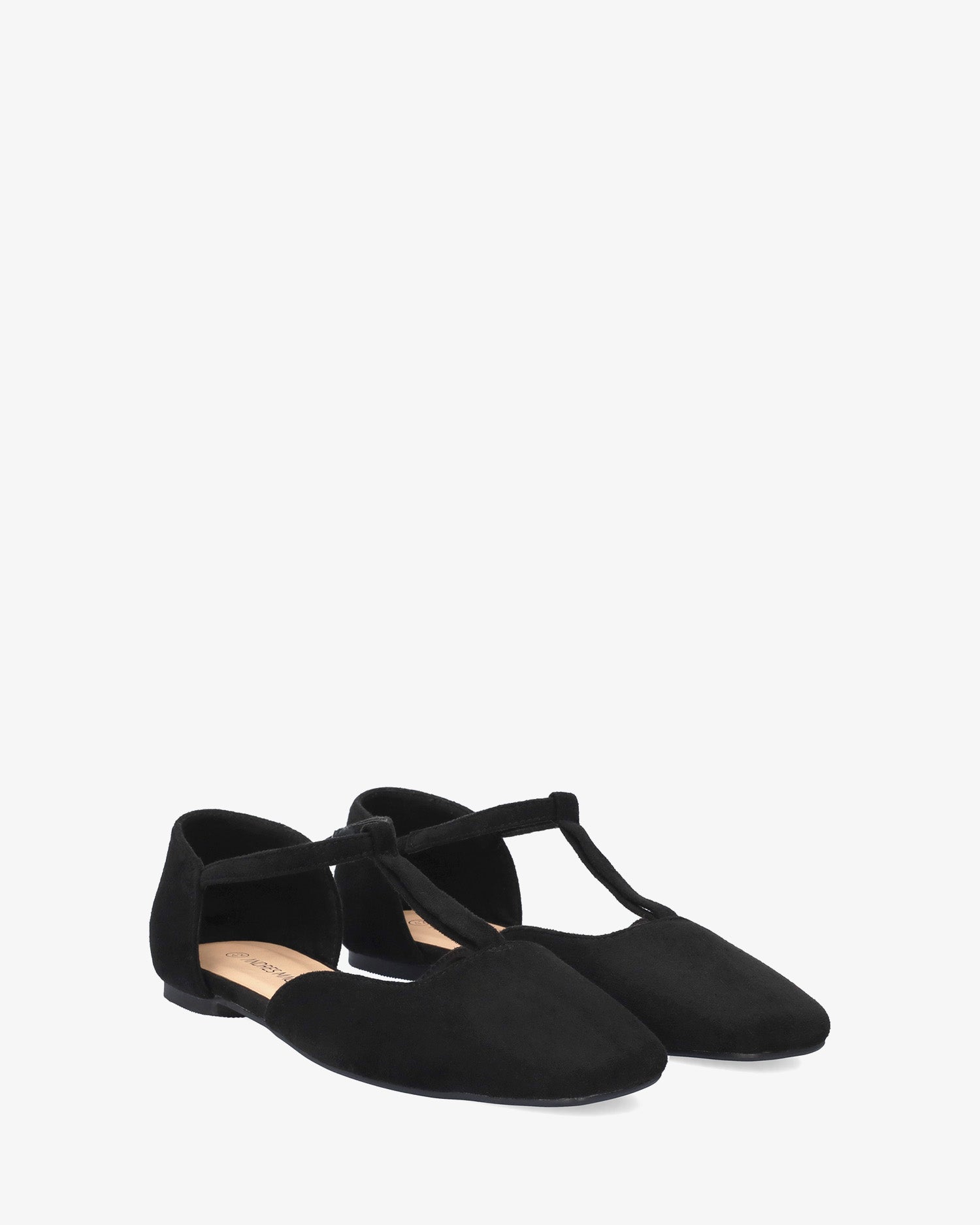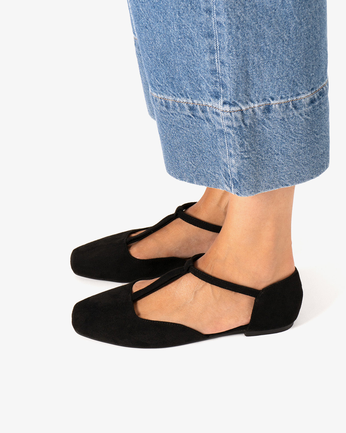 Flacher Ballerina aus Wildlederimitat in Schwarz. Das Design wird durch eine geschlossene quadratische Spitze abgerundet, mit einem umgedrehten T-förmigen Mittelriemen über dem Spann mit Gummizug für besseren Halt des Knöchels. Erhältlich in den großen Größen 42 bis 46.
