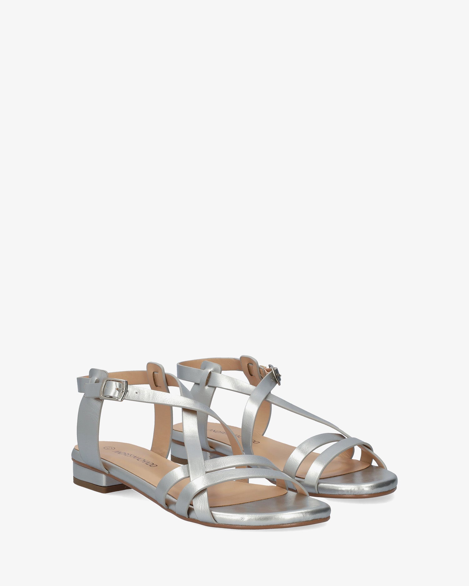 Flache Sandalen in sanftem Silberton. Design mit zwei Riemen auf der Vorderseite und zwei gekreuzten Riemen in einem umgekehrten V auf dem Spann, abgerundet mit einem seitlichen Schnallenverschluss. Abgerundete offene Spitze. Große Größen von 42 bis 45.