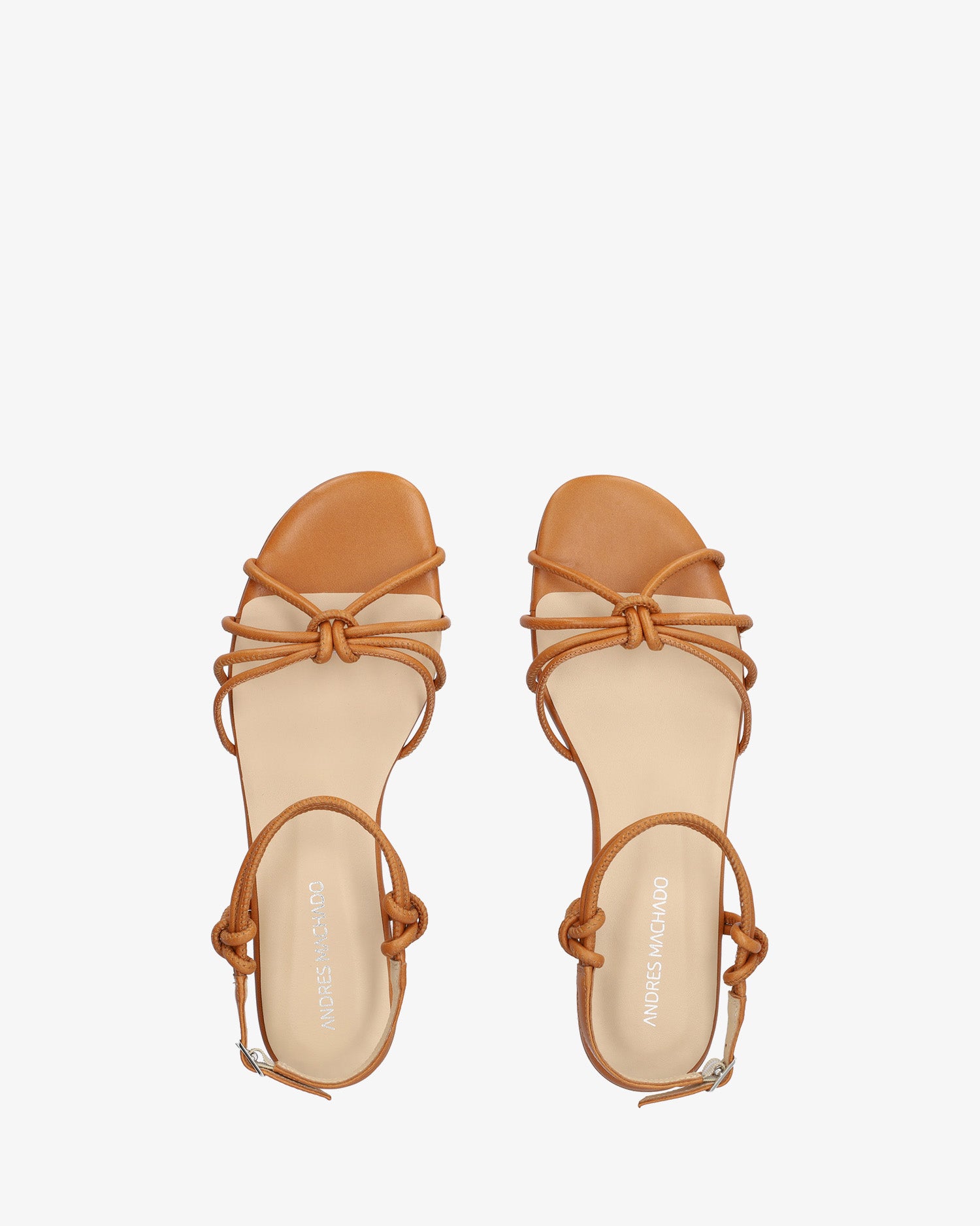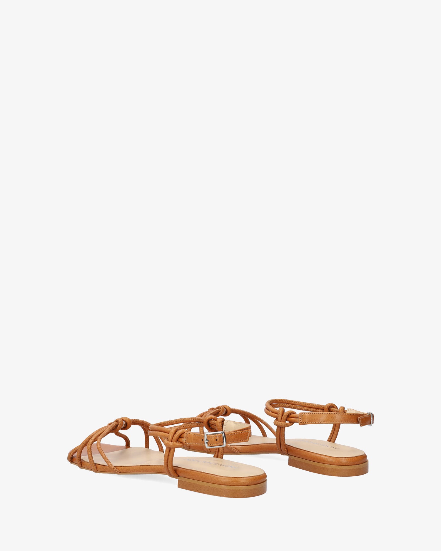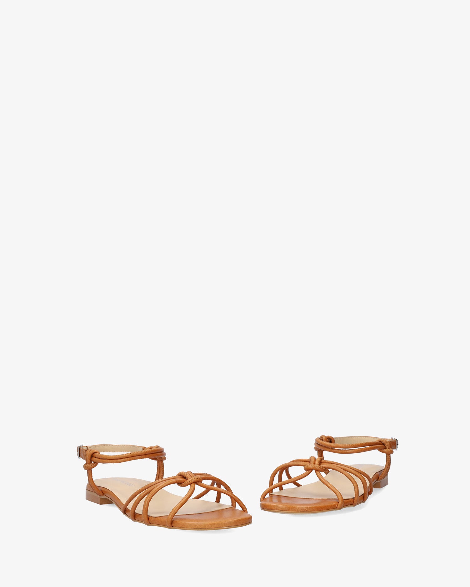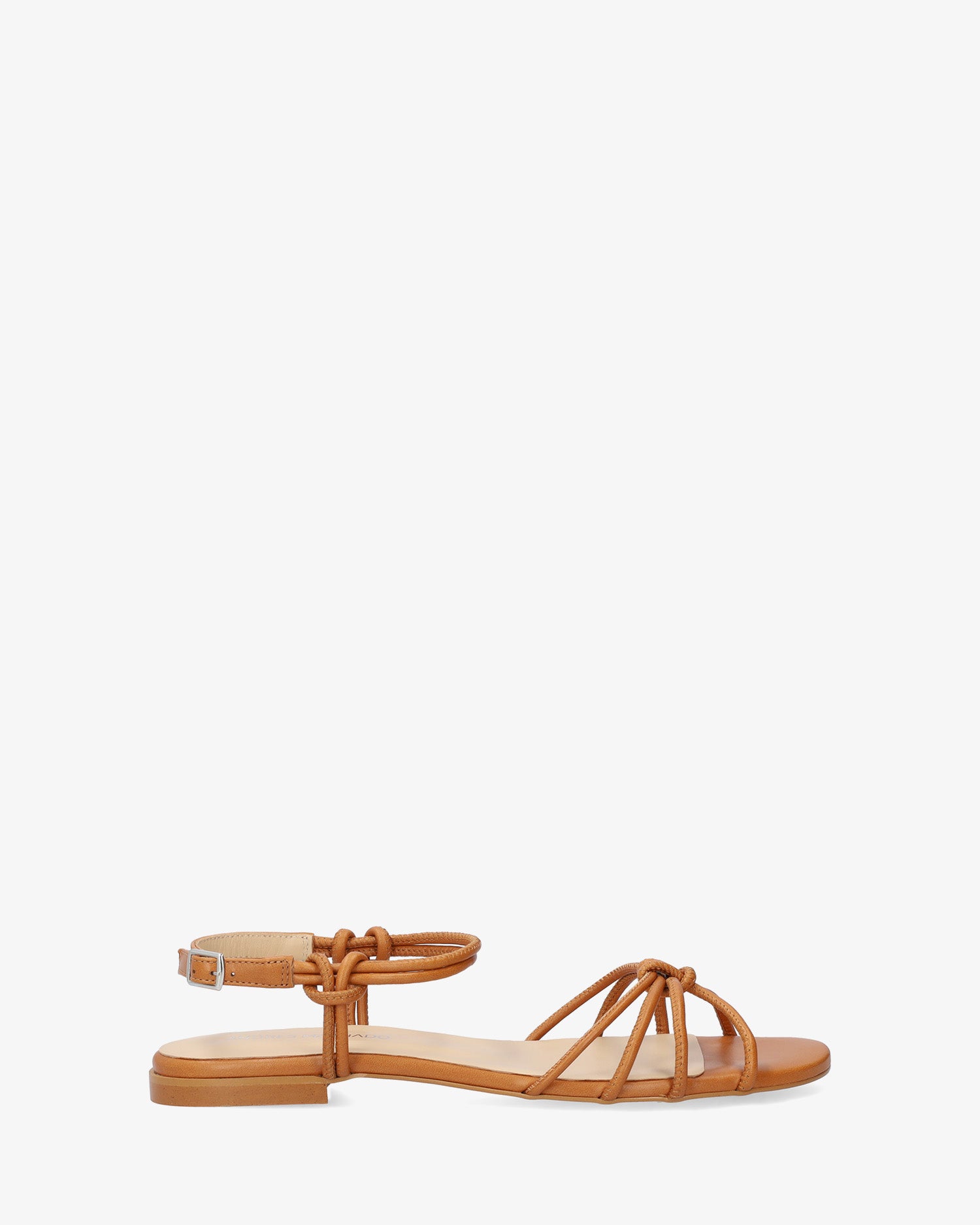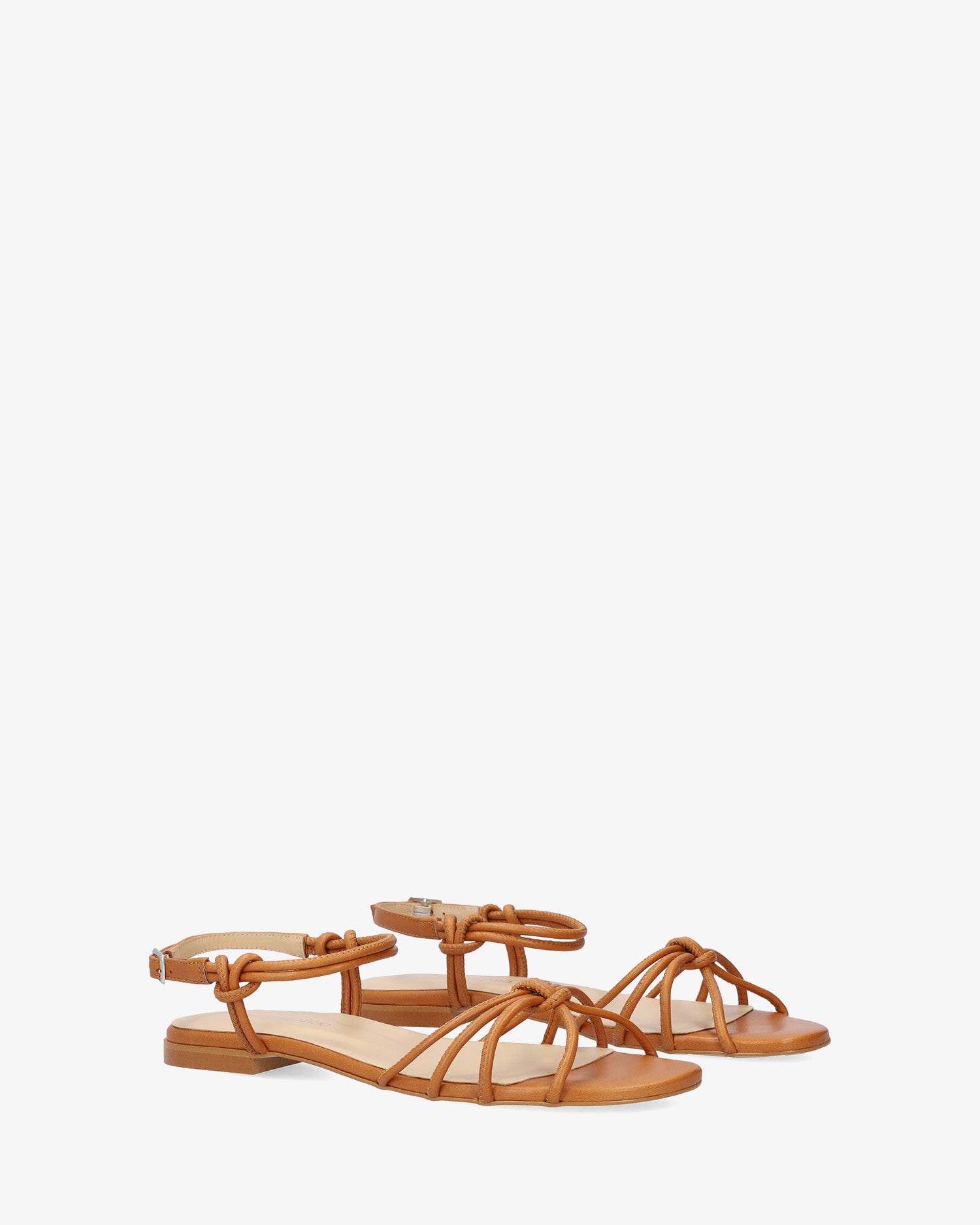 Flache Sandalen aus hellbraunem Leder. Schlauchförmiges Riemendesign, vorne geknotet. Seitlicher Schnallenverschluss mit Knöchelriemen, der mit Schlauchbändern gebunden wird. Mit abgerundeter und offener Spitze. 2 cm Absatz für kleine Größen 32 bis 35. 2 cm Absatz für große Größen 42 bis 45. Hergestellt in Spanien