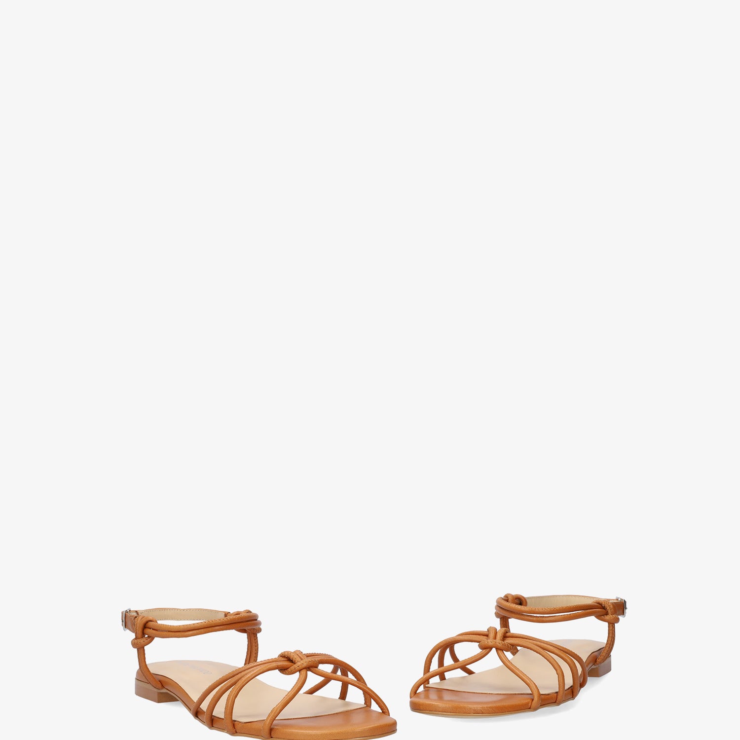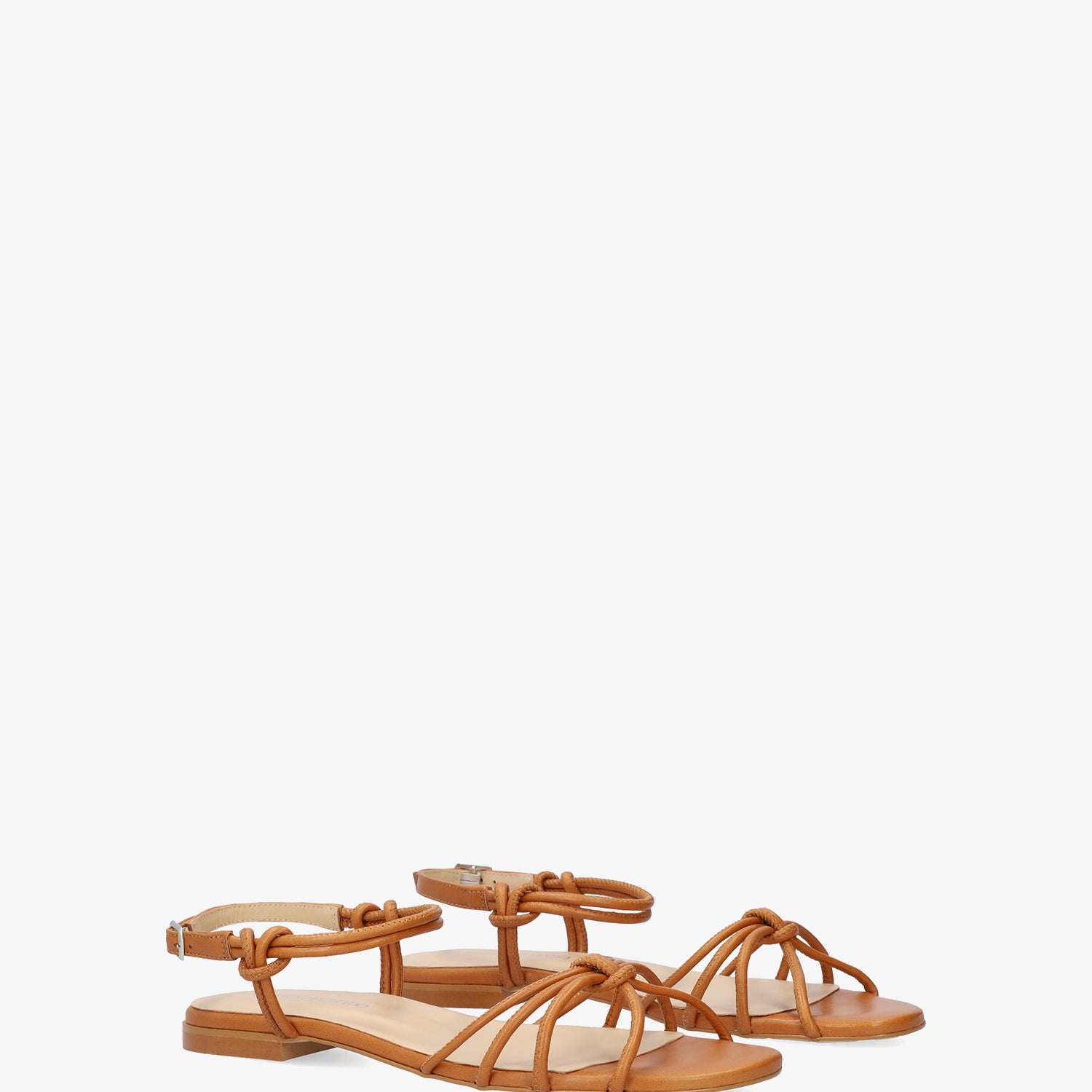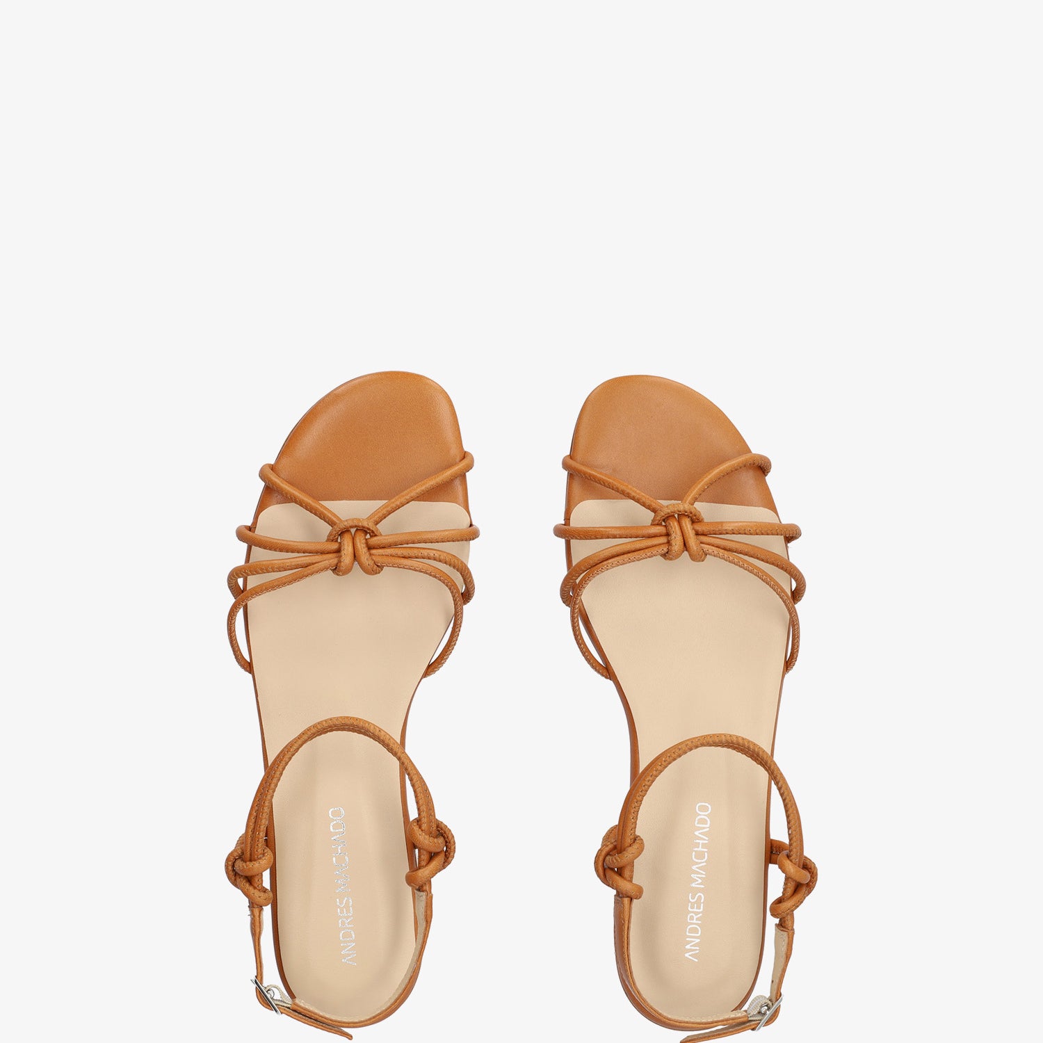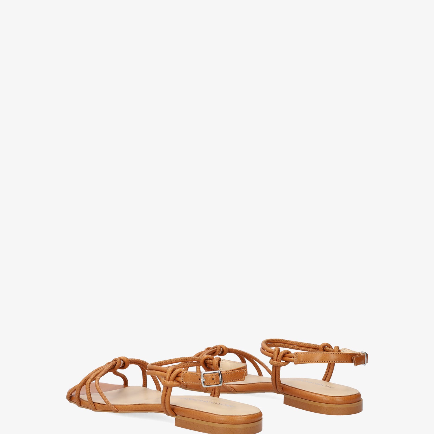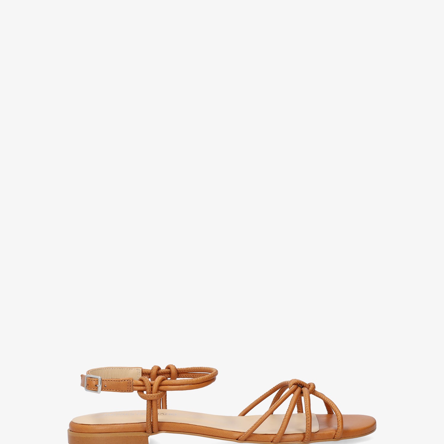 Flache Sandalen aus hellbraunem Leder. Schlauchförmiges Riemendesign, vorne geknotet. Seitlicher Schnallenverschluss mit Knöchelriemen, der mit Schlauchbändern gebunden wird. Mit abgerundeter und offener Spitze. 2 cm Absatz für kleine Größen 32 bis 35. 2 cm Absatz für große Größen 42 bis 45. Hergestellt in Spanien