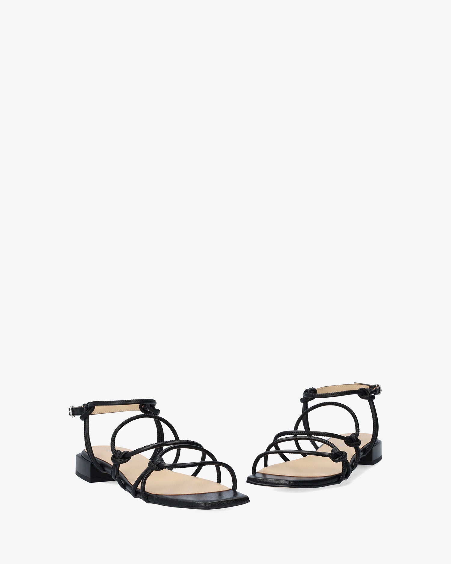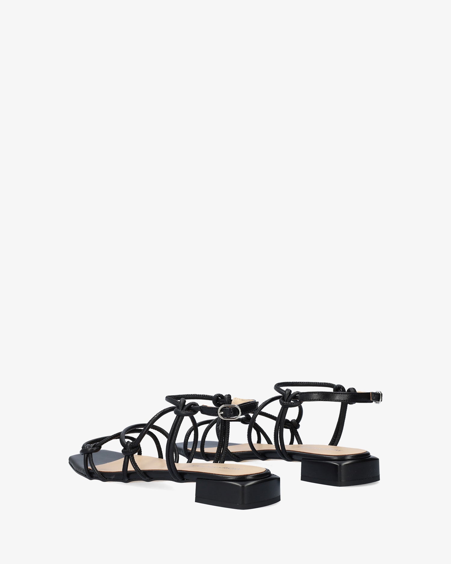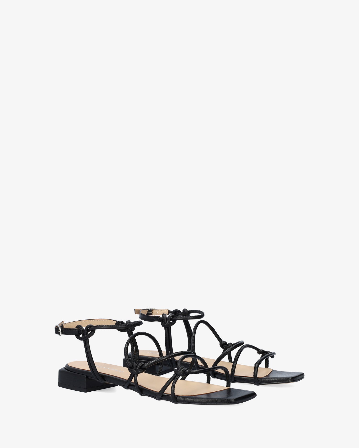 Flache Sandalen aus schwarzem Leder. Schlauchförmiges Riemendesign, das seitlich am Spann geknotet ist. Seitlicher Schnallenverschluss mit Knöchelriemen, der mit Schlauchbändern gebunden wird. Mit quadratischer und offener Spitze. 2,5 cm quadratischer Blockabsatz für kleine Größen 32 bis 35. 2,5 cm Absatz für mittlere Größen 36 bis 41. 3 cm Absatz für große Größen 42 bis 45. Hergestellt in Spanien