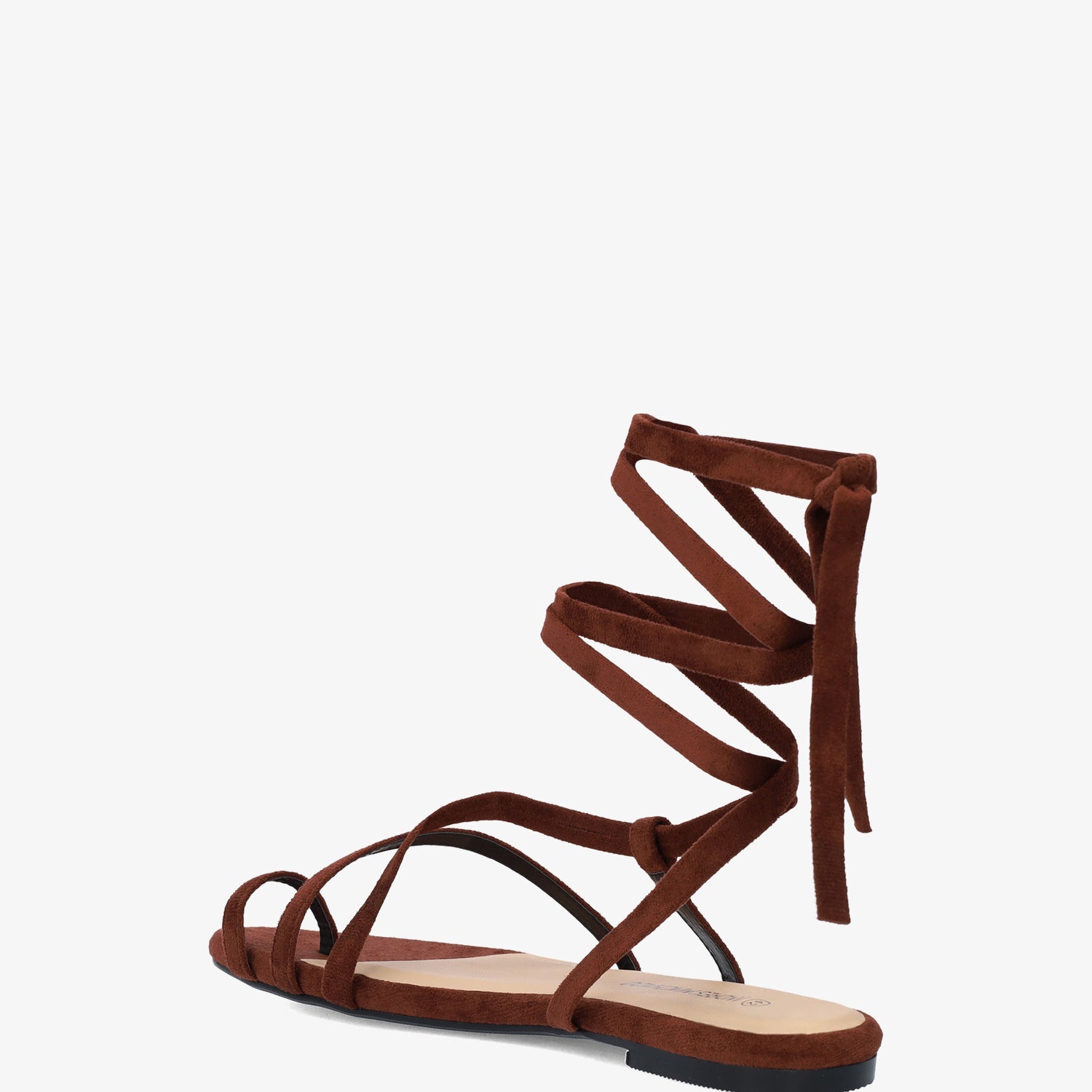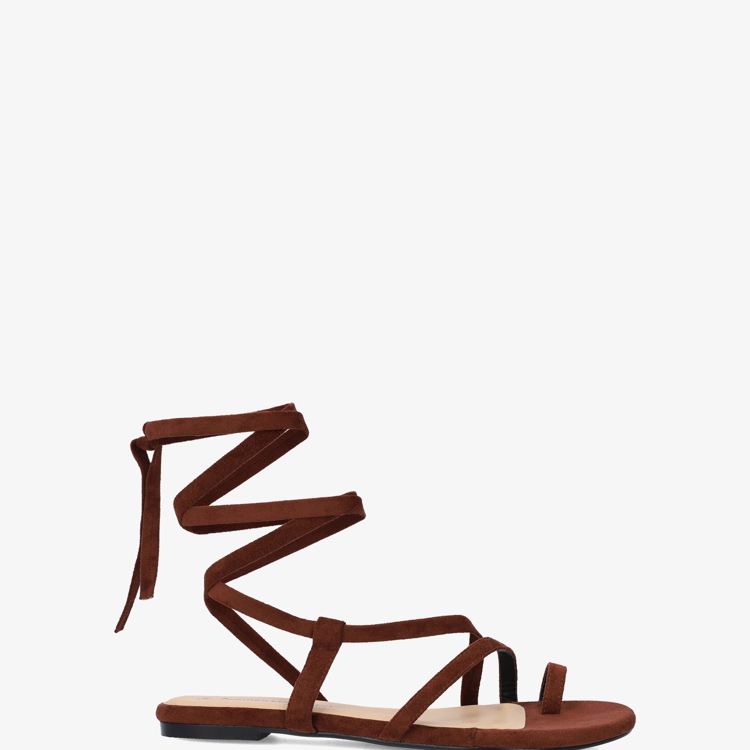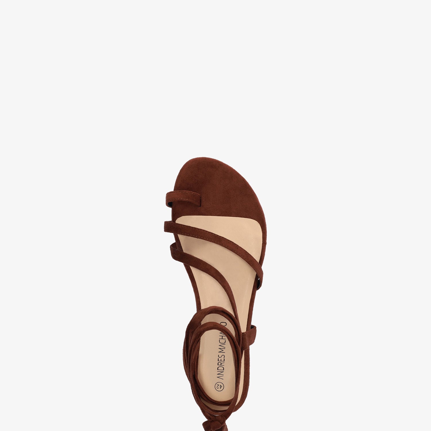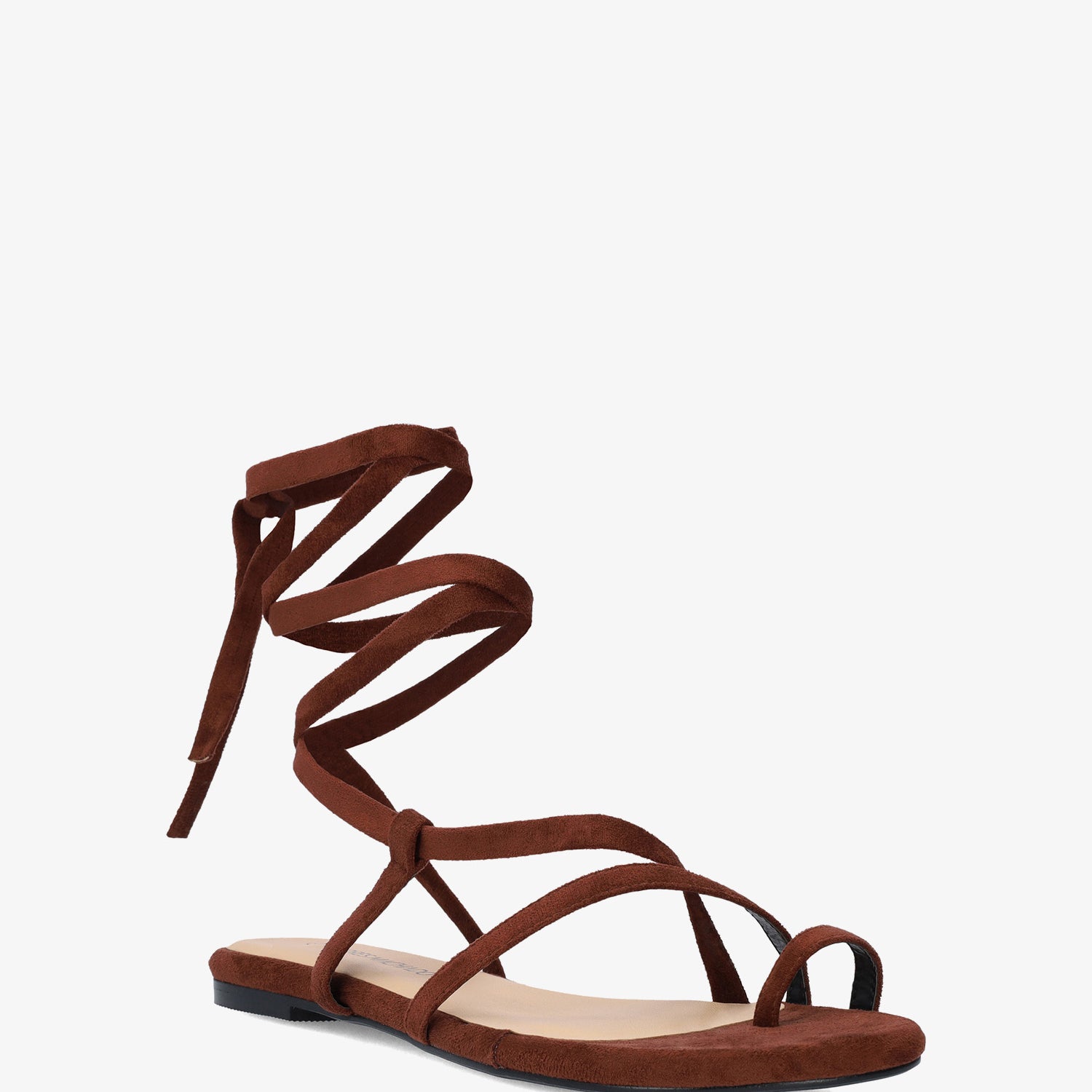 Flache Sandale aus braunem Wildleder mit einem Leisten in Sonderbreite. Slingback-Design mit Zehenriemen und passenden überkreuzten Riemen auf dem Spann. Schnürverschluss im gleichen Ton um den Knöchel gebunden. Abgerundete und offene Spitze. Große Größen von 42 bis 45.