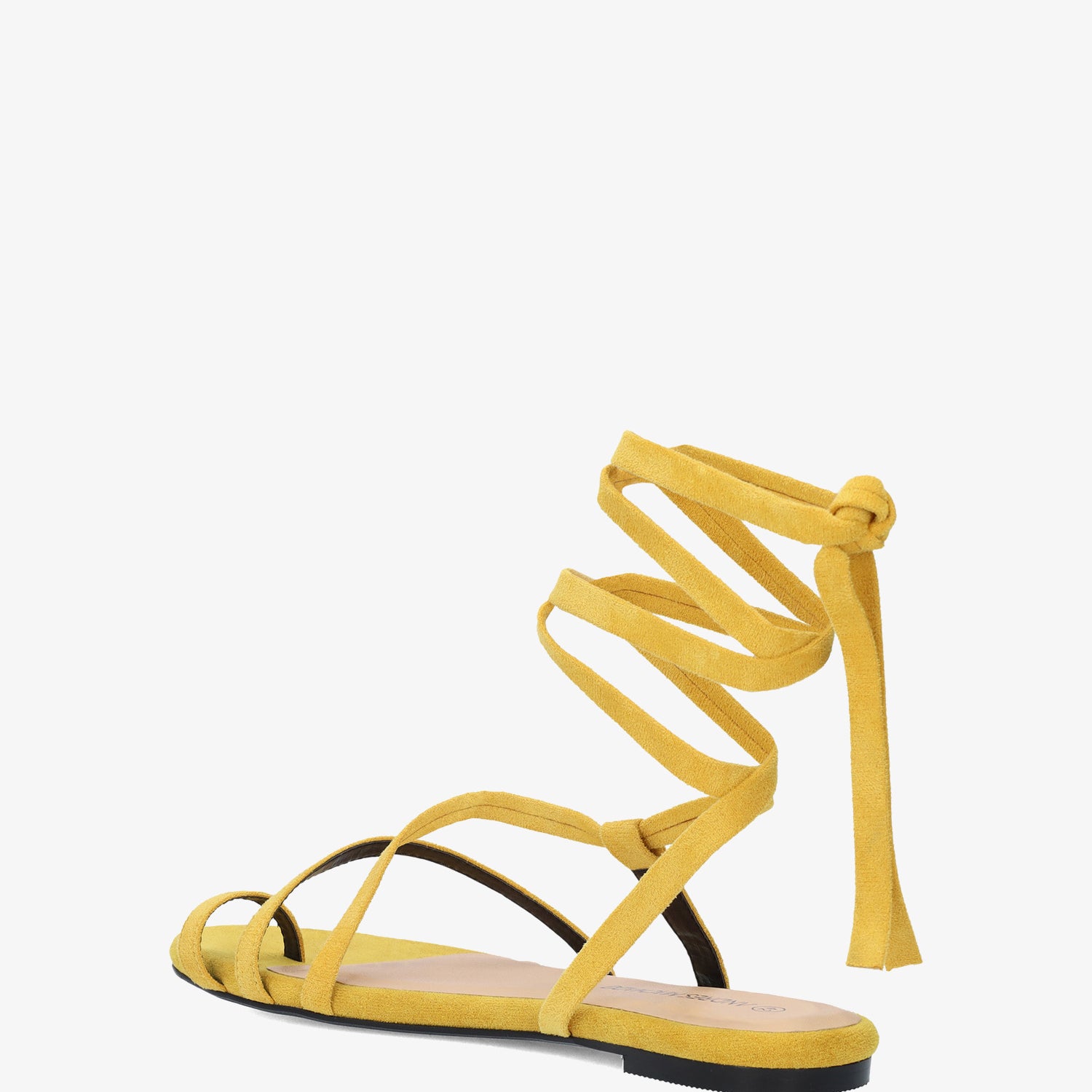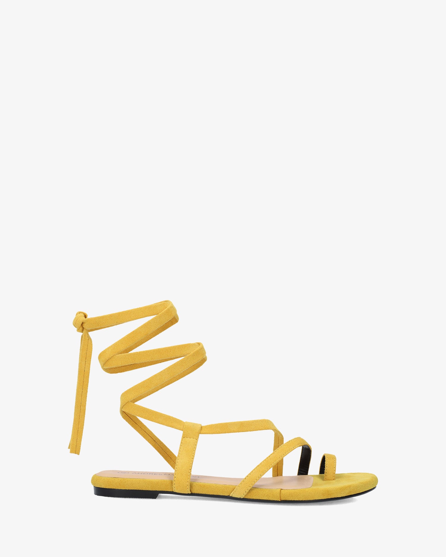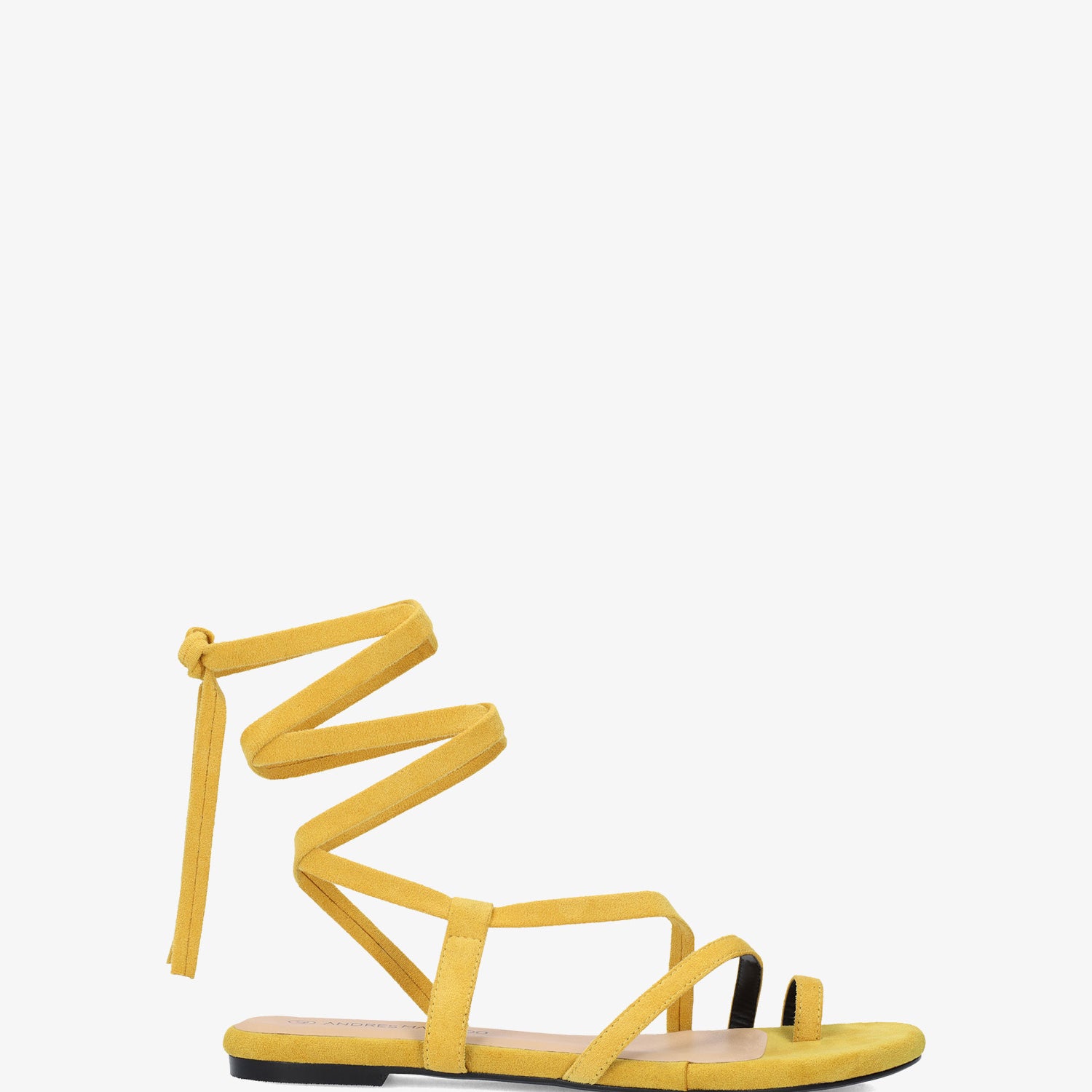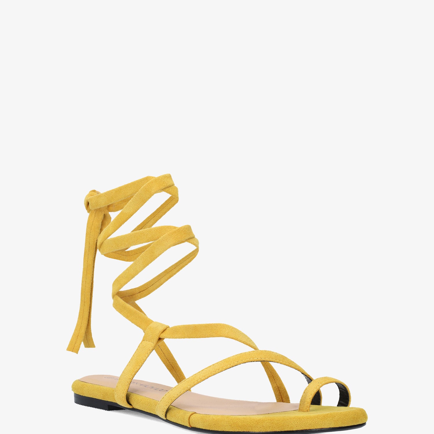 Flache Sandale aus senffarbenem Wildleder mit einem Leisten in Sonderbreite. Slingback-Design mit Zehenriemen und passenden überkreuzten Riemen auf dem Spann. Schnürverschluss im gleichen Ton um den Knöchel gebunden. Abgerundete und offene Spitze. Große Größen von 42 bis 45.