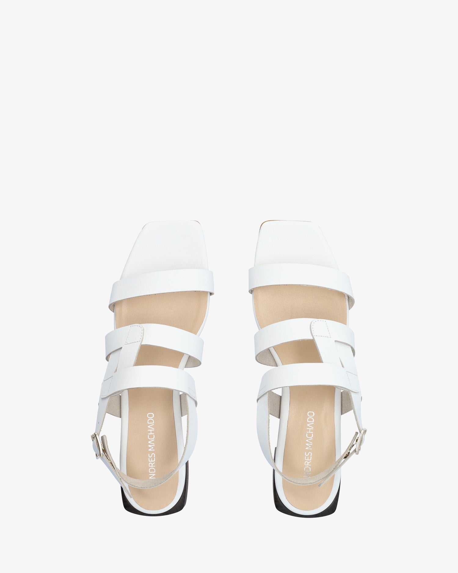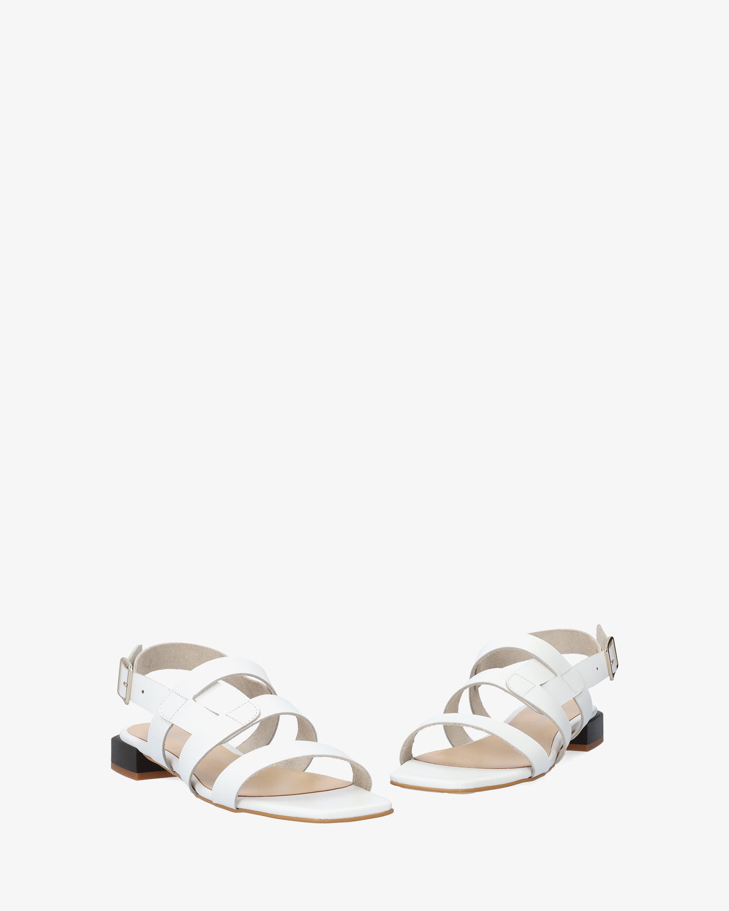 Flache Sandalen aus weißem Leder. Design mit einem dünnen Riemen an der Spitze und zwei parallelen, ineinander verschlungenen Riemen auf dem Spann mit einem Metallschnallenverschluss. Mit quadratischer und offener Spitze. 2,5 cm Blockabsatz in Holzoptik für die kleinen Größen 32 bis 35. 2,5 cm Absatz für die mittleren Größen 36 bis 41. 3 cm Absatz für die großen Größen 42 bis 45. Hergestellt in Spanien