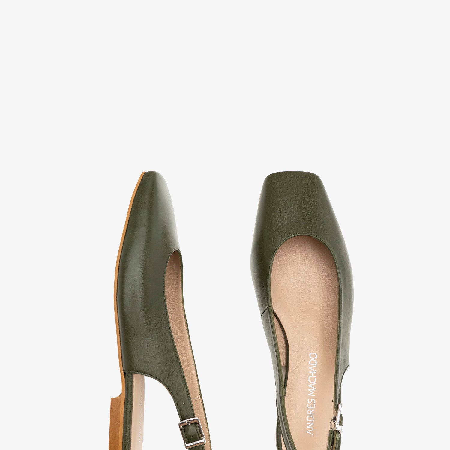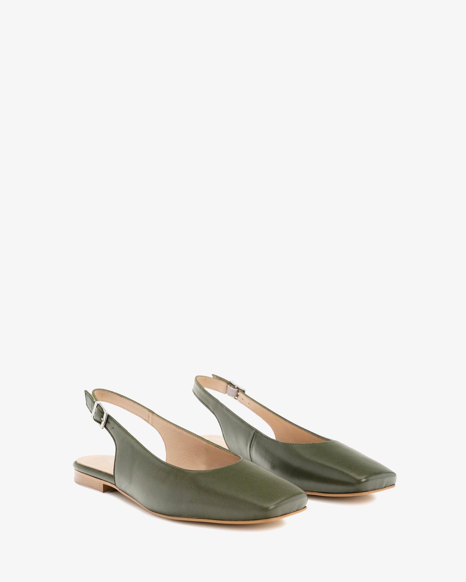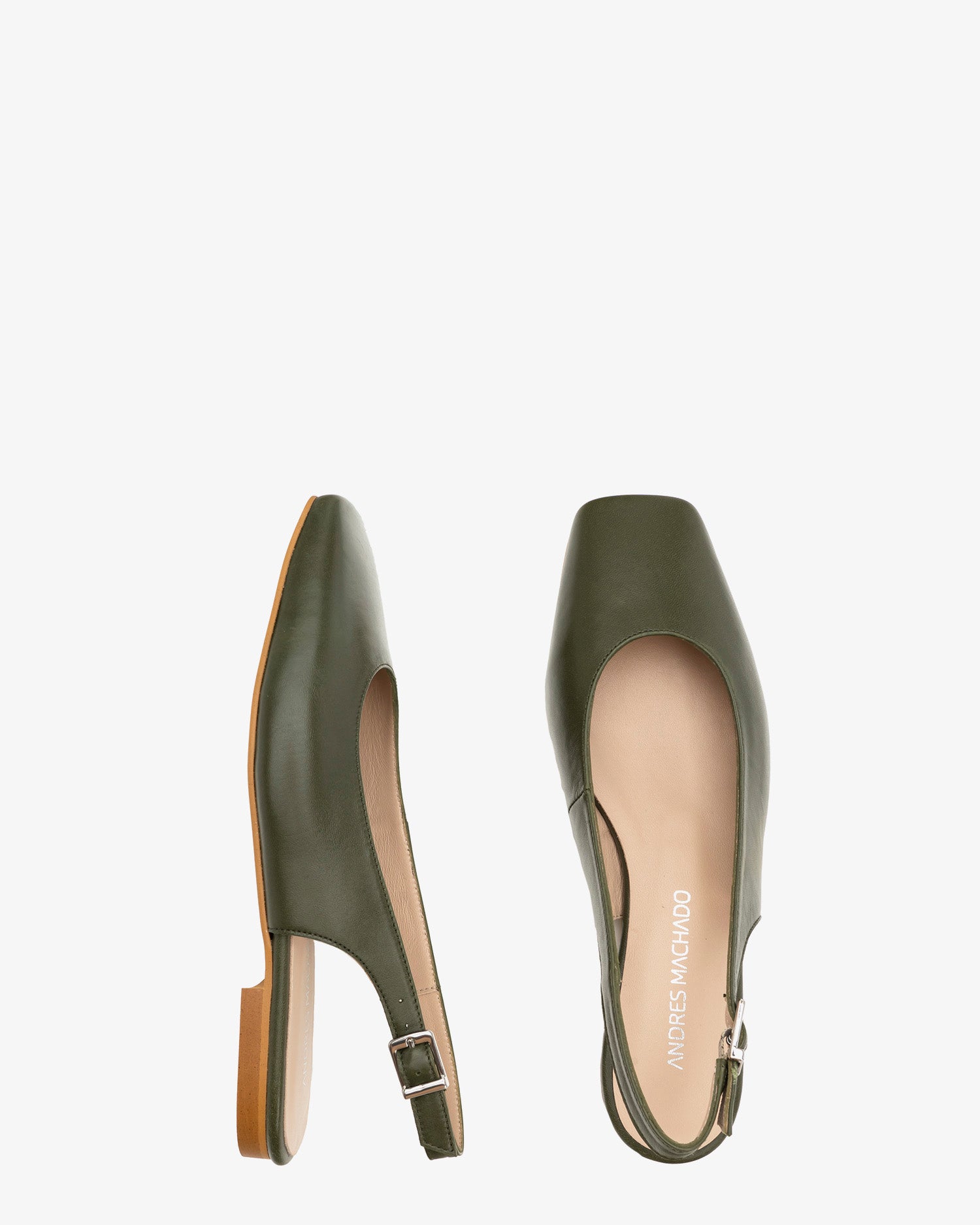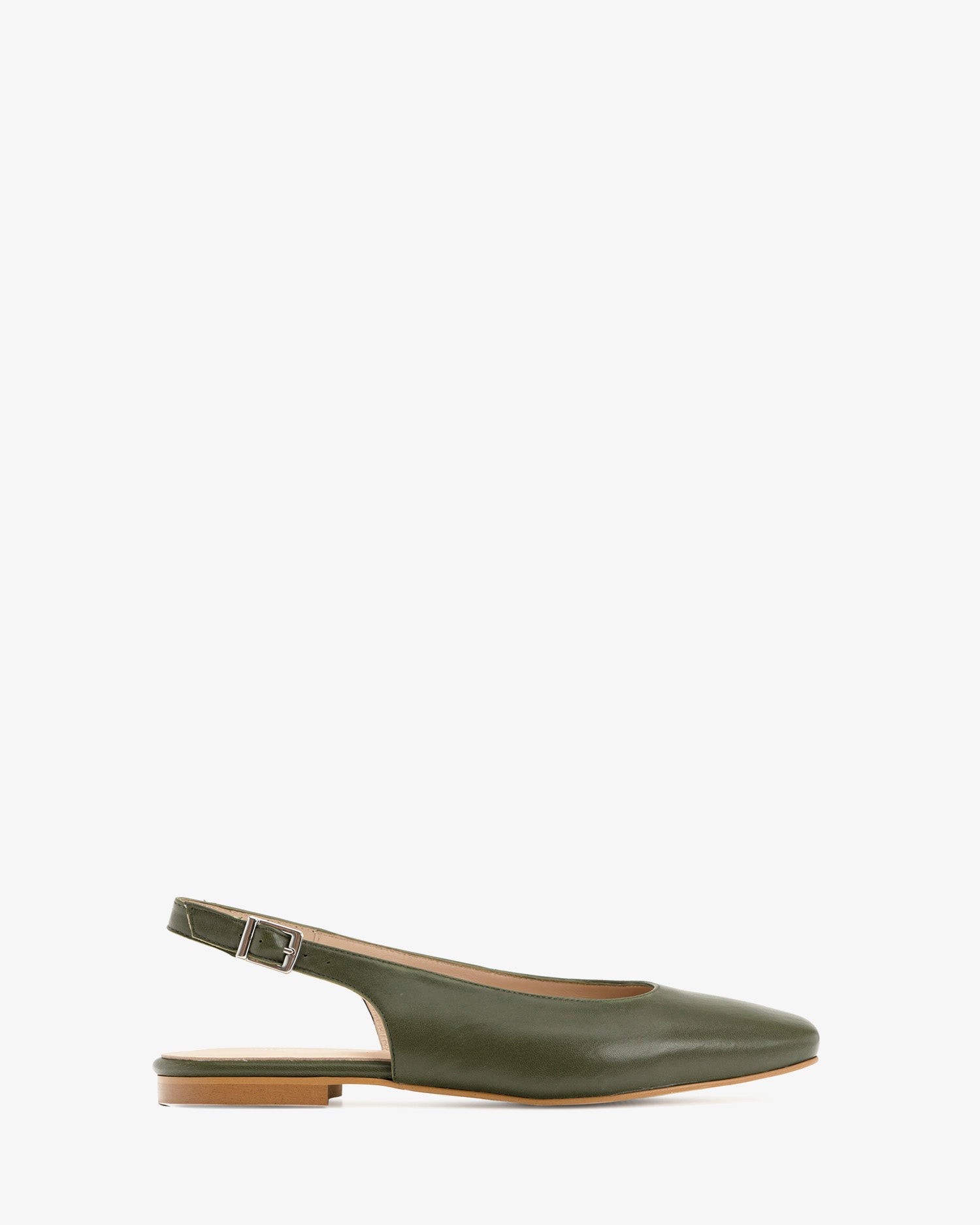 Ballerina aus glattem Khakileder. Slingback-Design mit Schnallenverschluss. Innenfutter aus beigefarbenem Leder. Quadratische Zehenpartie. Alle Größen von 32 bis 45. Hergestellt in Spanien.