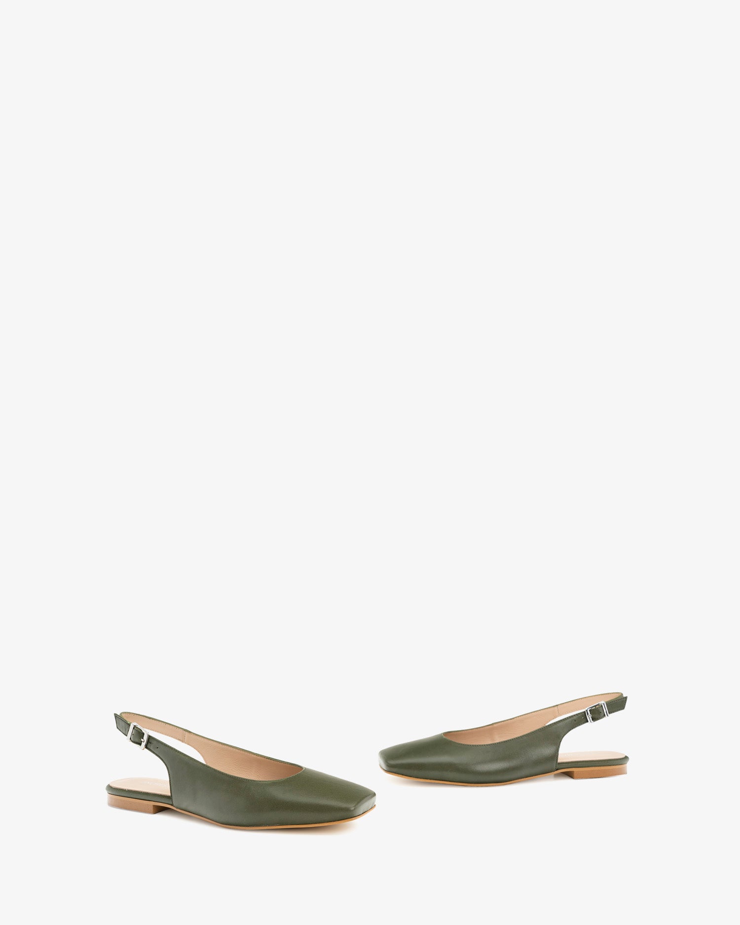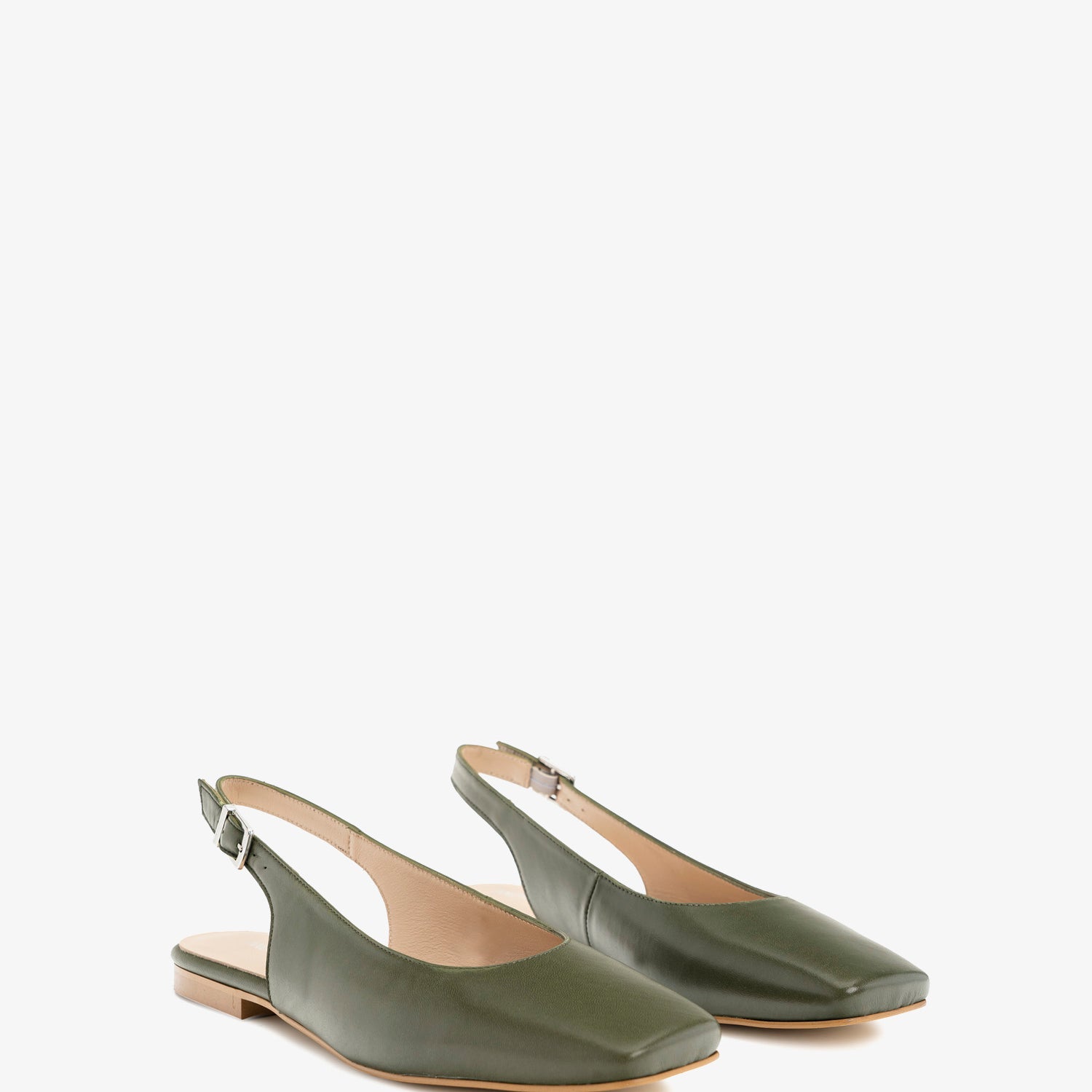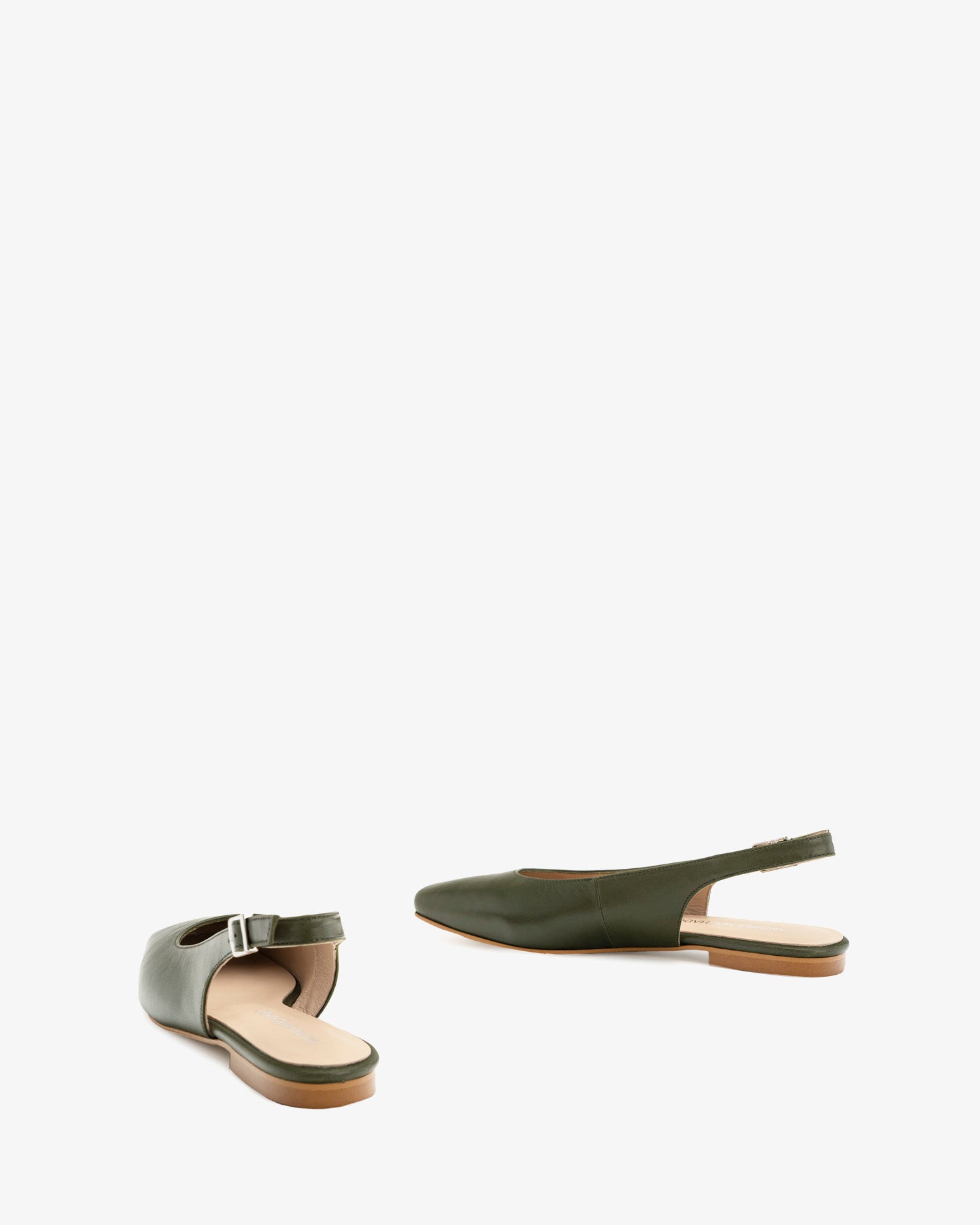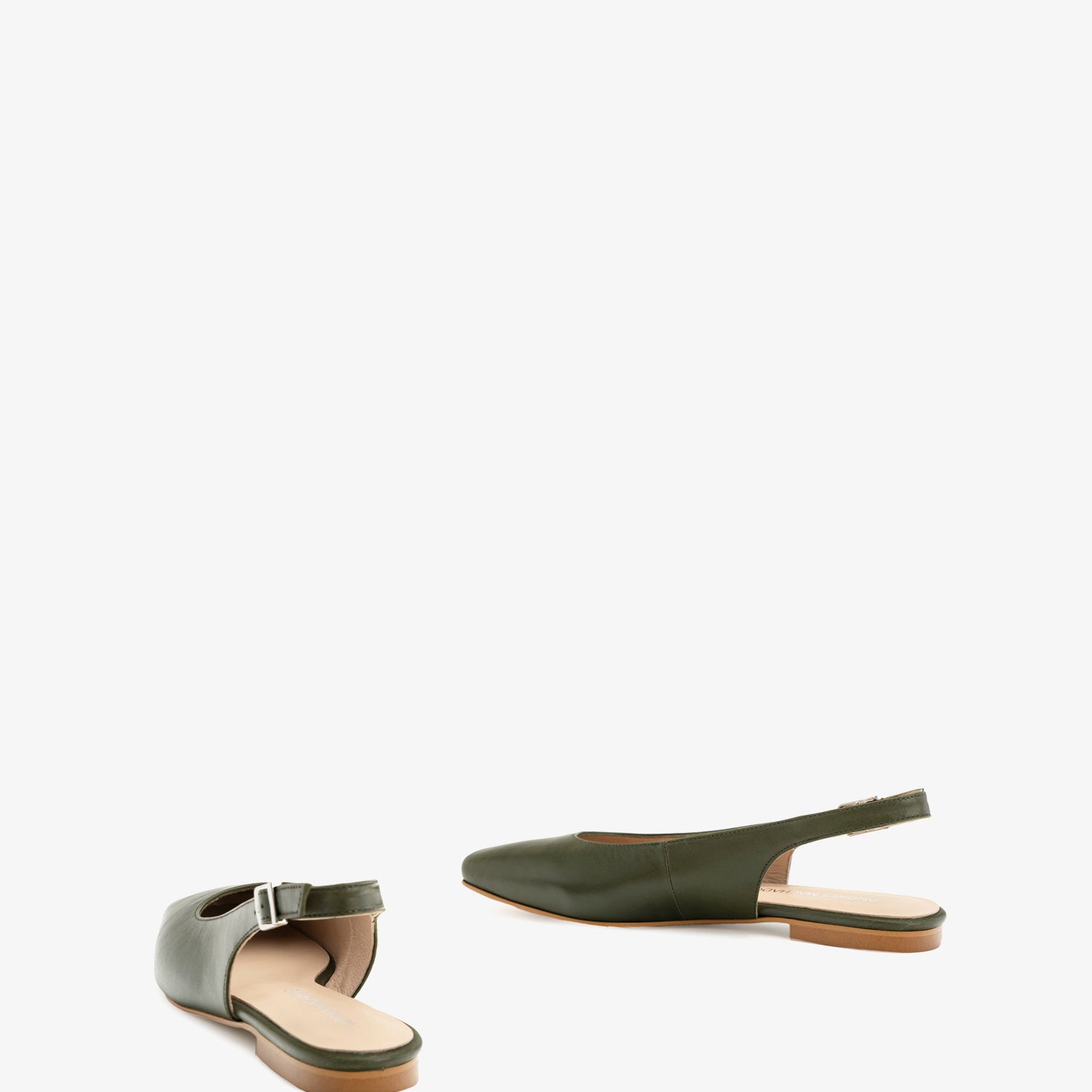 Ballerina aus glattem Khakileder. Slingback-Design mit Schnallenverschluss. Innenfutter aus beigefarbenem Leder. Quadratische Zehenpartie. Alle Größen von 32 bis 45. Hergestellt in Spanien.