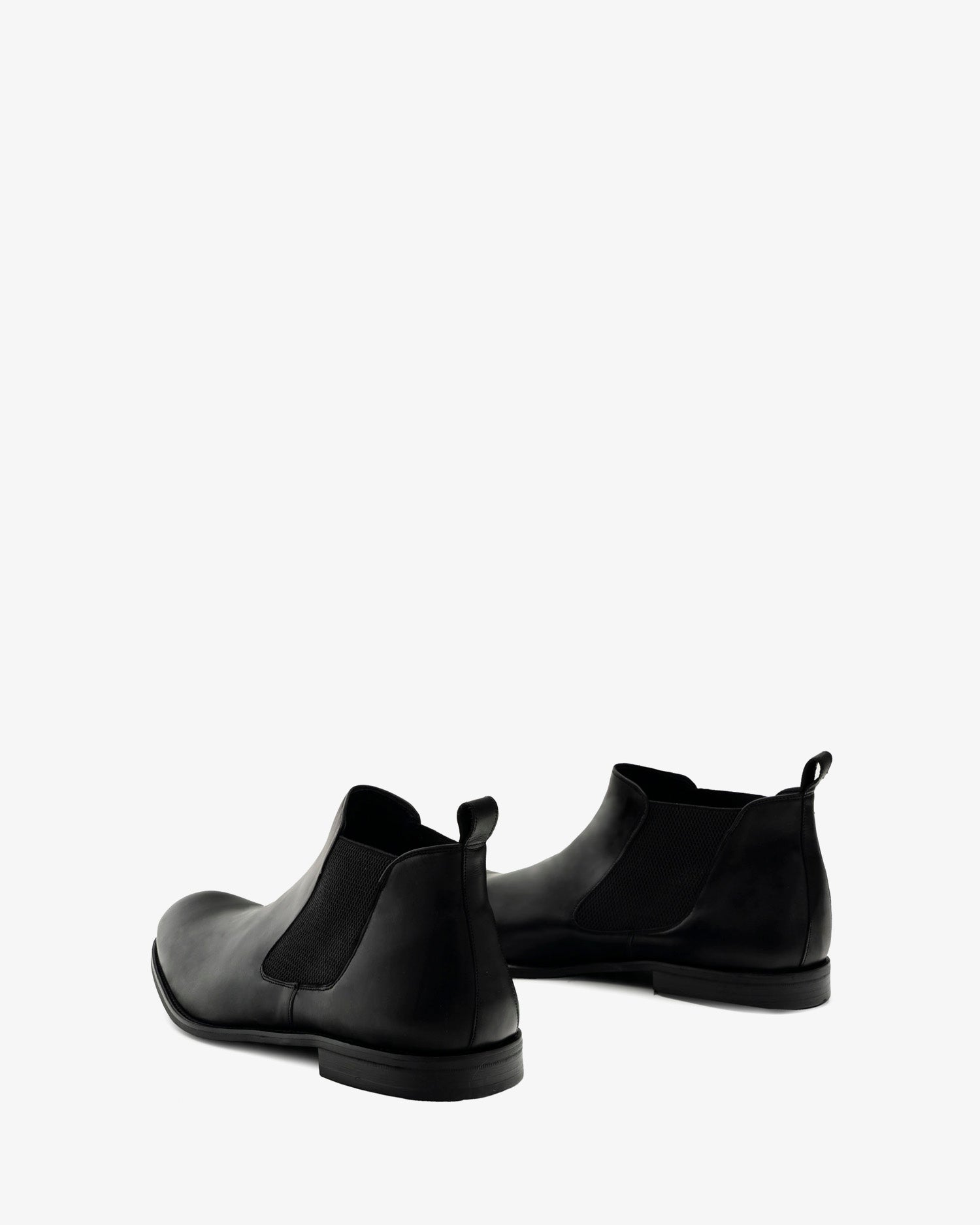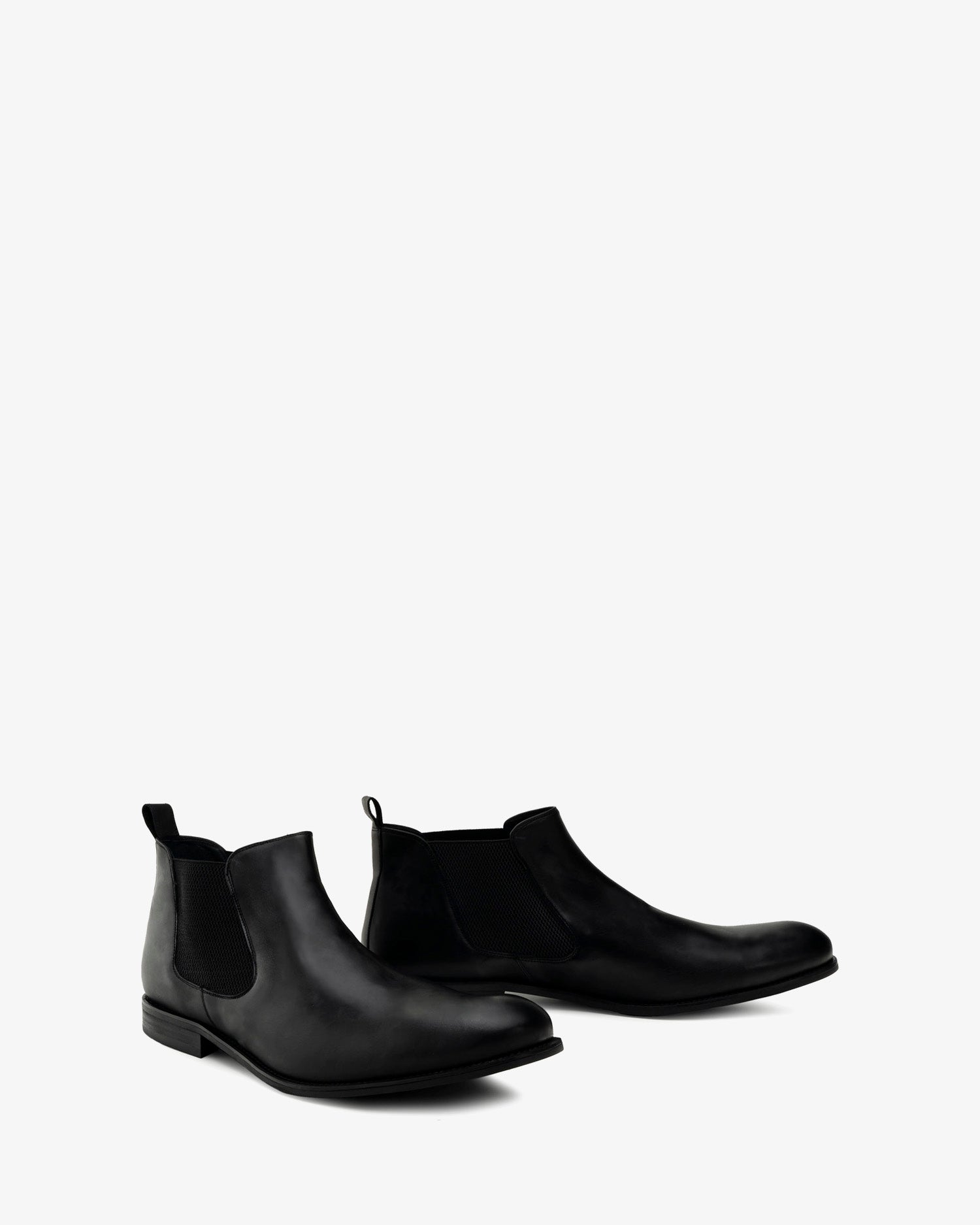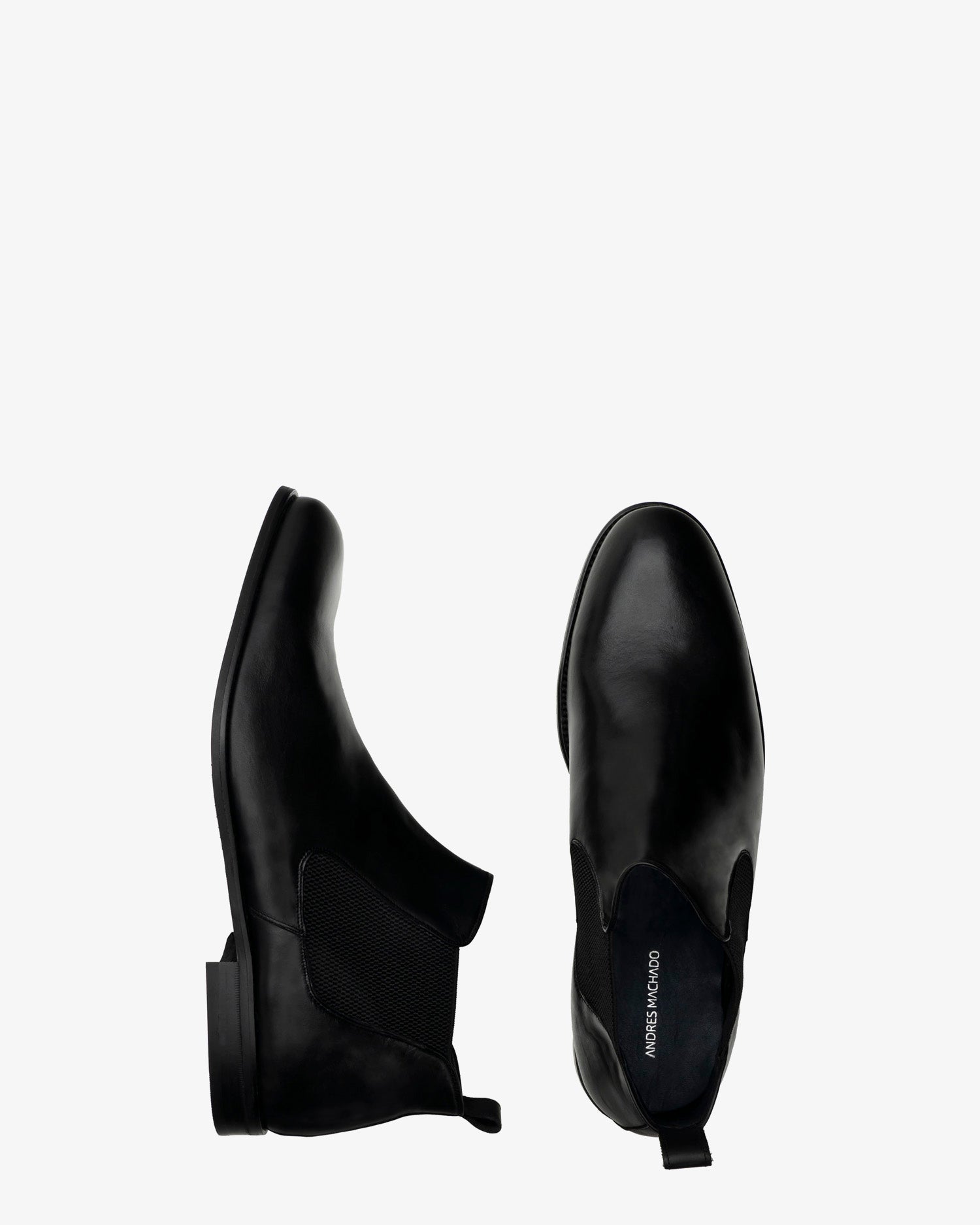 Stiefel im Chelsea-Stil aus schwarzem Leder. Passende seitliche Gummizüge und Aufreißlasche hinten. Futter und Innensohle aus Leder. Herren-Übergrößen von 47 bis 50. Hergestellt in Spanien.