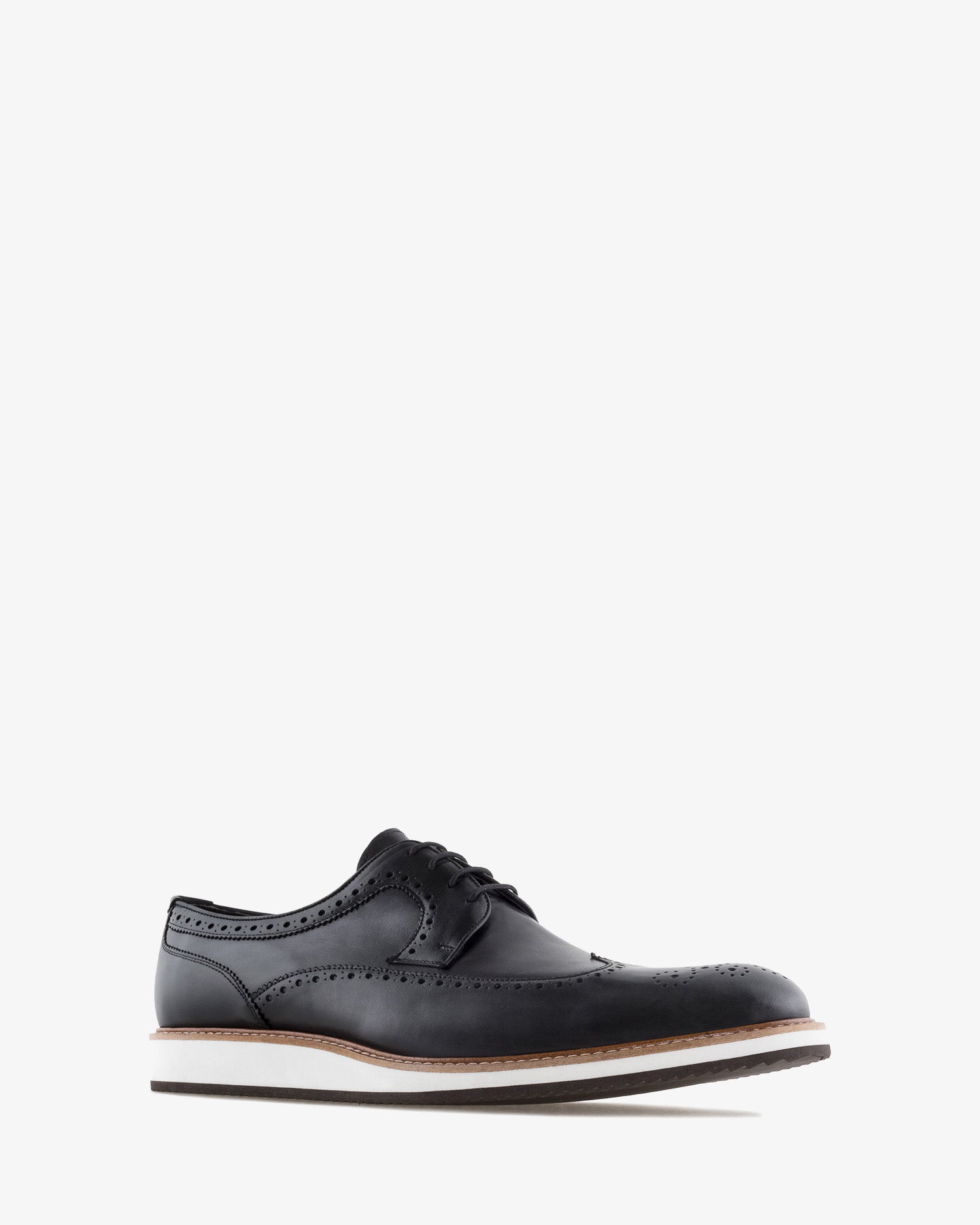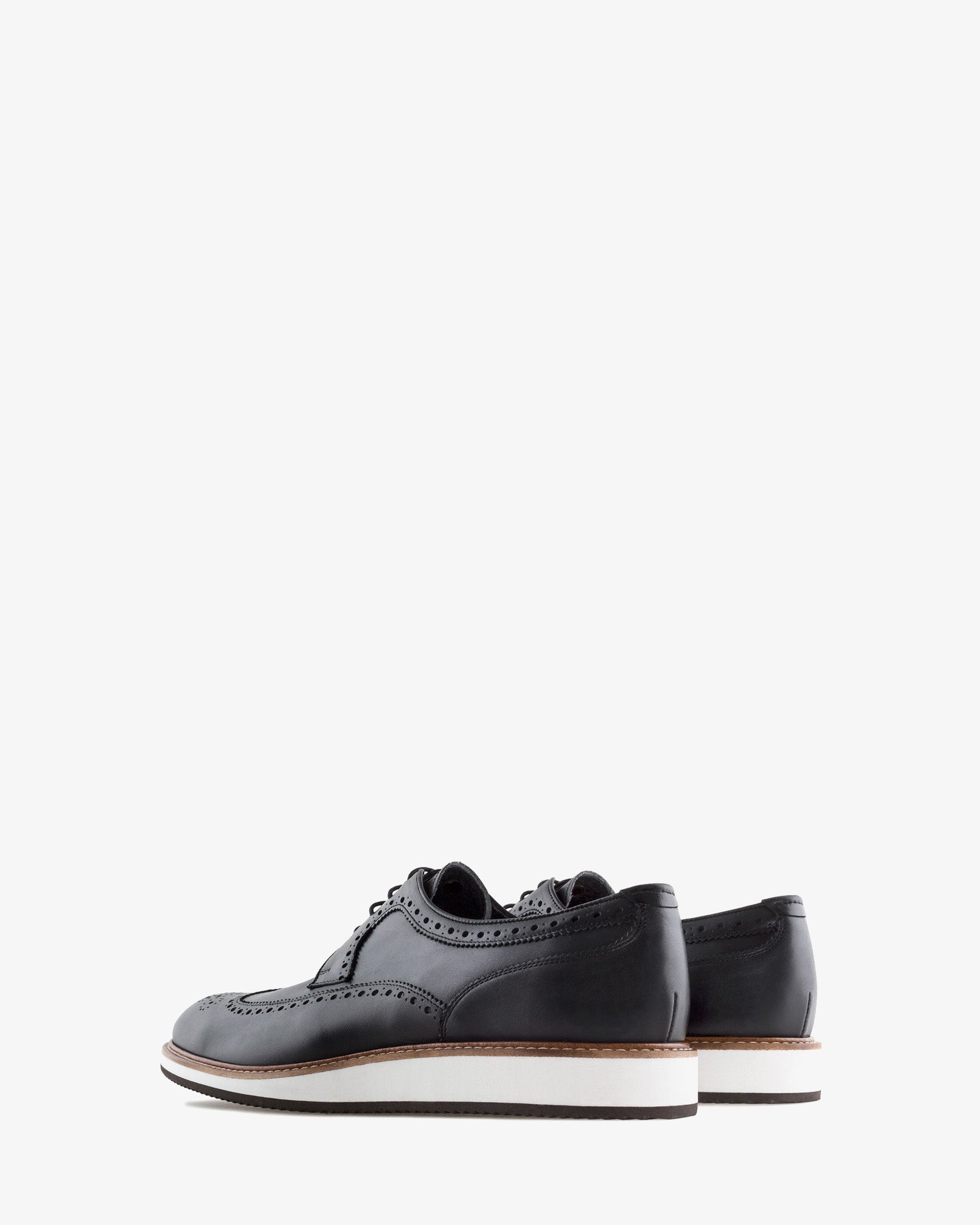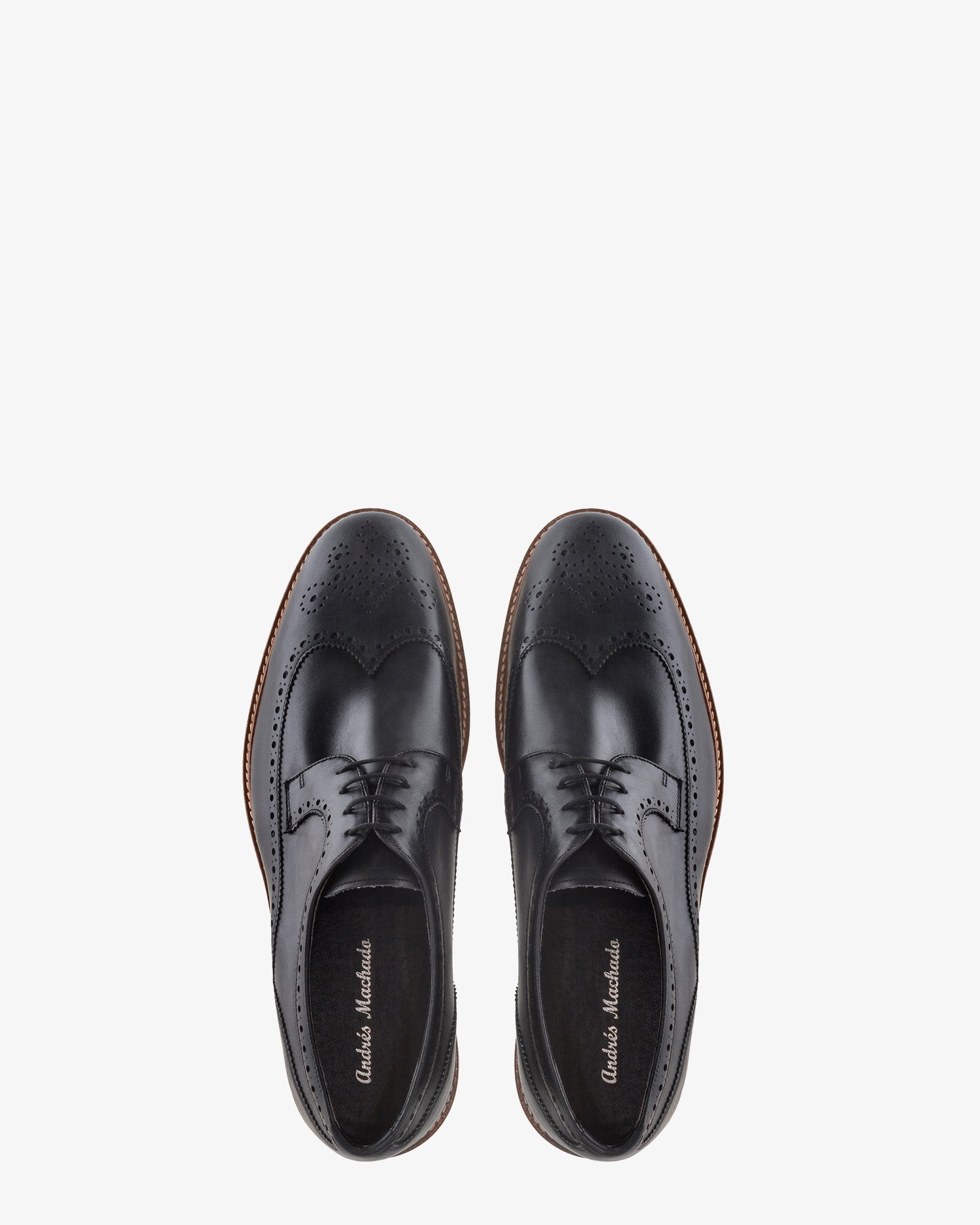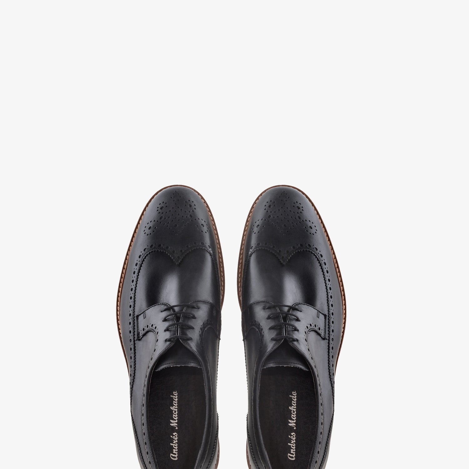Lederschuh im Oxford-Stil in Schwarz. Passende Schnürung mit vier Schlaufen. Dekoratives Detail aus Perforationen im Schnitt. Lederfutter und zweifarbige Keilsohle. Herren-Übergrößen von 46 bis 50. Hergestellt in Spanien.
