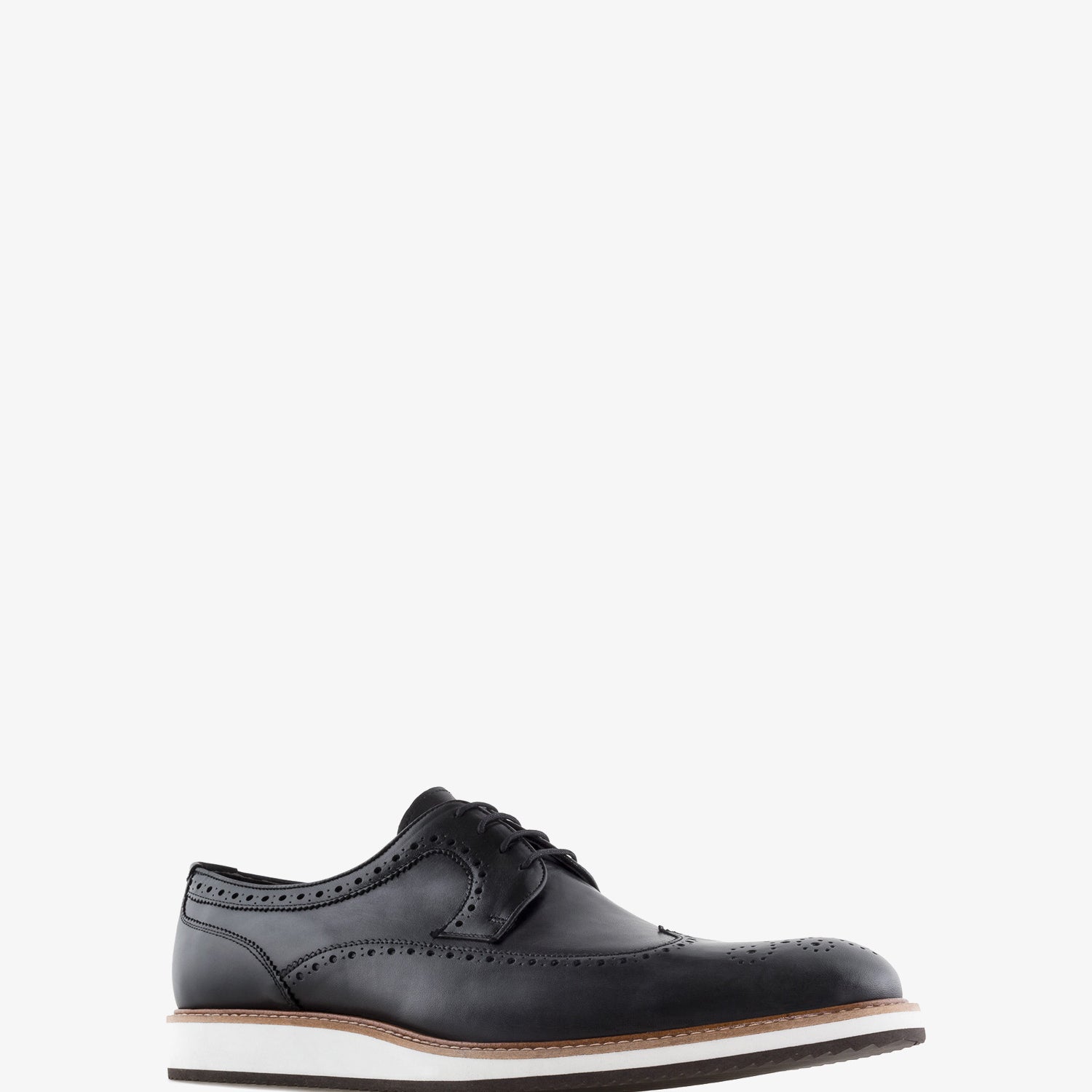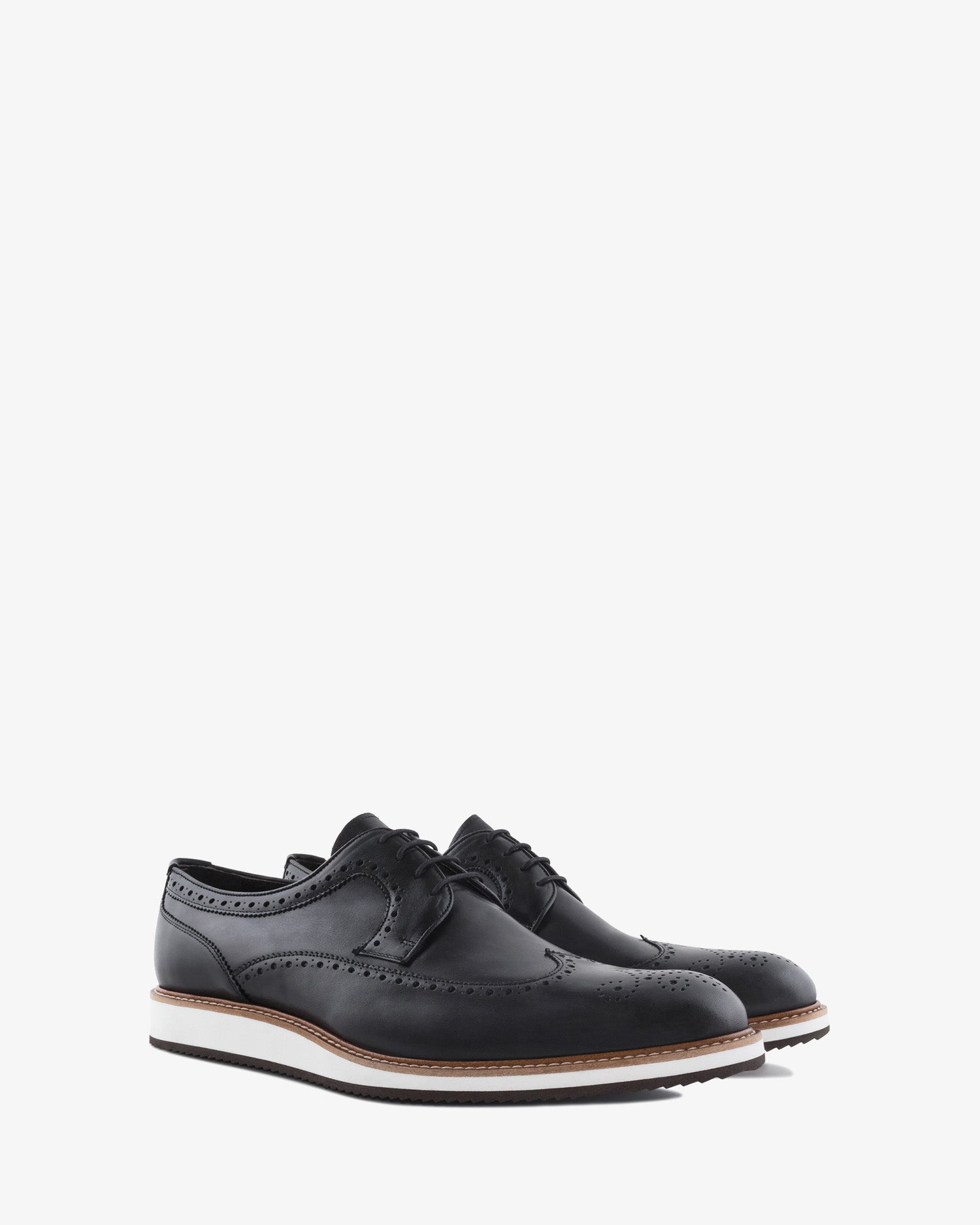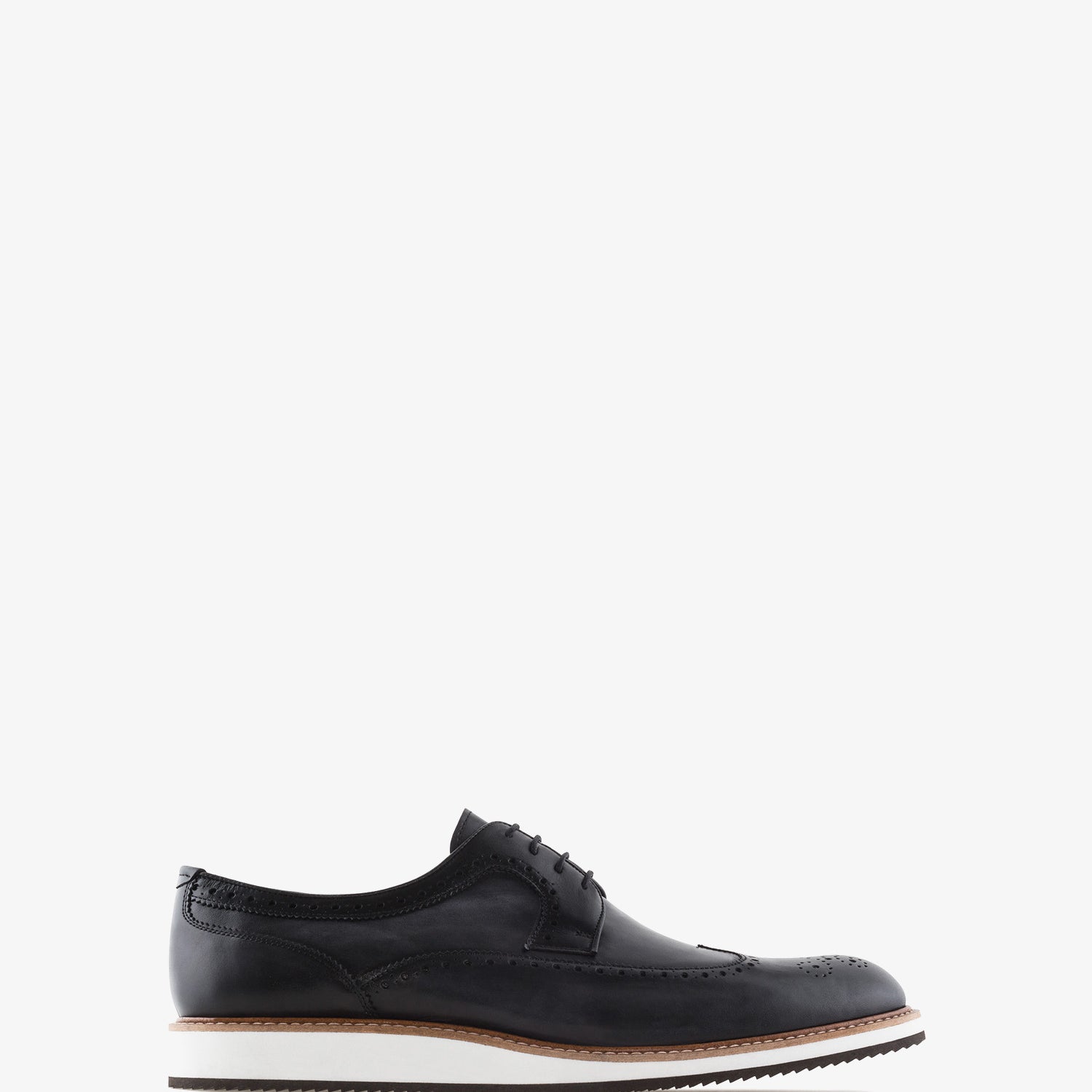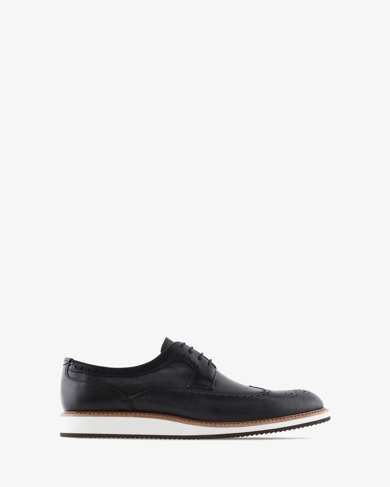 Lederschuh im Oxford-Stil in Schwarz. Passende Schnürung mit vier Schlaufen. Dekoratives Detail aus Perforationen im Schnitt. Lederfutter und zweifarbige Keilsohle. Herren-Übergrößen von 46 bis 50. Hergestellt in Spanien.