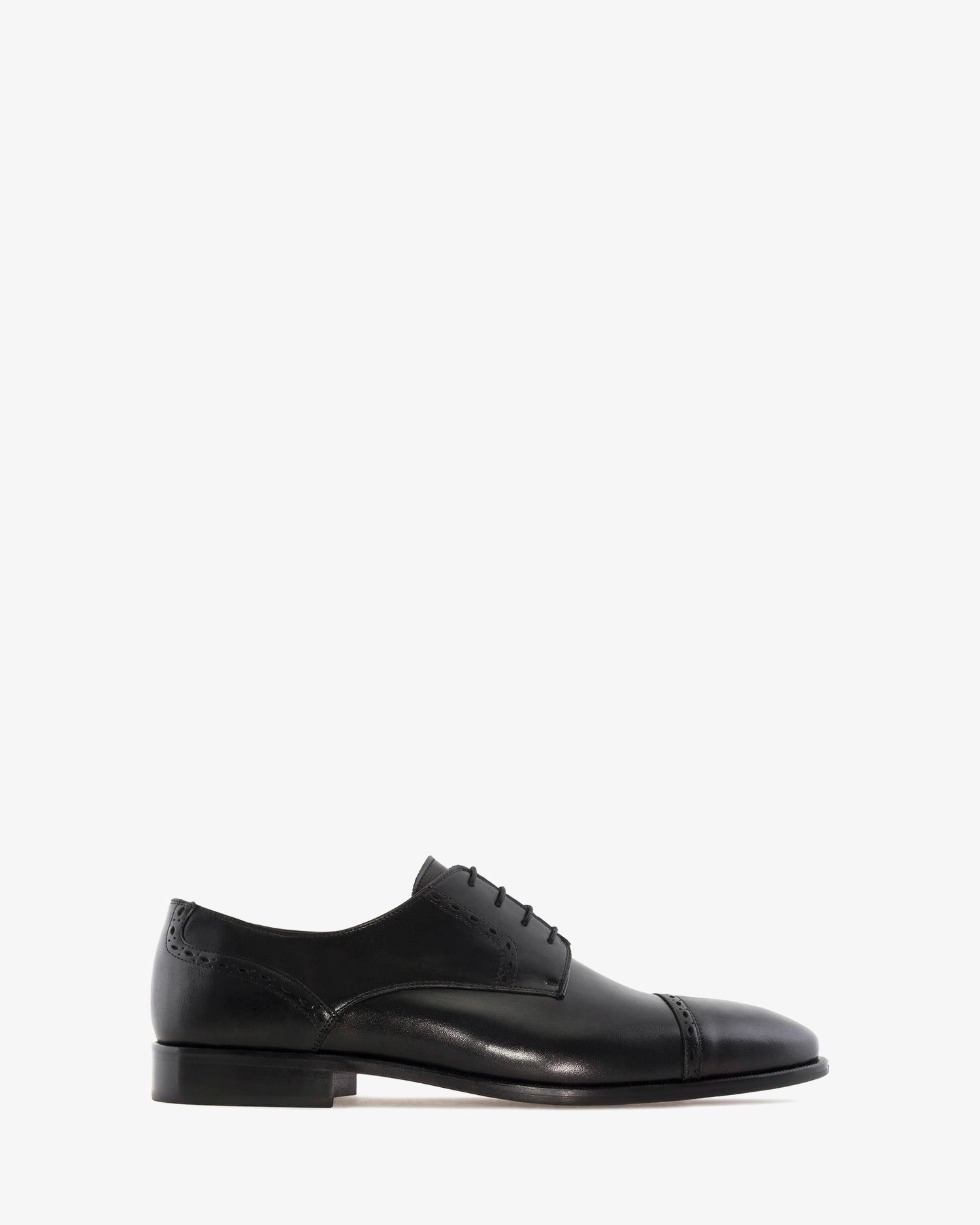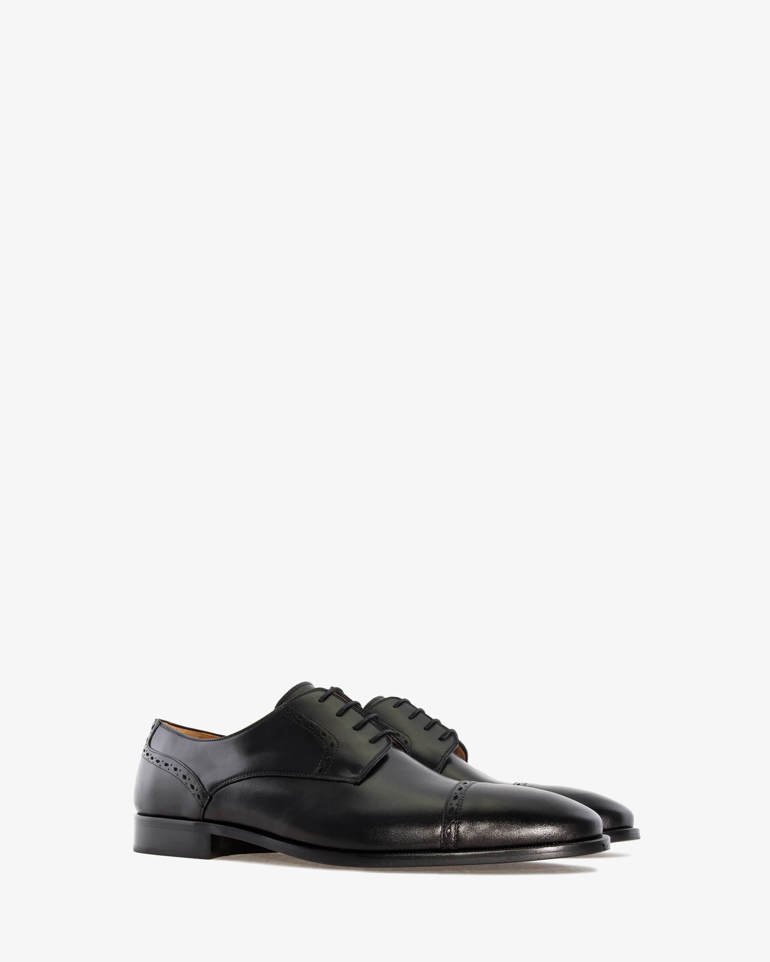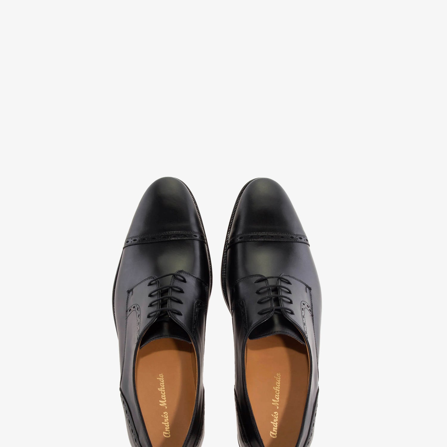 Schwarzer Lederschuh mit passenden Schnürsenkeln. Detail der Perforationen im Schnitt. Innenfutter aus braunem Leder. Schwarze Ledersohle. Kleine Herrengrößen von 37 bis 40. Große Herrengrößen von 47 bis 50. Hergestellt in Spanien.