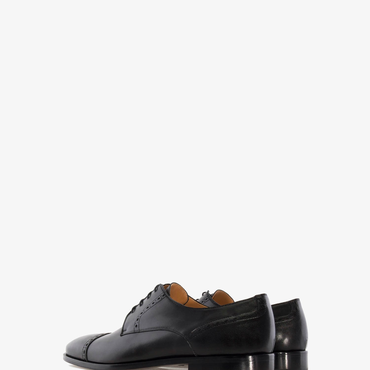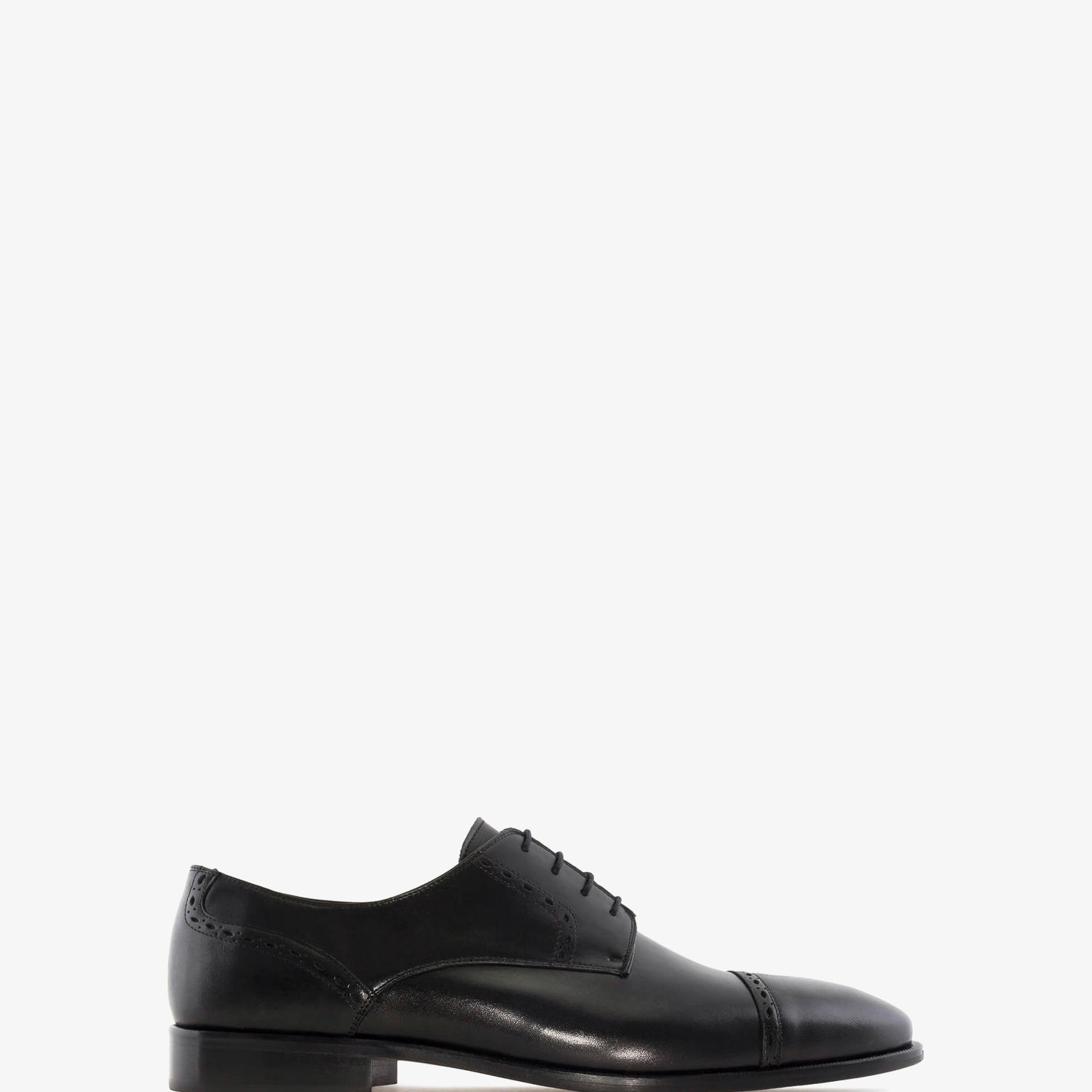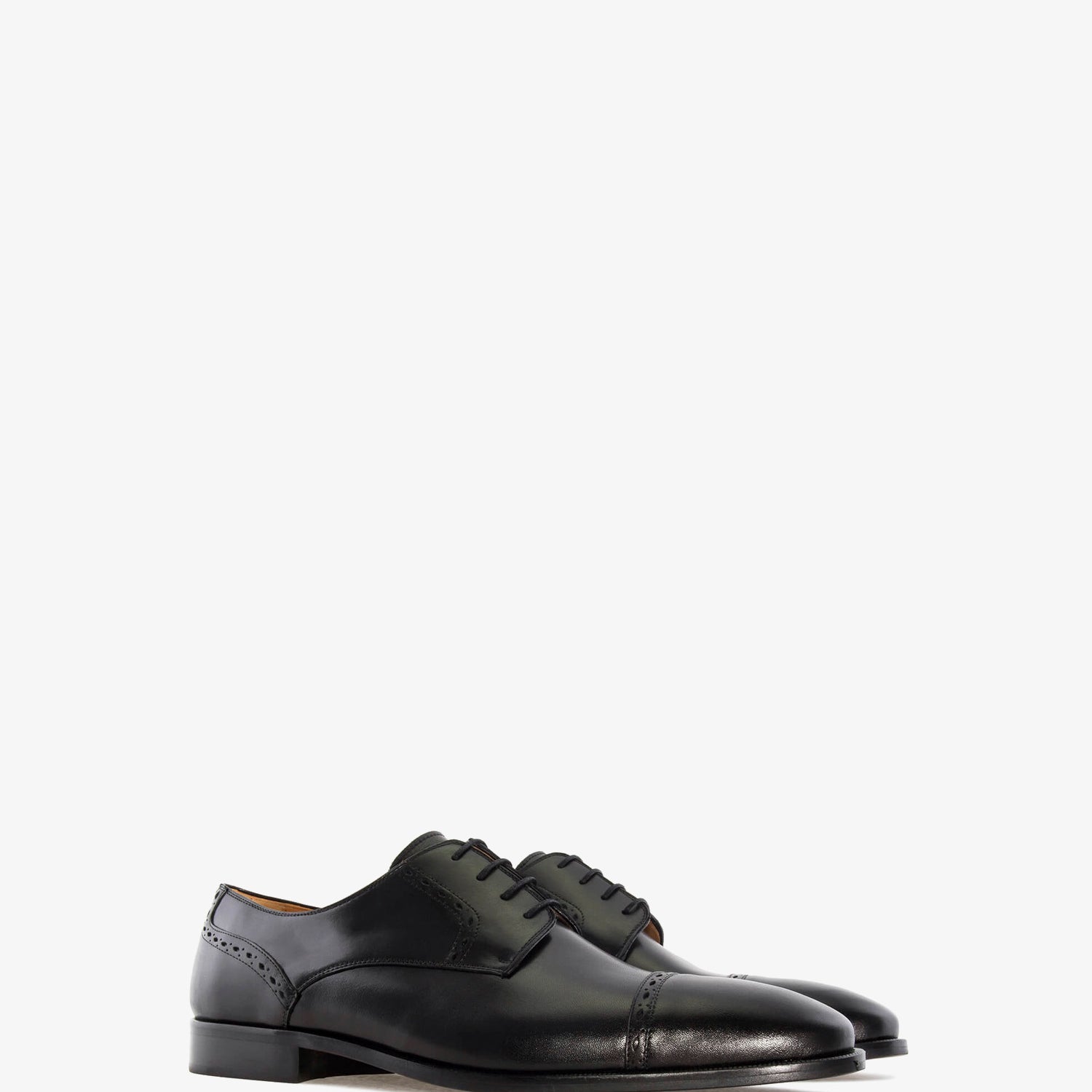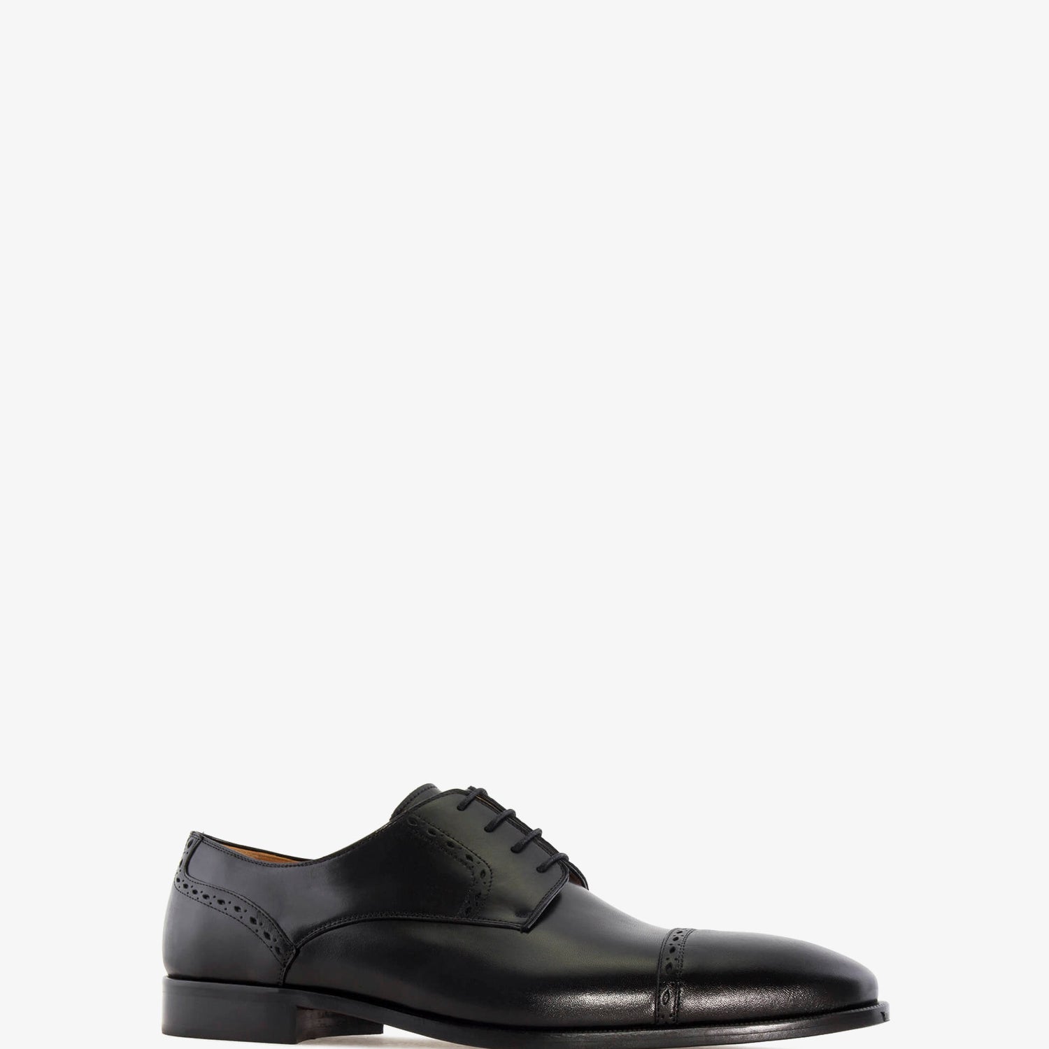 Schwarzer Lederschuh mit passenden Schnürsenkeln. Detail der Perforationen im Schnitt. Innenfutter aus braunem Leder. Schwarze Ledersohle. Kleine Herrengrößen von 37 bis 40. Große Herrengrößen von 47 bis 50. Hergestellt in Spanien.
