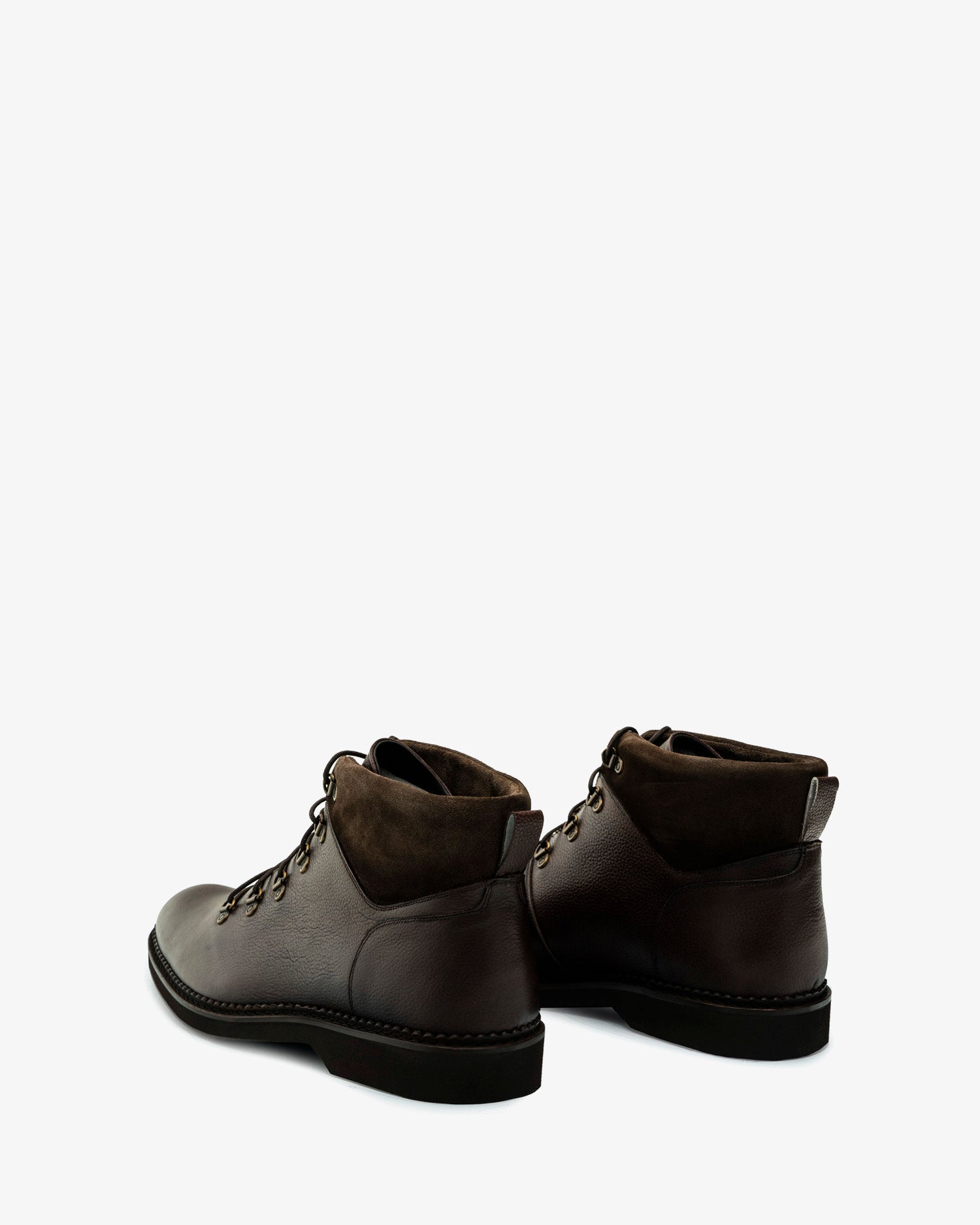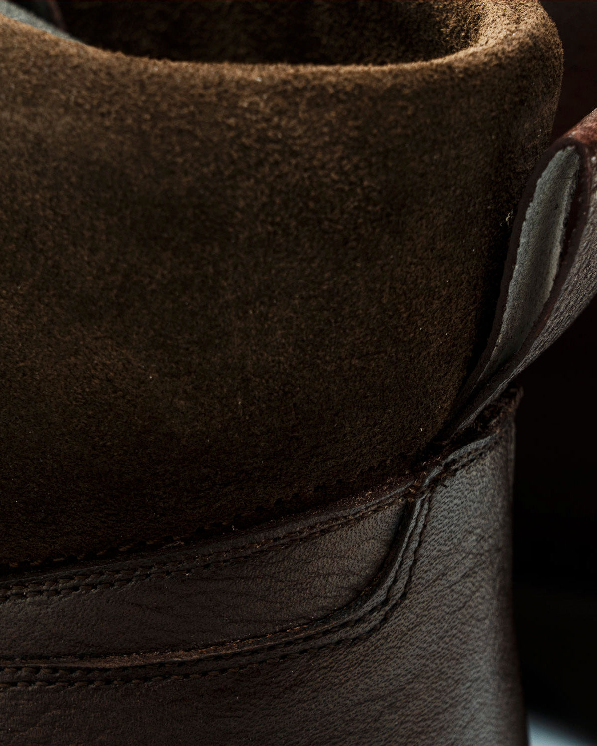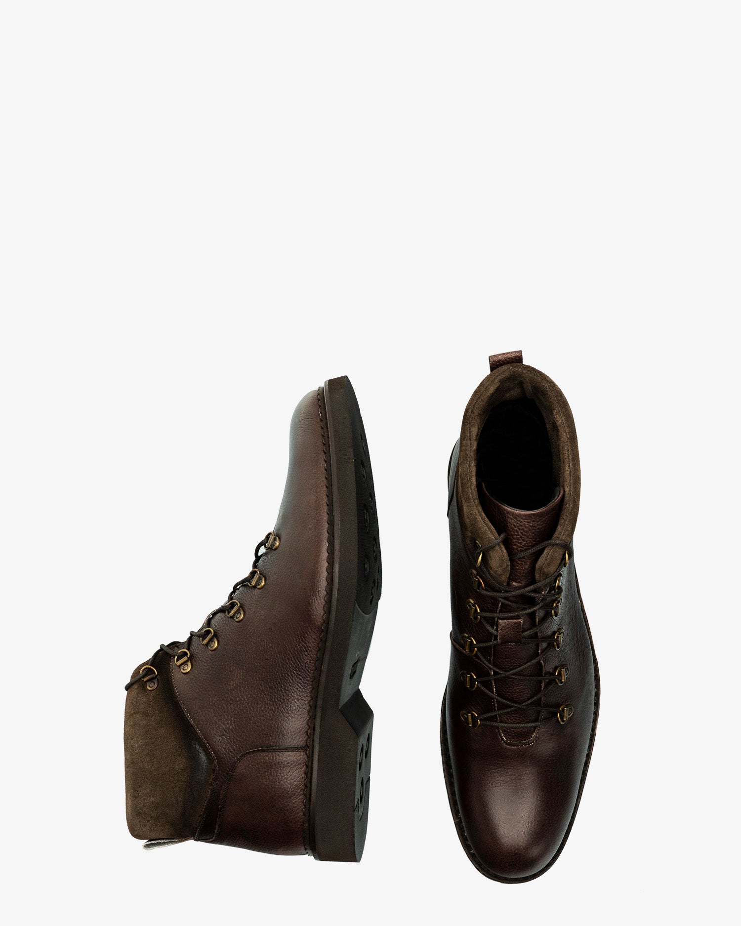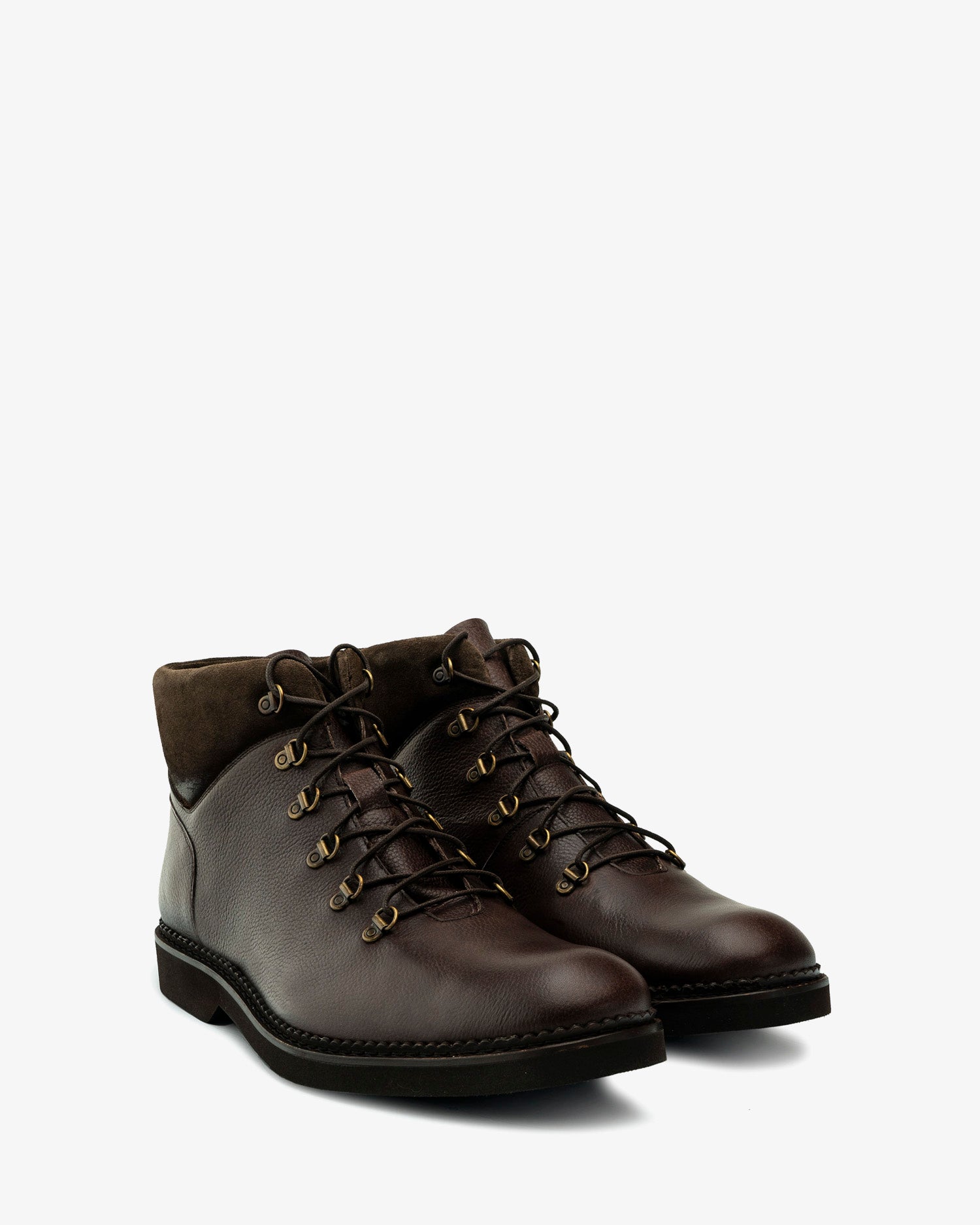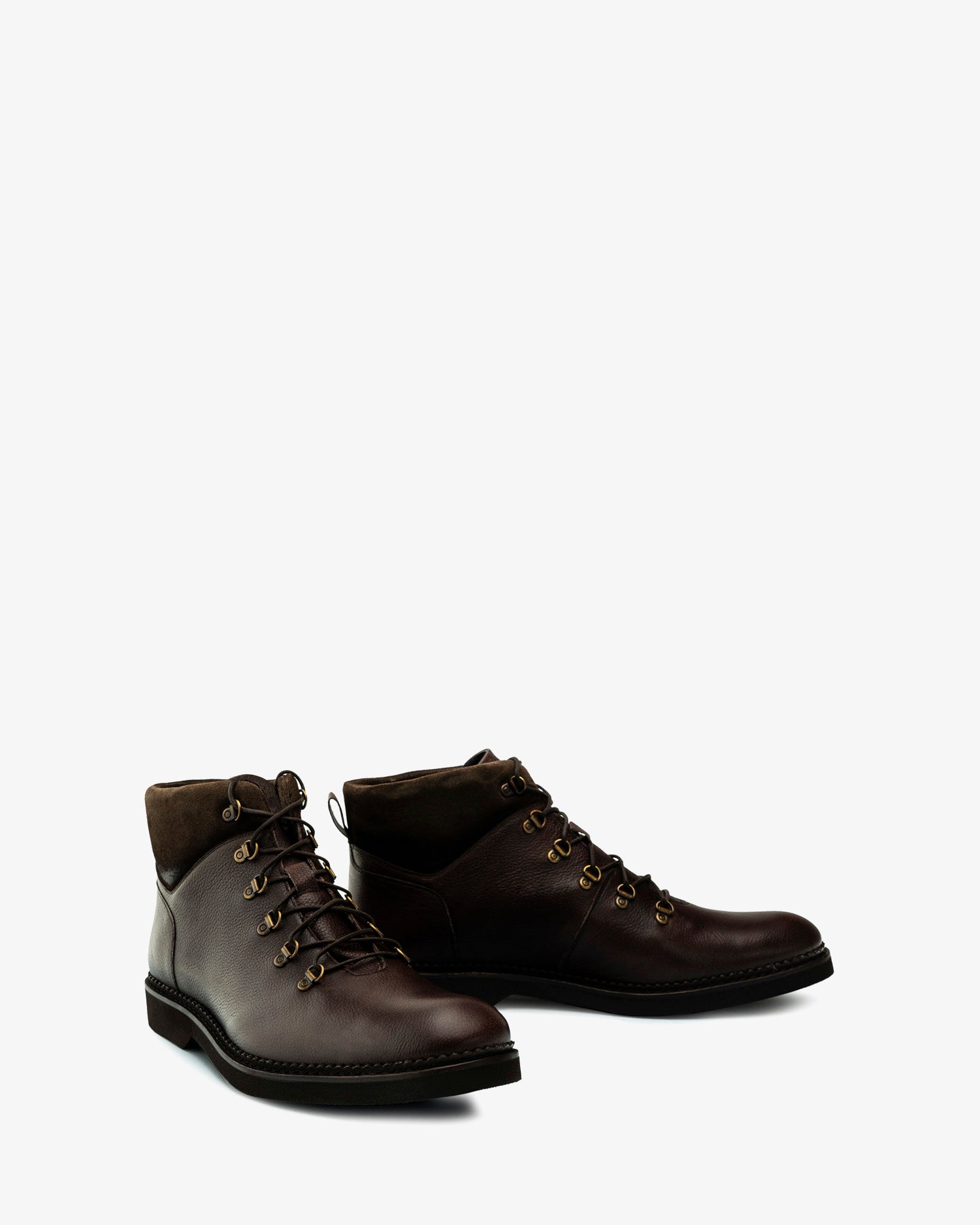 Herrenstiefelette aus hochwertigem geprägtem Leder in Braun. Passender Tragegriff auf der Rückseite. Obermaterial aus braunem Wildleder. Passender Schnürverschluss mit 6 goldenen Metallschlaufen. Geprägte Lederzunge. Innenfutter aus braunem Leder. Strapazierfähige und griffige EVA-Gummisohle. Herren-Übergrößen von 47 bis 50. MADE IN SPANIEN