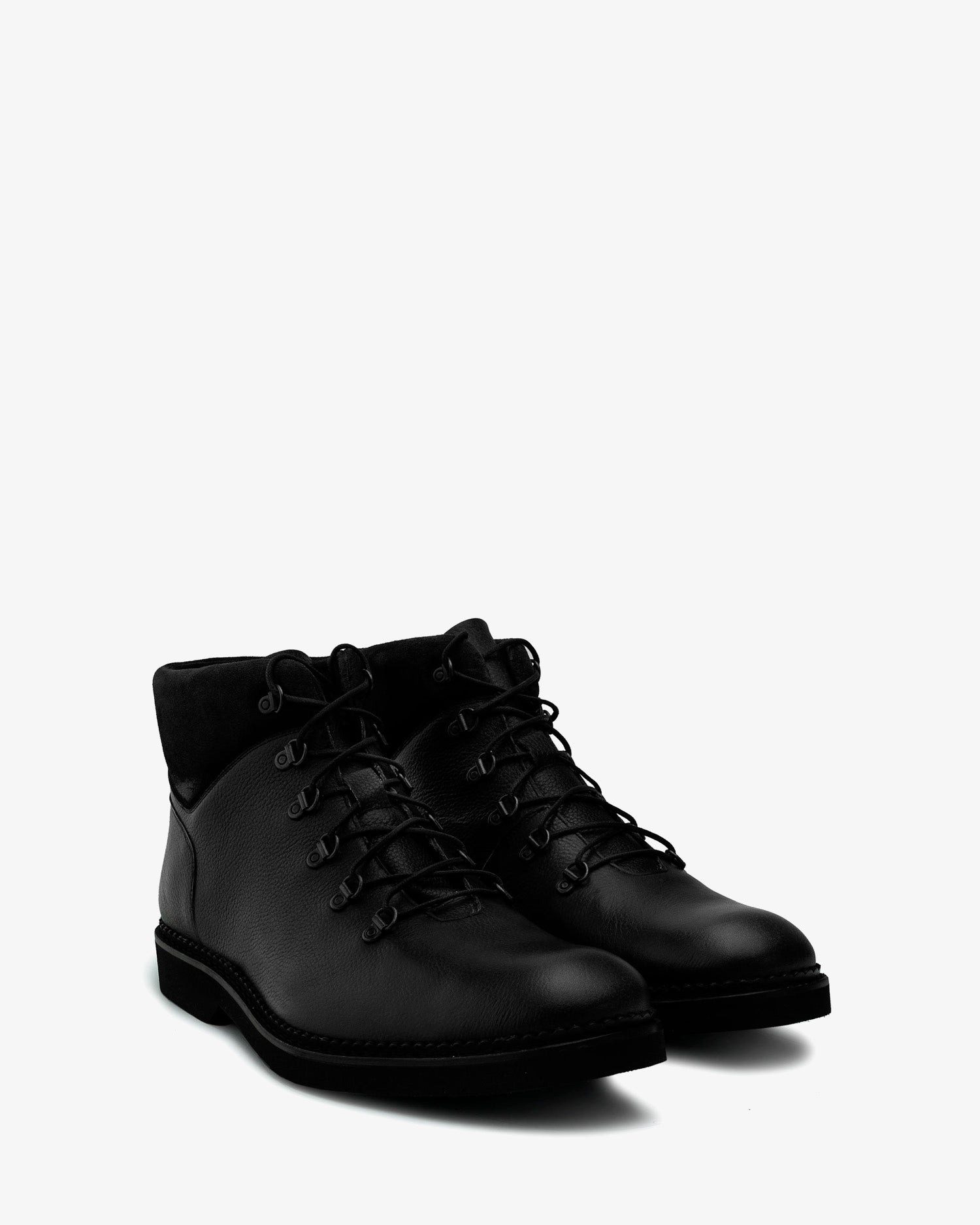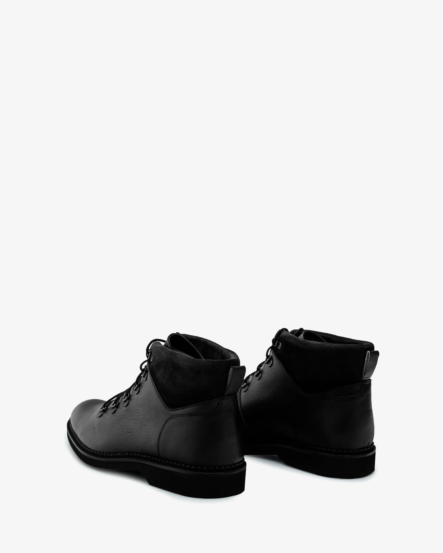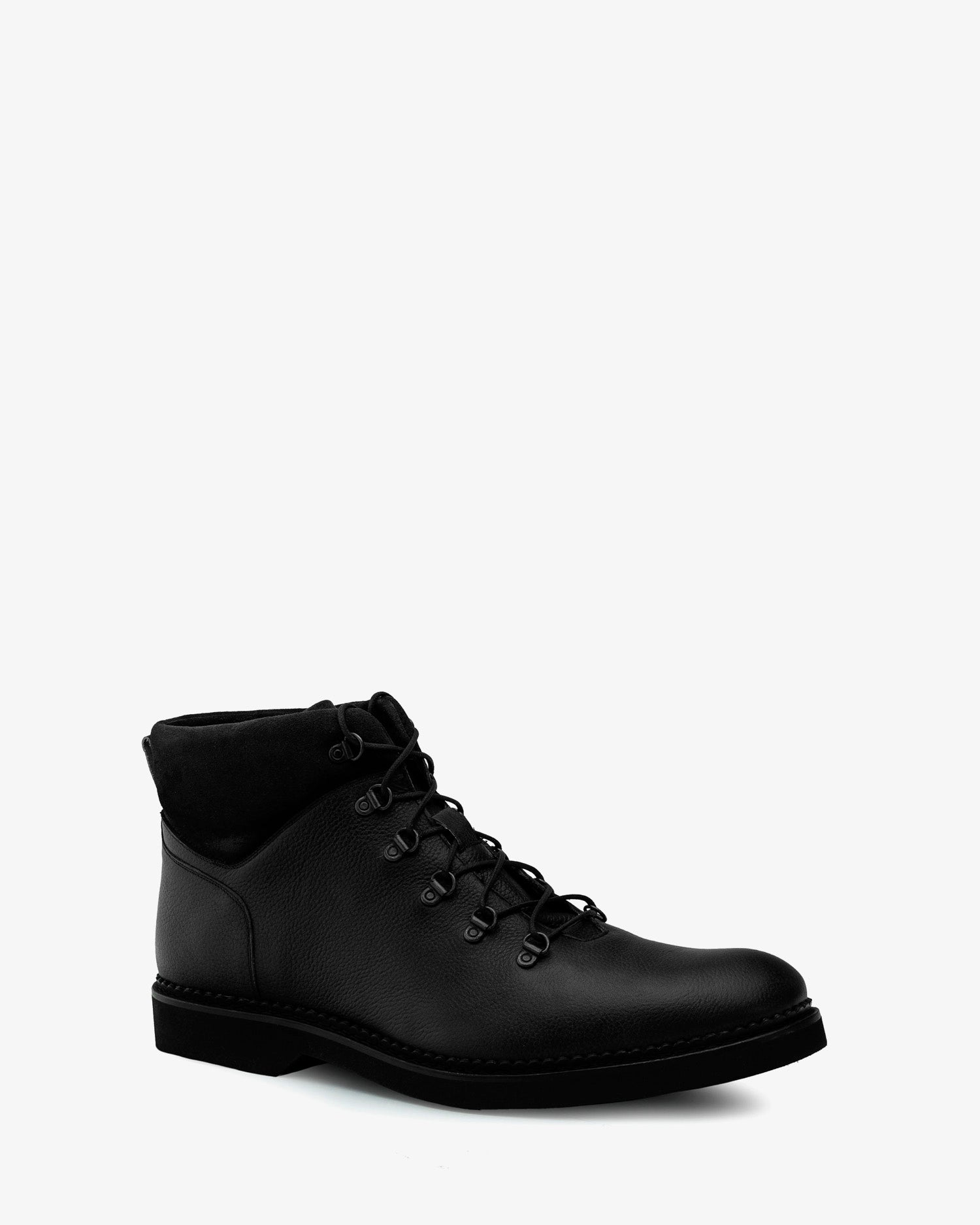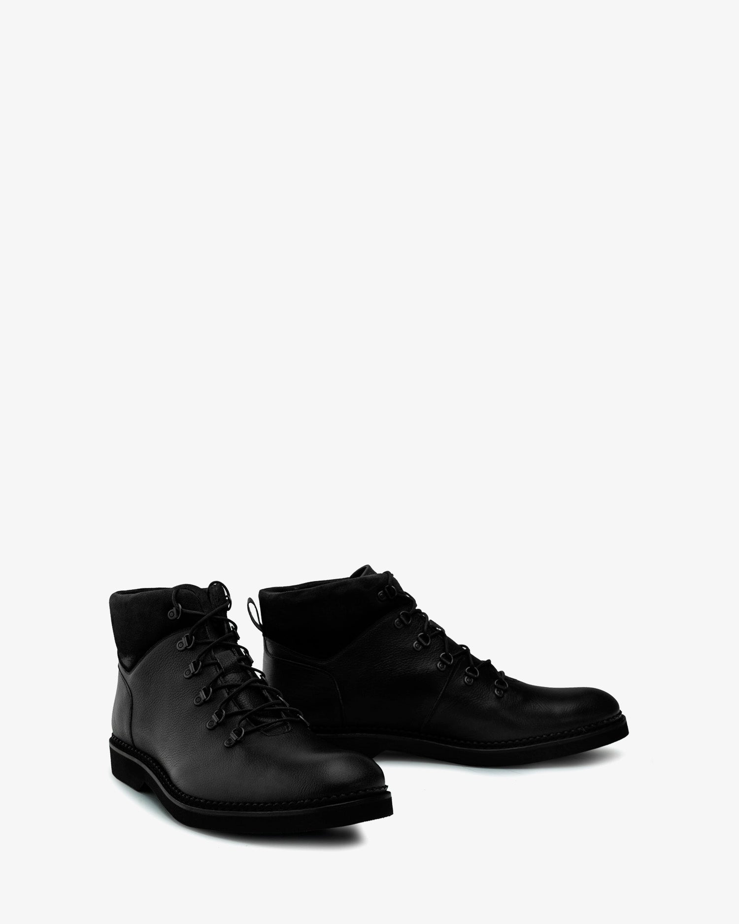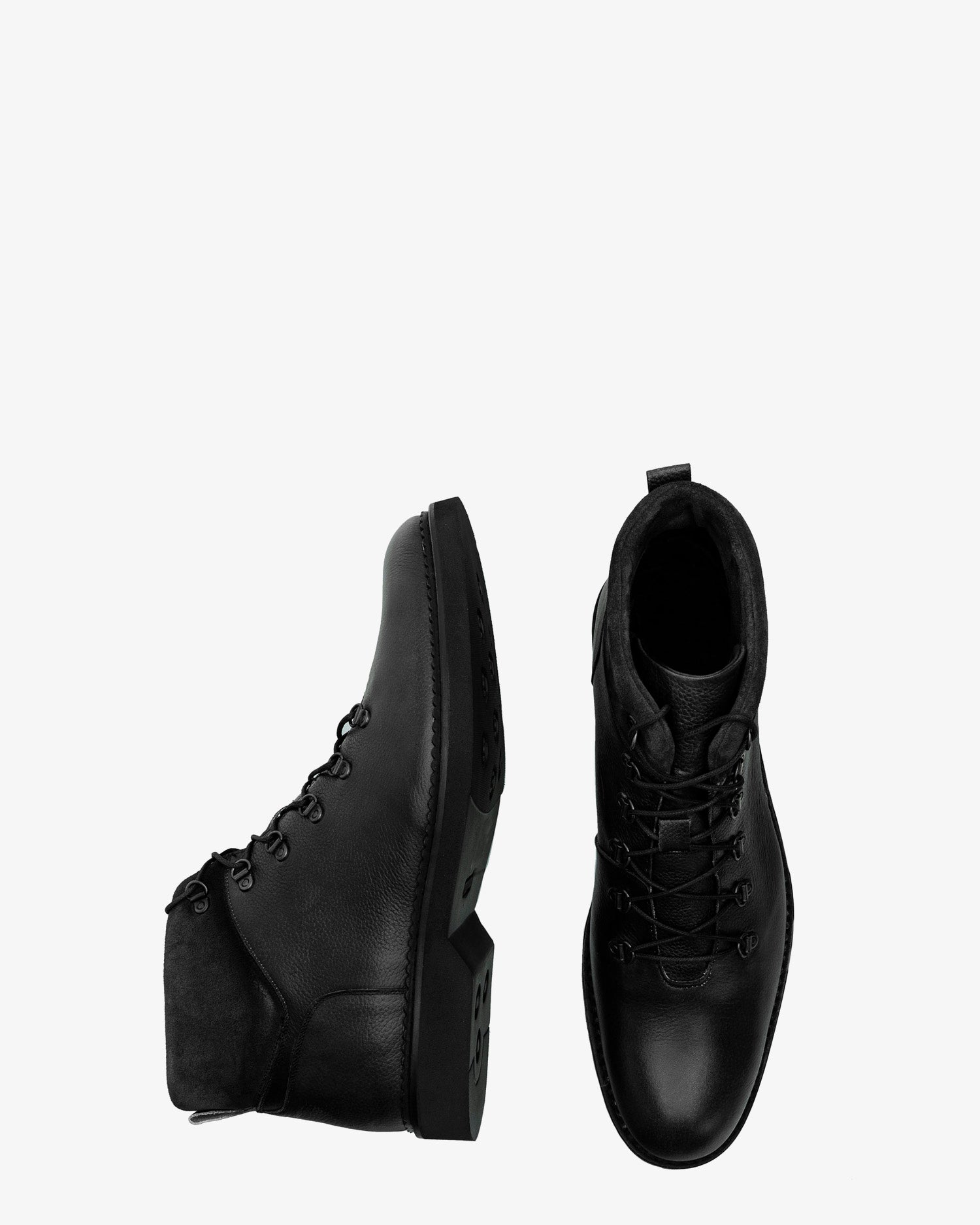 Herrenstiefelette aus hochwertigem geprägtem Leder in Schwarz. Passender Tragegriff auf der Rückseite. Obermaterial aus schwarzem Wildleder. Schwarzer Spitzenverschluss mit 6 passenden Metallschlaufen. Geprägte Lederzunge. Innenfutter aus schwarzem Leder. Strapazierfähige und griffige EVA-Gummisohle. Herren-Übergrößen von 47 bis 50. MADE IN SPANIEN