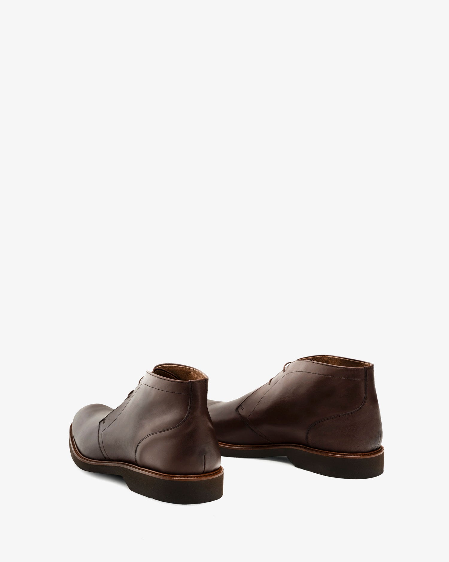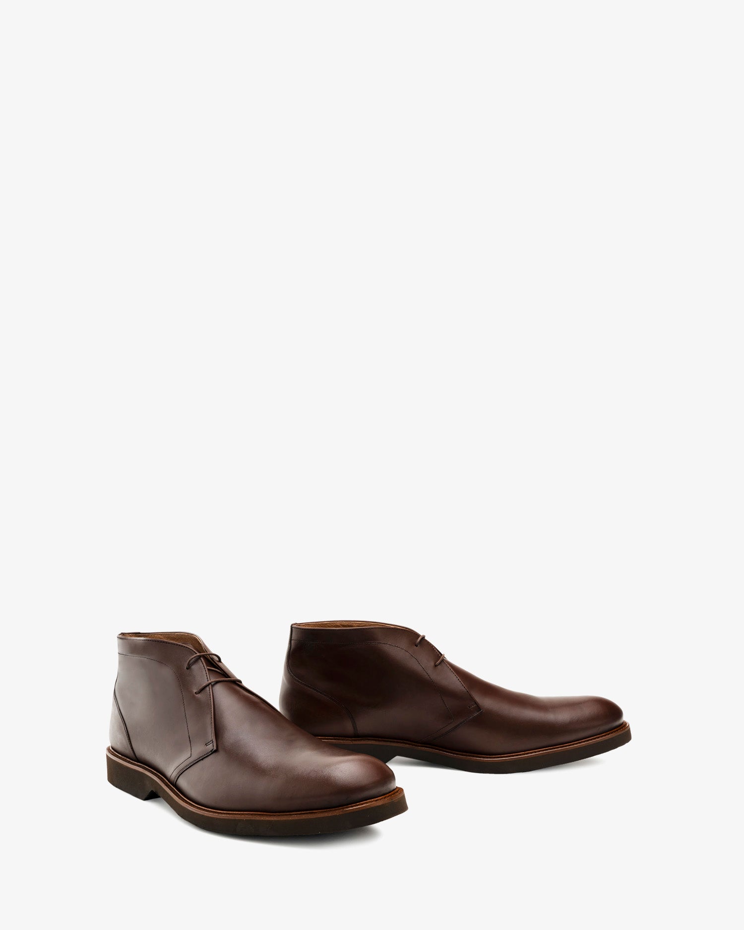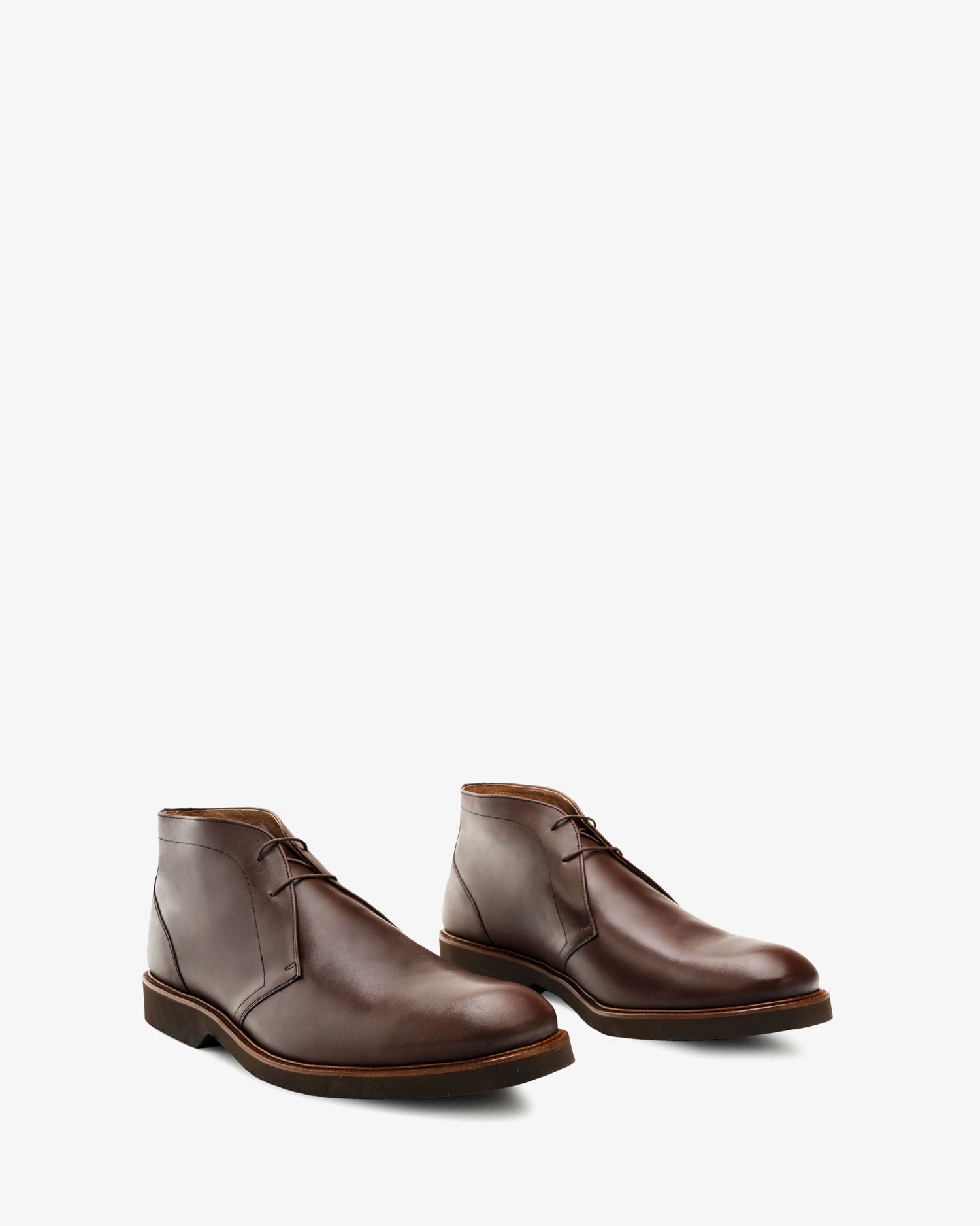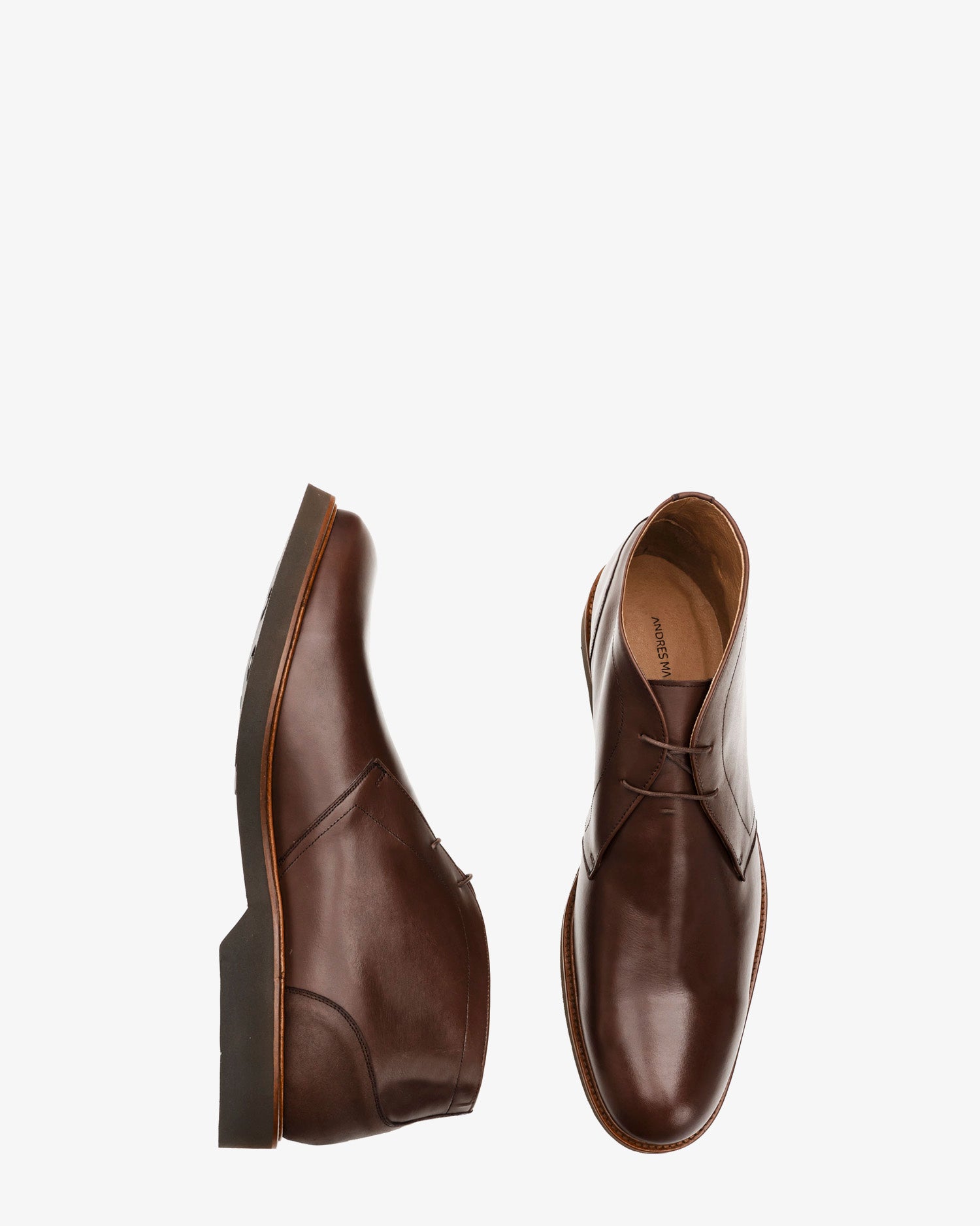 Braune Stiefelette aus Leder. Passender Schnürverschluss. Innenfutter und Innensohle aus Kamelleder. Braune Sohle. Herren-Übergrößen von 47 bis 50. Hergestellt in Spanien.