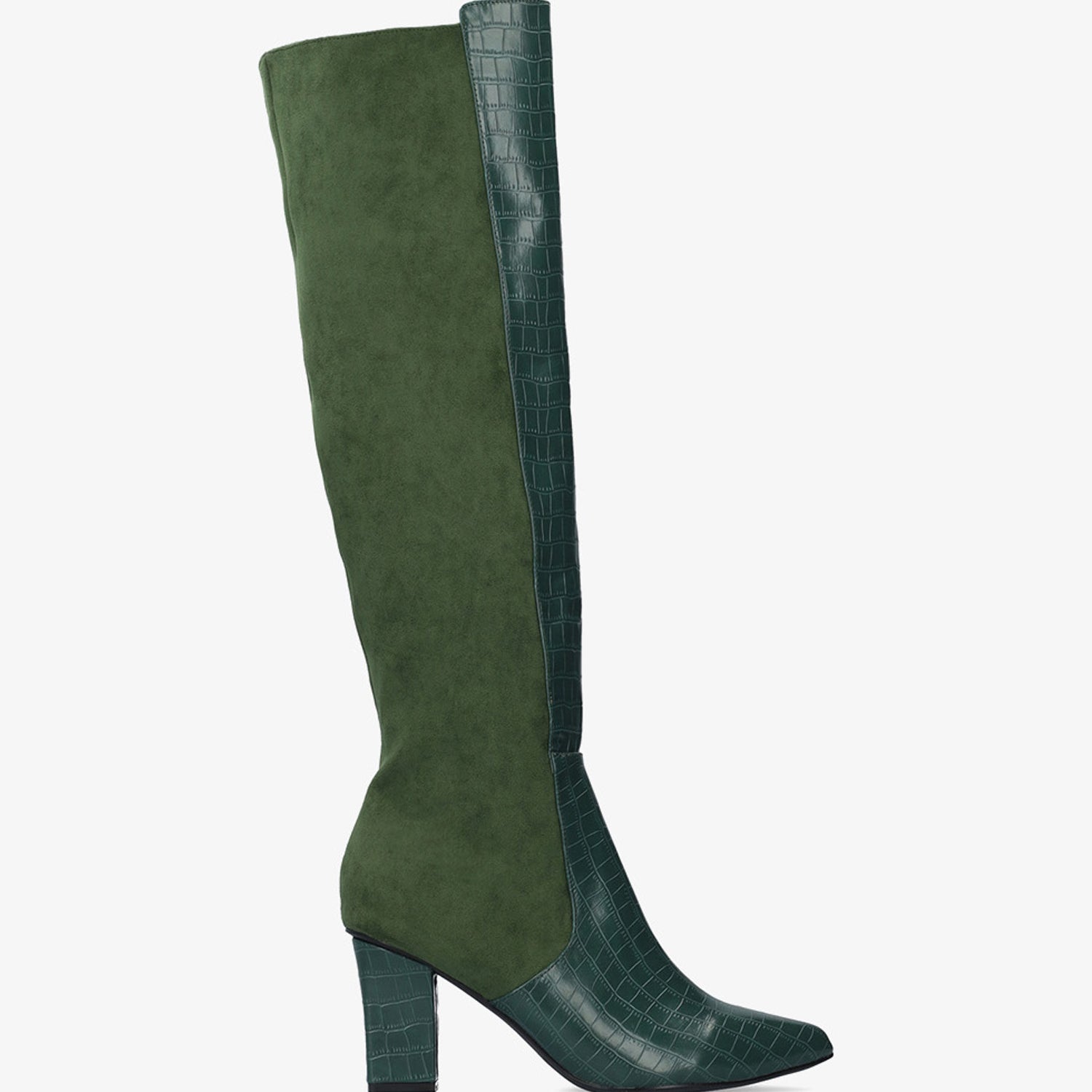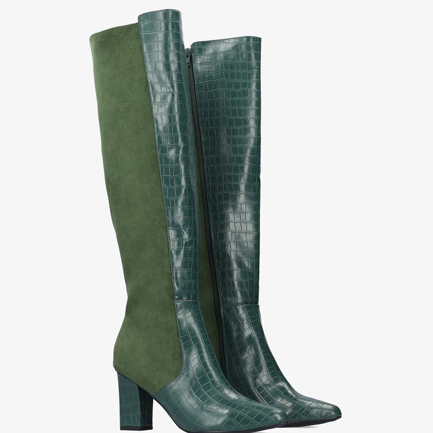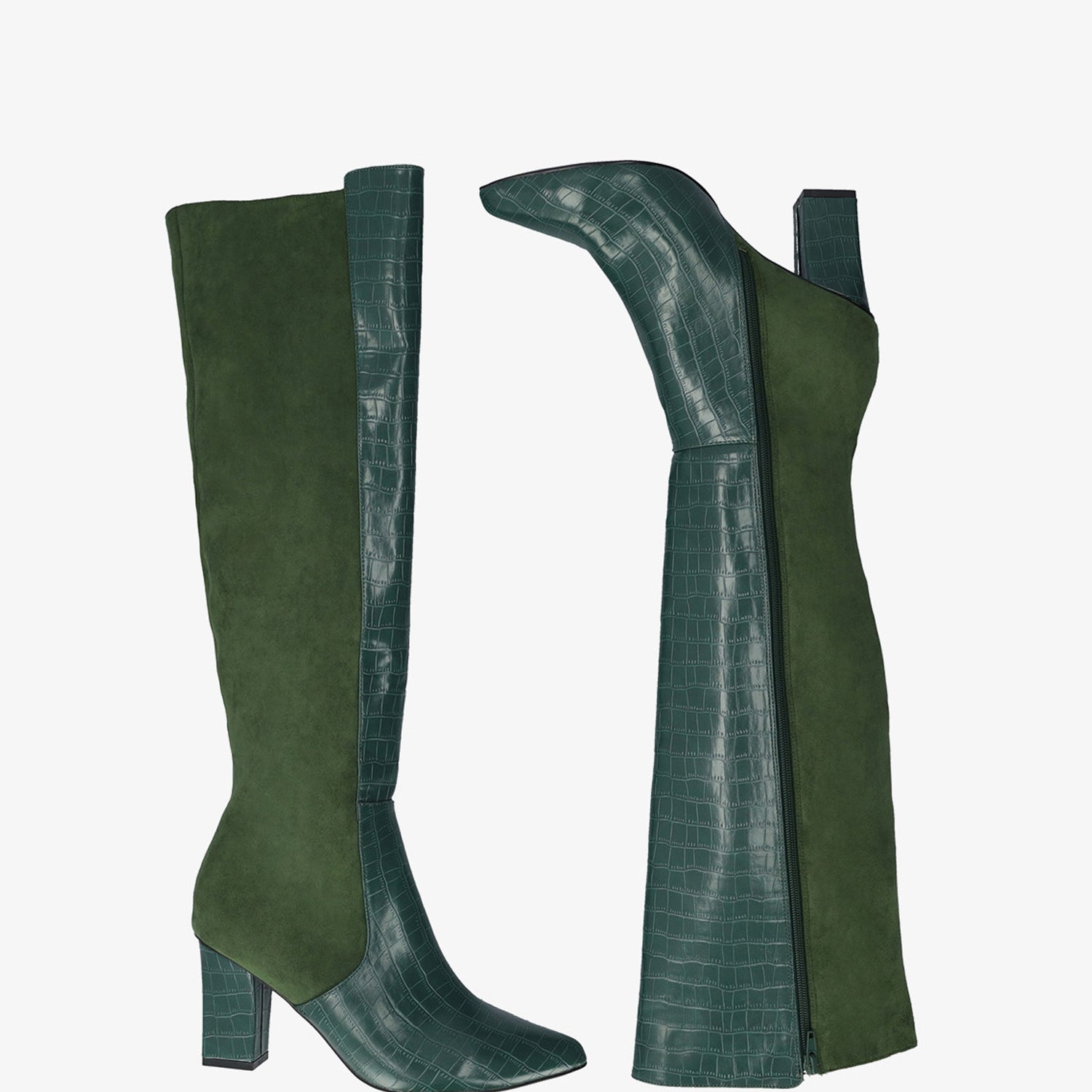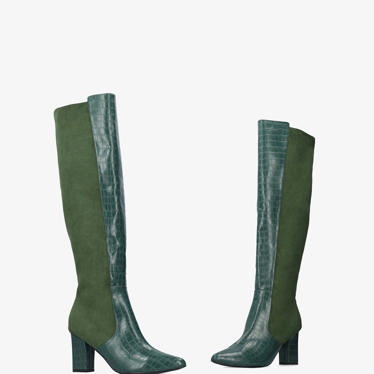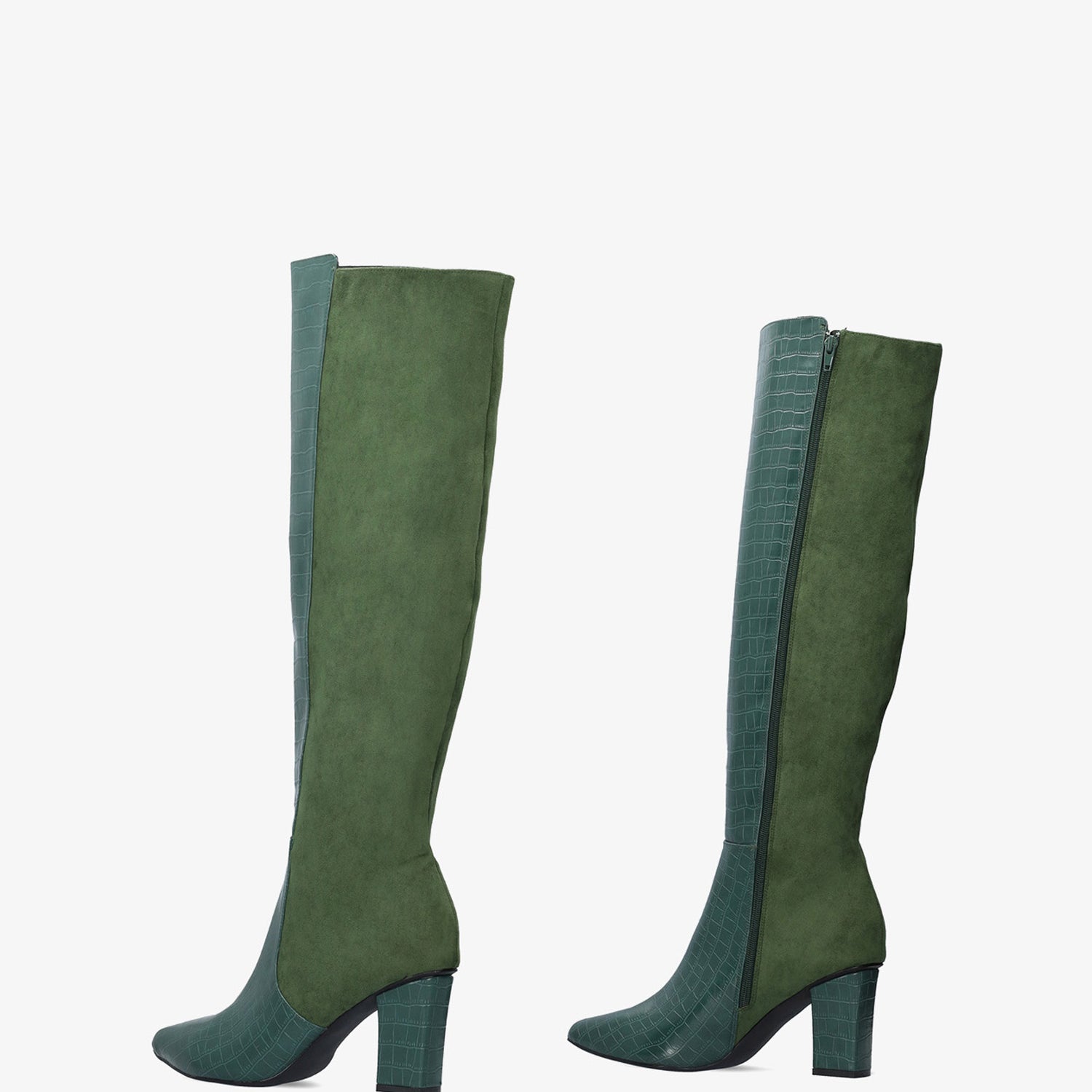 Hoher, grüner Kombinationsstiefel. Vorderteil in grünem Kokosnussleder und Rückseite in passendem Wildleder. Passender Reißverschluss an der Schaftinnenseite. Spitz zulaufende Spitze. 7,2 cm hoher, kokosnussfarbener Absatz bei den kleinen Größen 32 bis 35. 8 cm hoher Absatz bei den großen Größen 42 bis 45. Dieses Modell fällt klein aus; es wird empfohlen, eine Nummer größer als üblich zu bestellen.