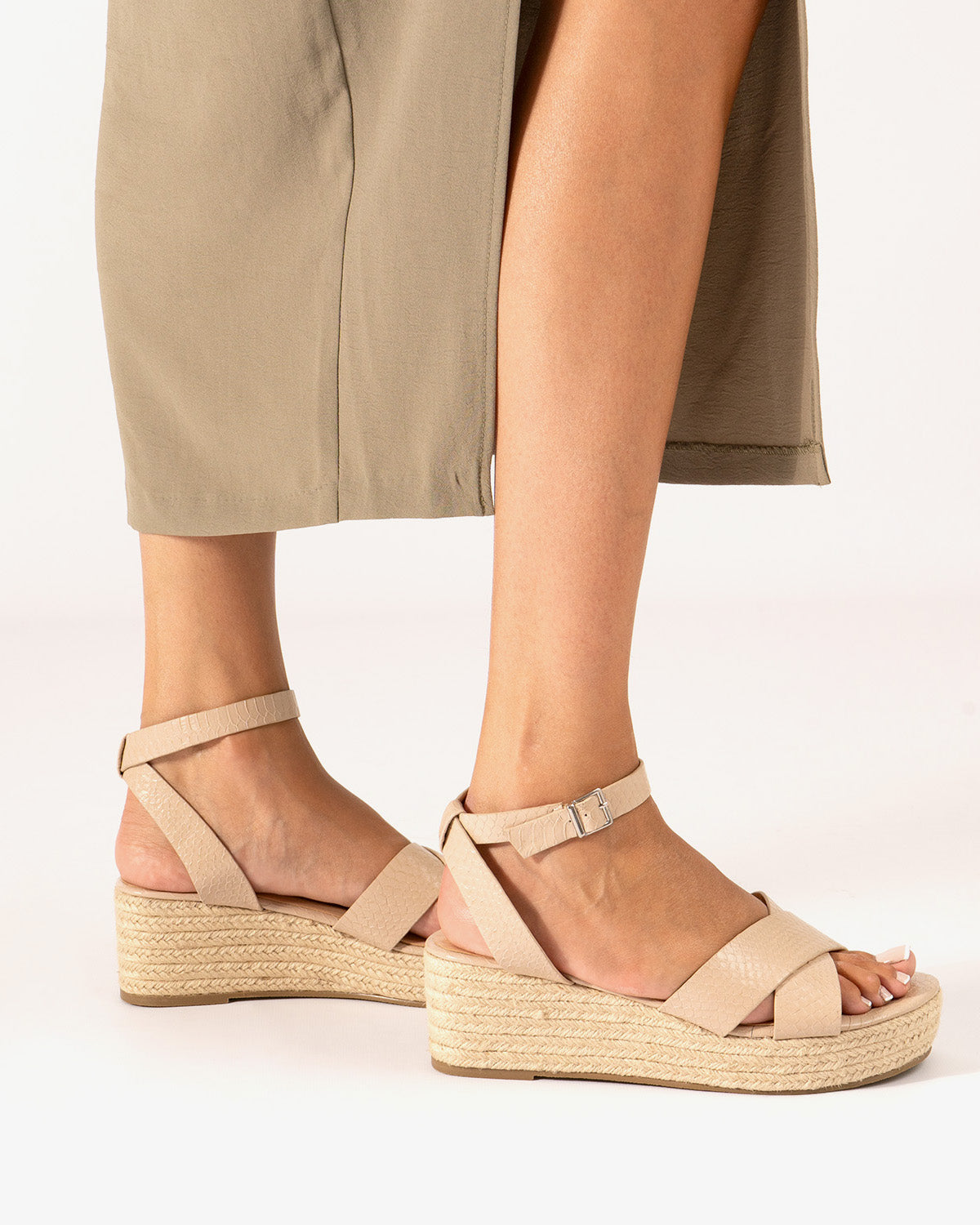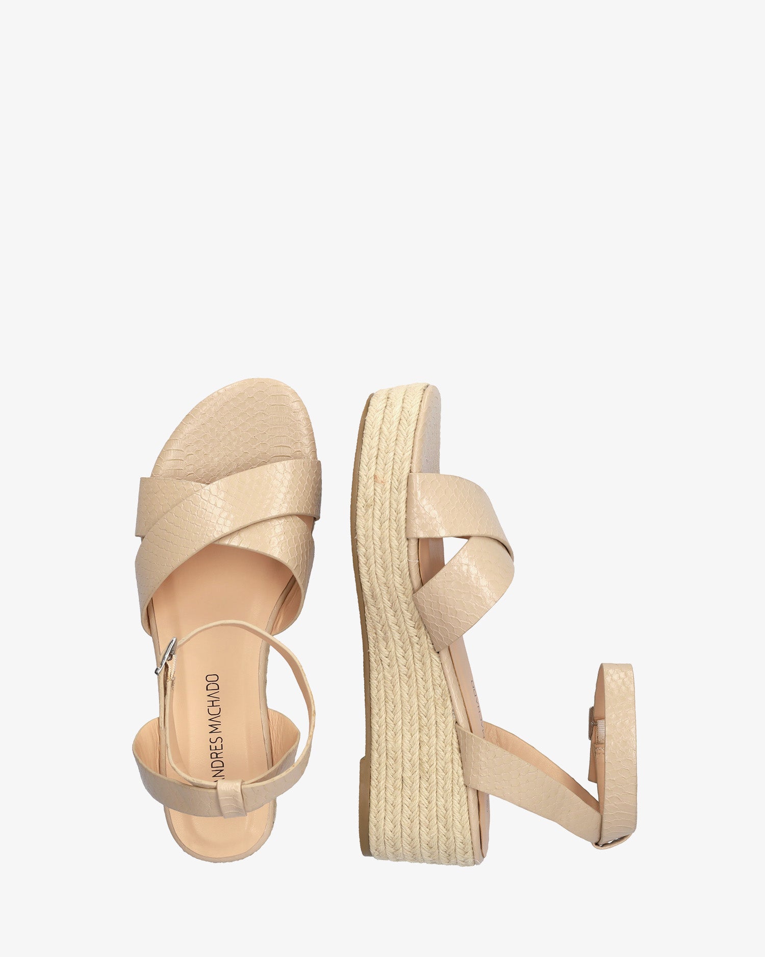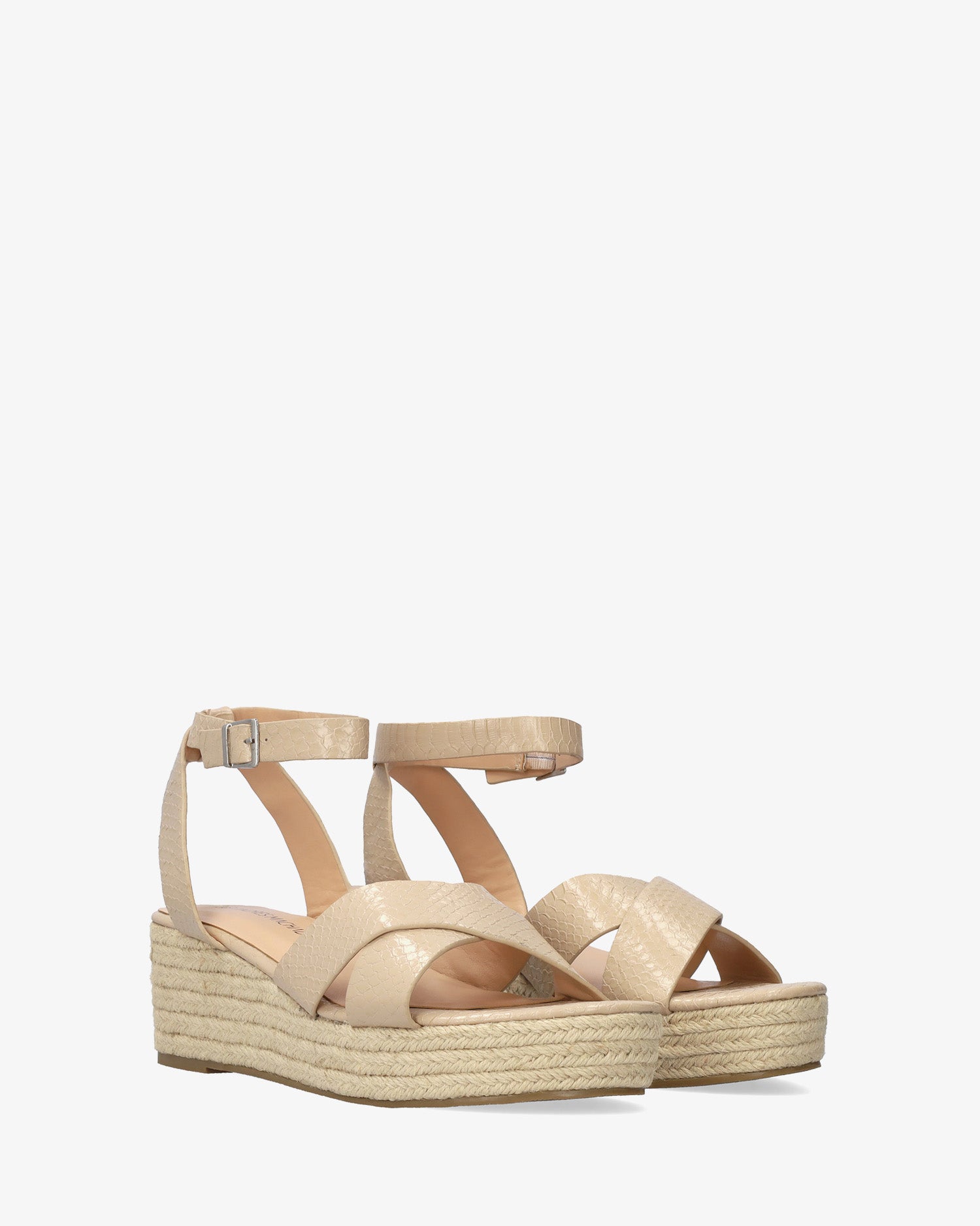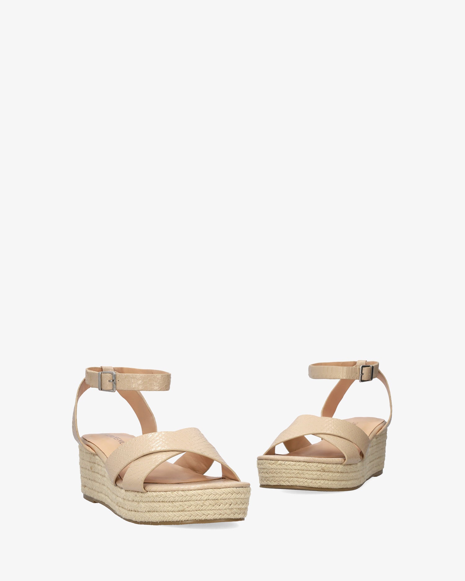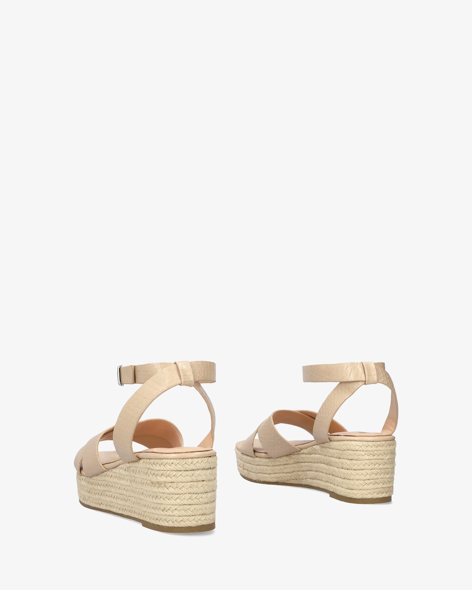 Keilsandalette aus Jute in weichem Kokos in der Farbe Makeup. Rückenfreies Design mit breiten, passenden überkreuzten Trägern vorne. Metallschnallenverschluss und hintere Einstellung für besseren Knöchelhalt. Offene und abgerundete Spitze. Keilabsatz und Plateau vorne aus Jute. 6 cm Keilabsatz und 3 cm Plateau für die kleinen Größen 32 bis 35. 6,5 cm Keilabsatz und 3 cm Plateau für die großen Größen 42 bis 46.