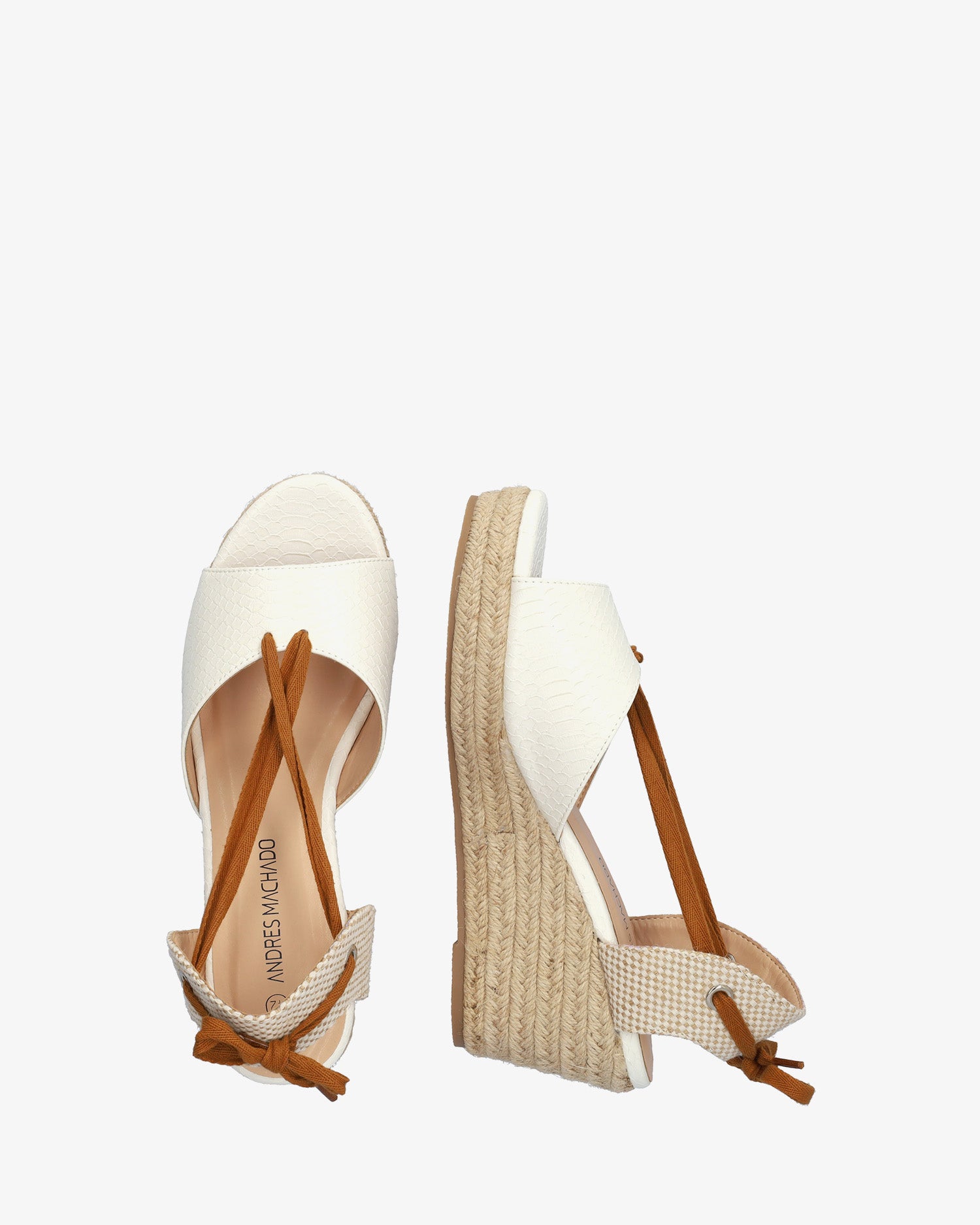 Jute-Keilsandale in zartem Weiß. Halbhoher Absatz mit Spitzendetail, das von vorne bis zum Knöchel verläuft. Abgerundete, offene Spitze. Jute-Keil und Plateau vorne. 7 cm Keil und 2 cm Plateau bei den kleinen Größen 32 bis 35. 8 cm Keil und 2,5 cm Plateau bei den großen Größen 42 bis 46. Bei diesem Modell kann es zu Maßabweichungen vom Standard kommen, wir empfehlen Ihnen, die cm-Angaben der Innensohle bzw. Brandsohle zu überprüfen.