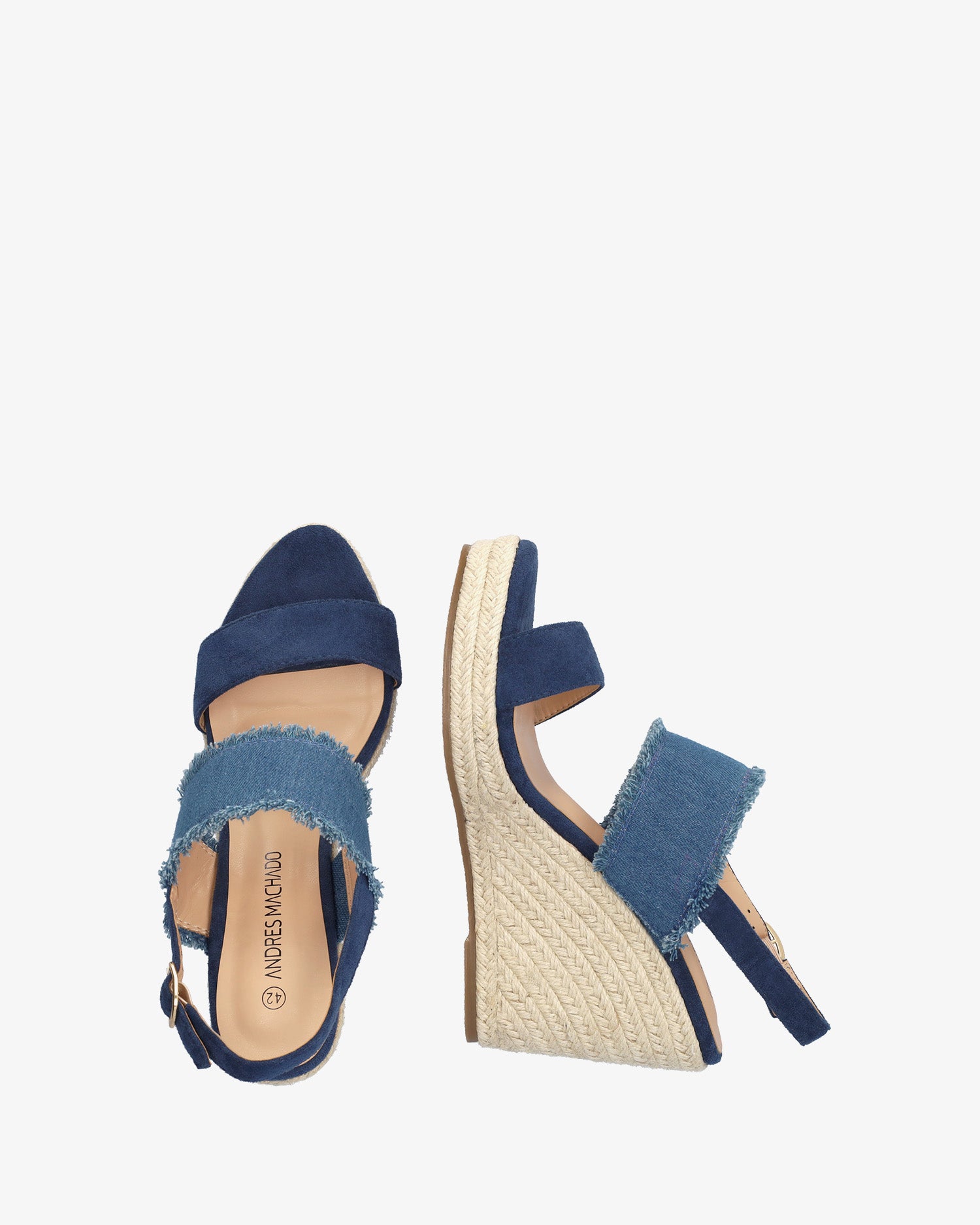 Blaue Sandale ohne Fersenteil in Wildlederoptik mit hohem Keilabsatz. Rückenfreies Design mit zwei breiten Trägern, einer vorne aus Wildleder und der andere auf dem Spann im Cowboy-Stil. Goldener Schnallenverschluss mit passendem Riemen an der Seite. Offene und abgerundete Spitze. Keilabsatz und Plateau vorne aus Jute. 11 cm Keilabsatz und 3 cm Plateau für die kleinen Größen 32 bis 35. 12 cm Keilabsatz und 3 cm Plateau für die großen Größen 42 bis 46.