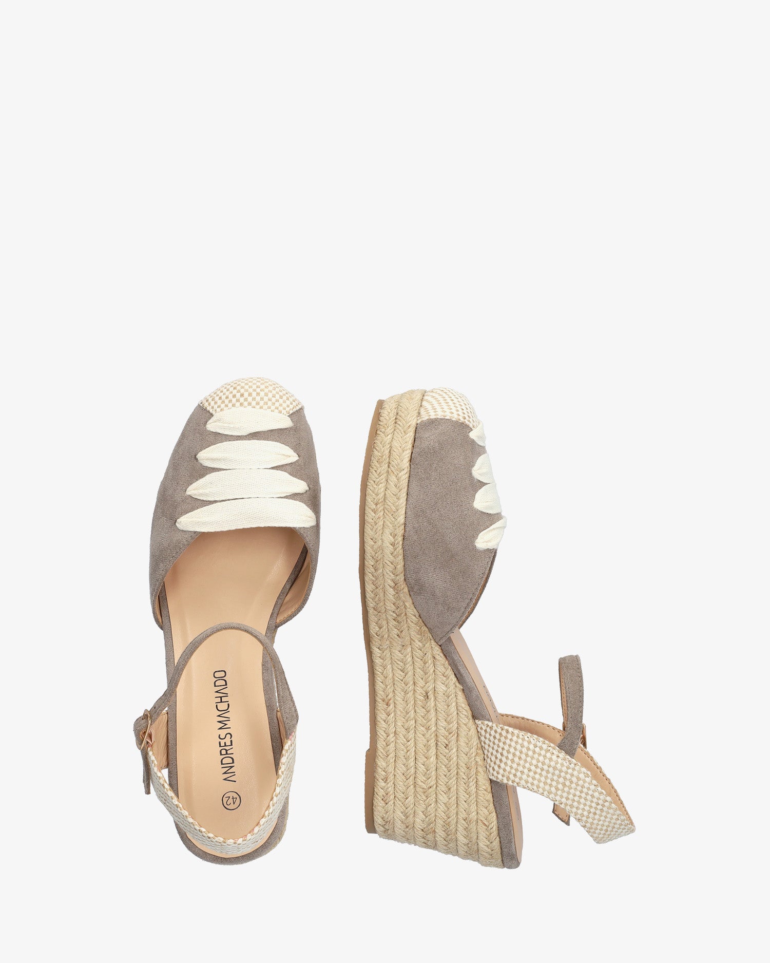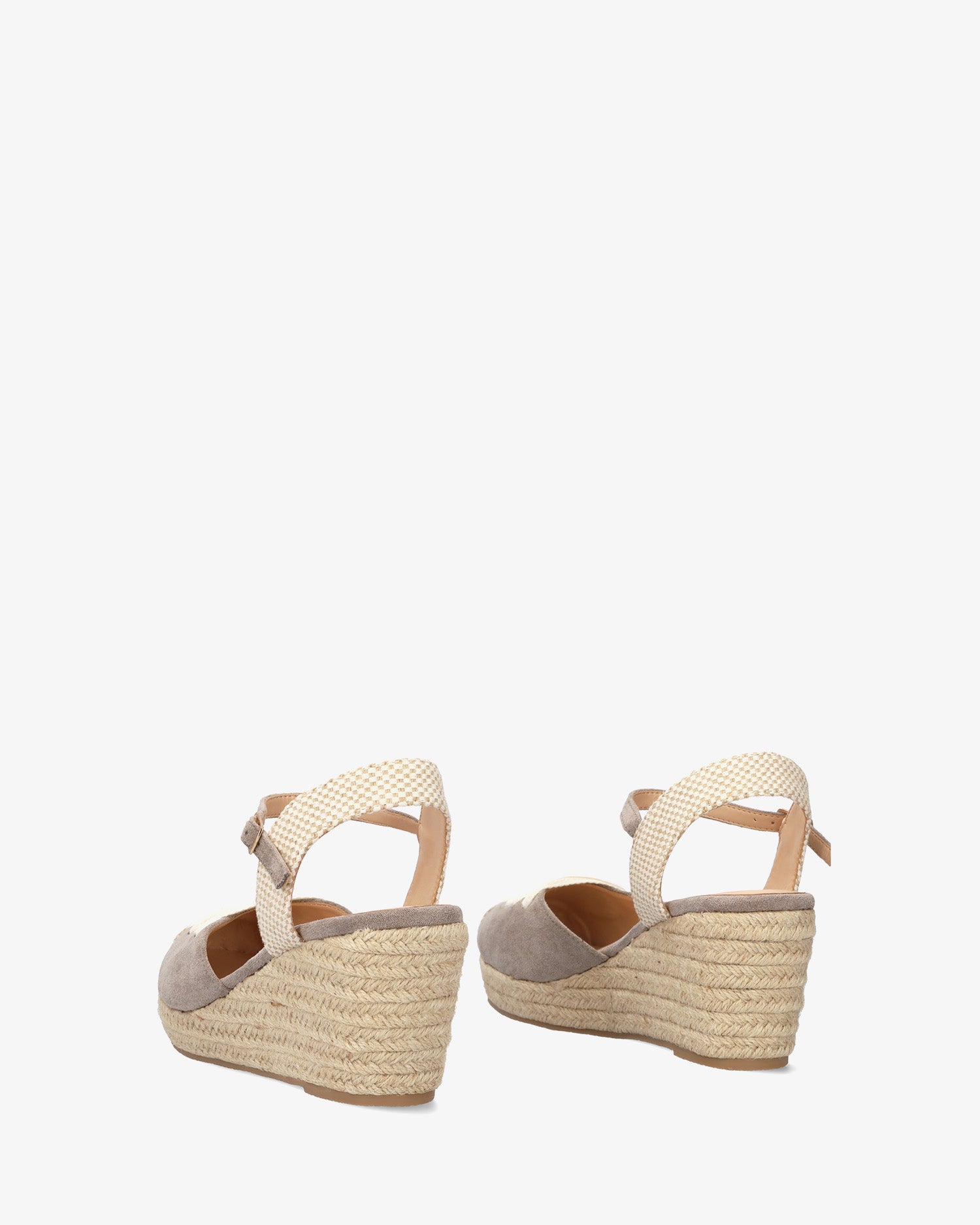 Graue Keilsandale aus Jute in Wildlederoptik. Slingback-Design mit abgerundeter, geschlossener Spitze, Stoffdetails und breiten Schnürsenkeln vorne. Metallschnallenverschluss mit passendem Riemen für besseren Knöchelhalt. Jute-Keil und Plateau vorne. 7 cm Keilabsatz und 2 cm Plateau bei den kleinen Größen 32 bis 35. 8 cm Keilabsatz und 2,5 cm Plateau bei den großen Größen 42 bis 46. Bei diesem Modell kann es zu Maßabweichungen vom Standard kommen, wir empfehlen Ihnen, die cm-Angaben der Innensohle bzw. Brandsohle zu überprüfen.
