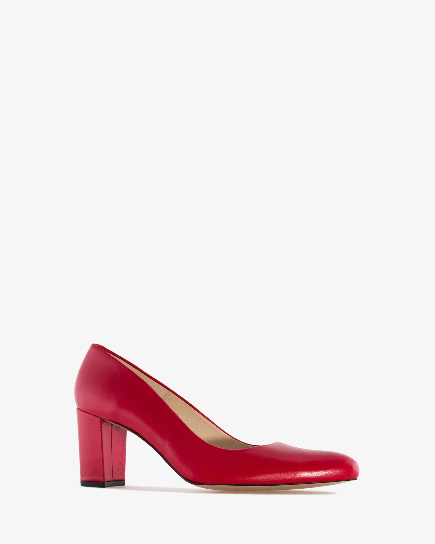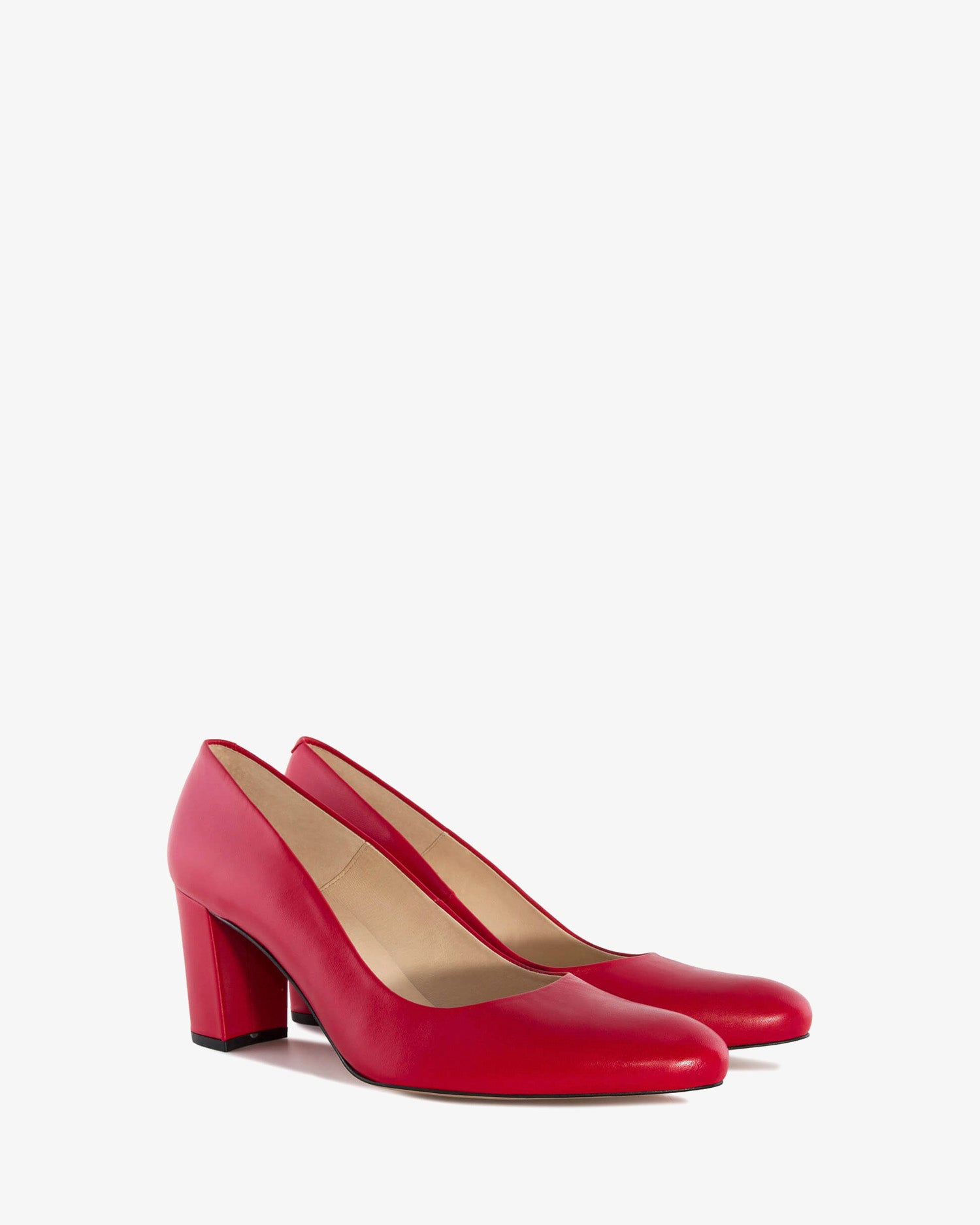 Rote Lederlounge. Kamelfarbenes Lederfutter und Innensohle. 7 cm breiter, Ton-in-Ton gefütterter Absatz für die kleinen Größen 32 bis 35. 7,5 cm Absatz für die mittleren Größen 36 bis 41. 8 cm Absatz für die großen Größen 42 bis 45. Hergestellt in Spanien. Dieses Modell fällt groß aus, daher empfiehlt es sich, eine Nummer kleiner als üblich zu wählen.