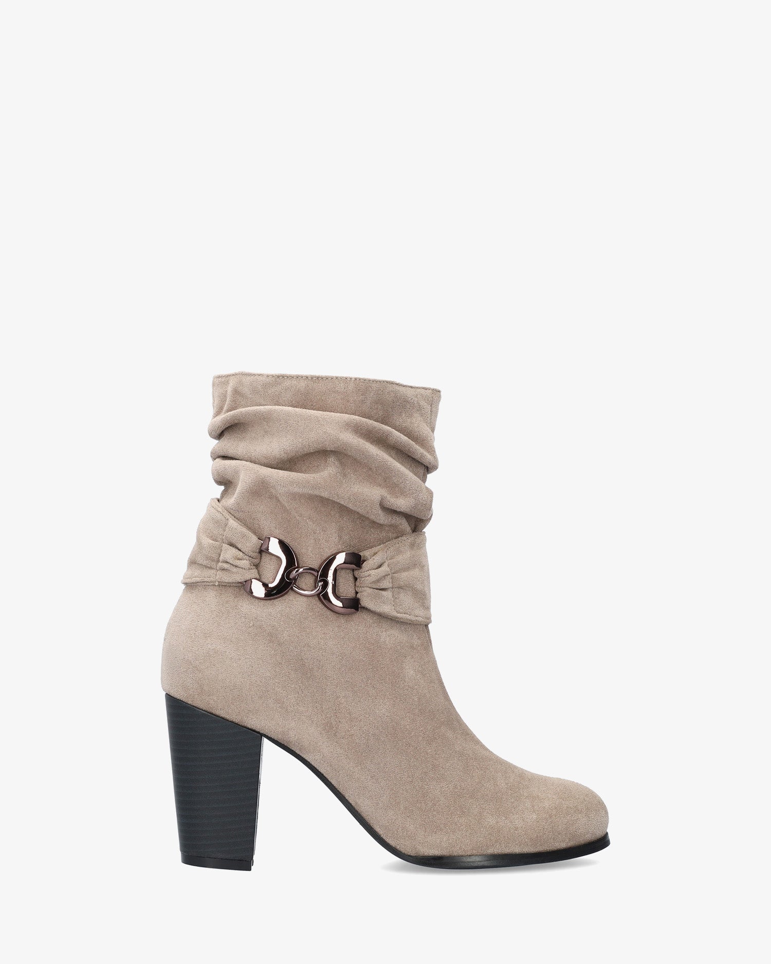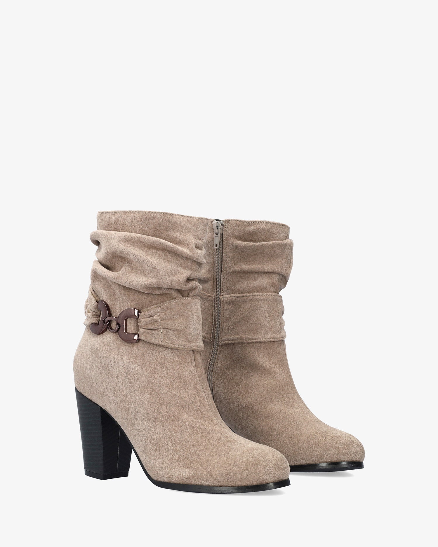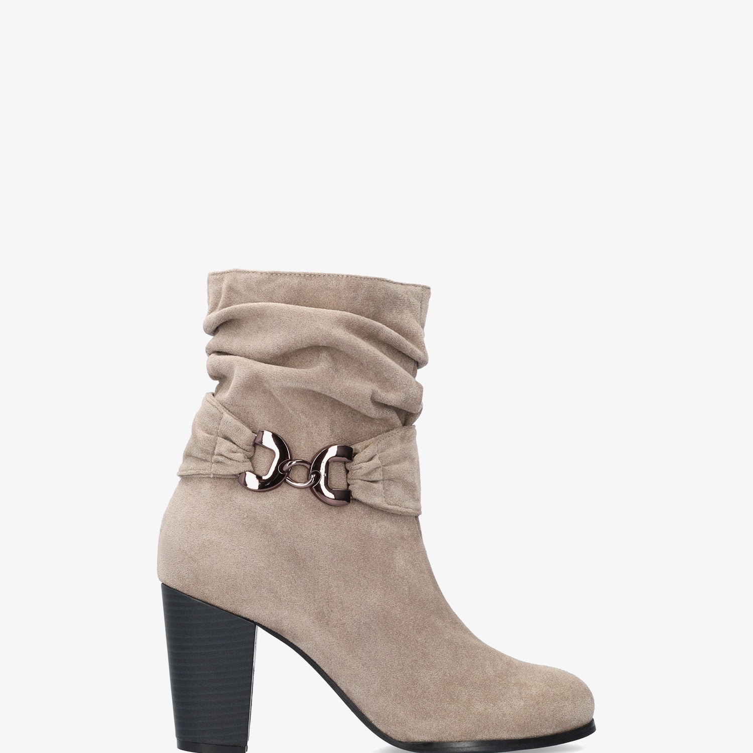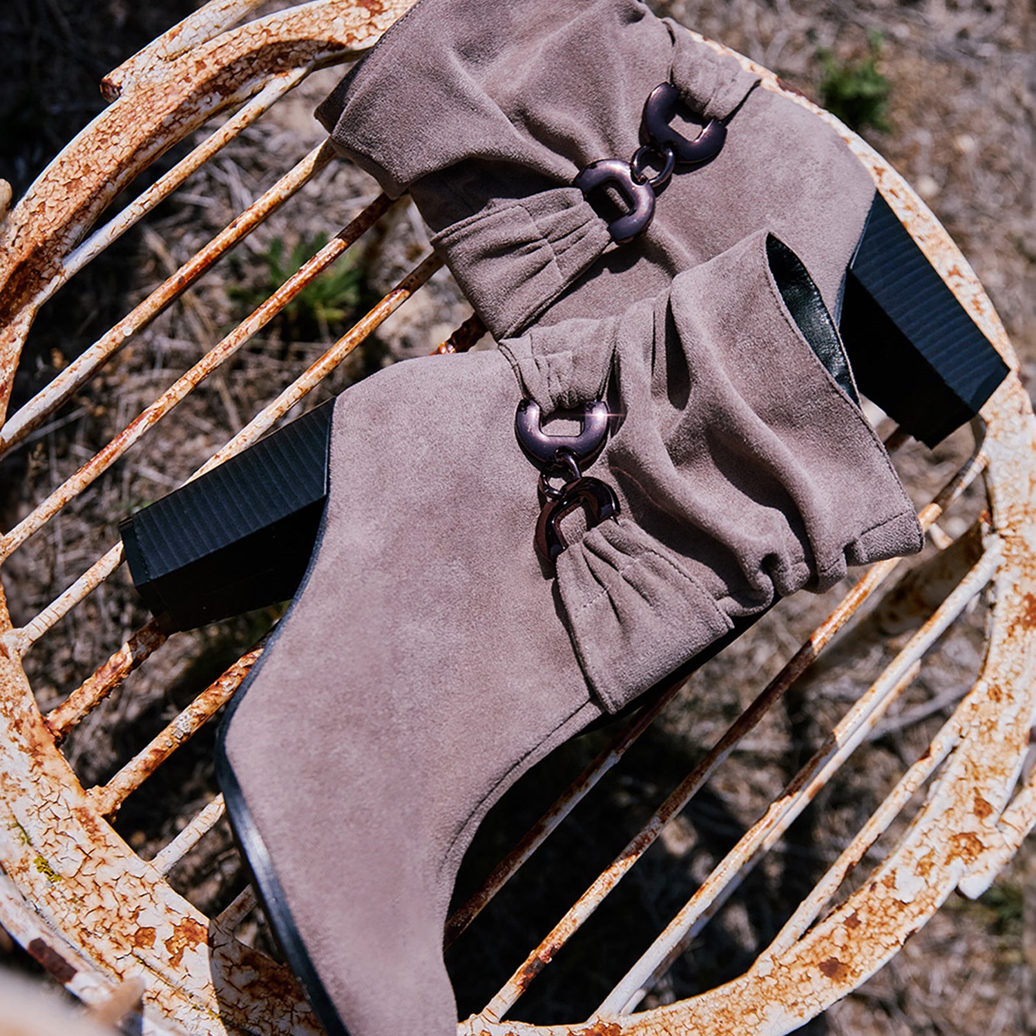 Hohe Stiefelette aus grauem Wildleder mit passendem Innenreißverschluss. Breiter Riemen um den Knöchel mit silberner Schnalle an der Außenseite und gekräuseltem Schaftdetail am Knöchel. Runde Zehenpartie. 7,5 cm quadratischer Absatz für kleine Größen 32 bis 35. 10 cm Absatz für große Größen 42 bis 45.
