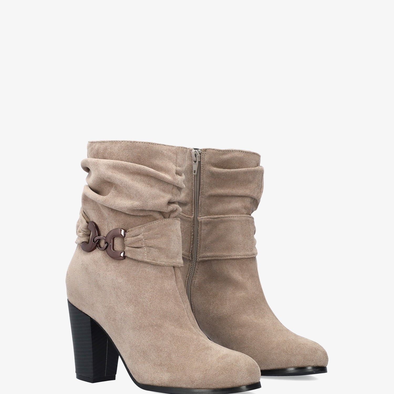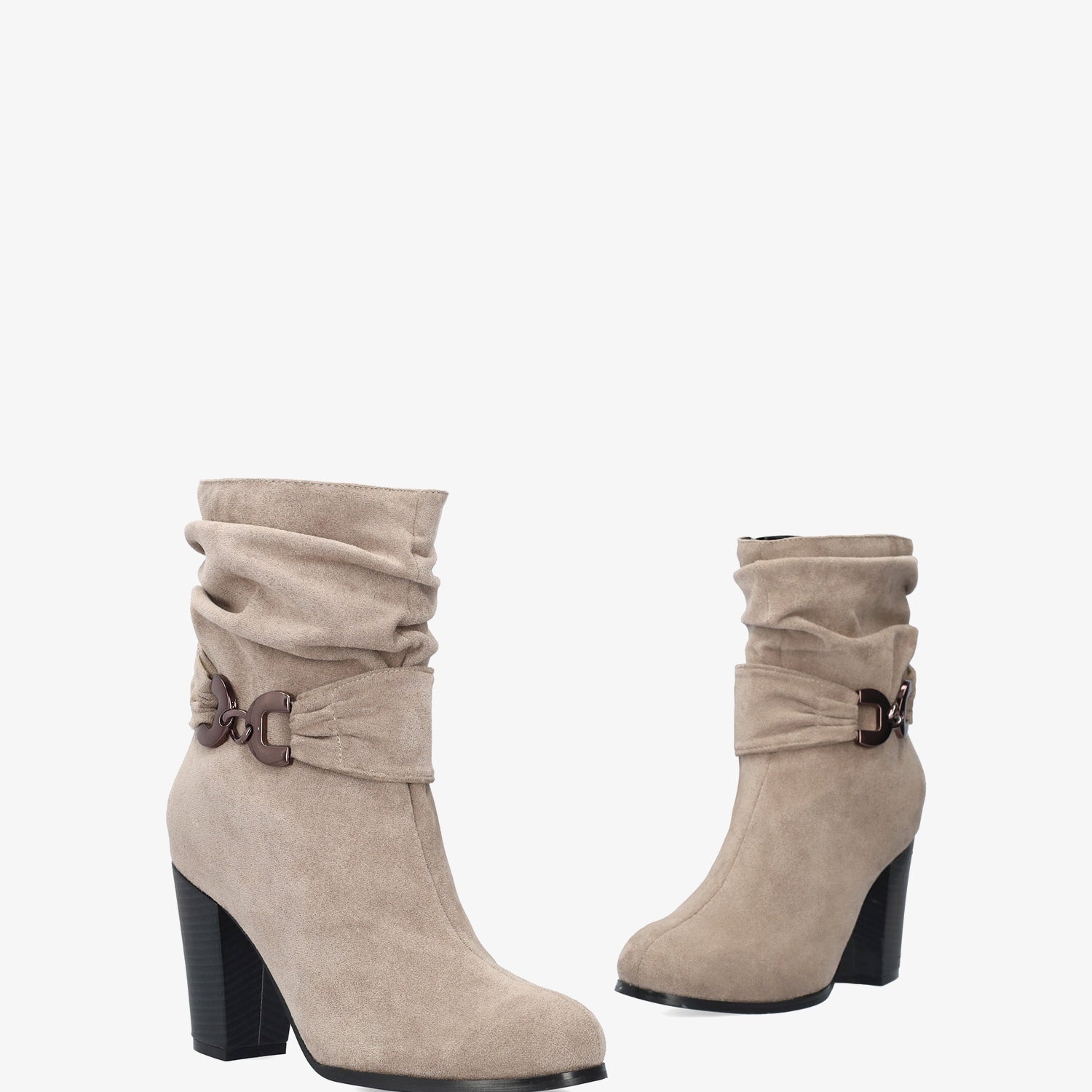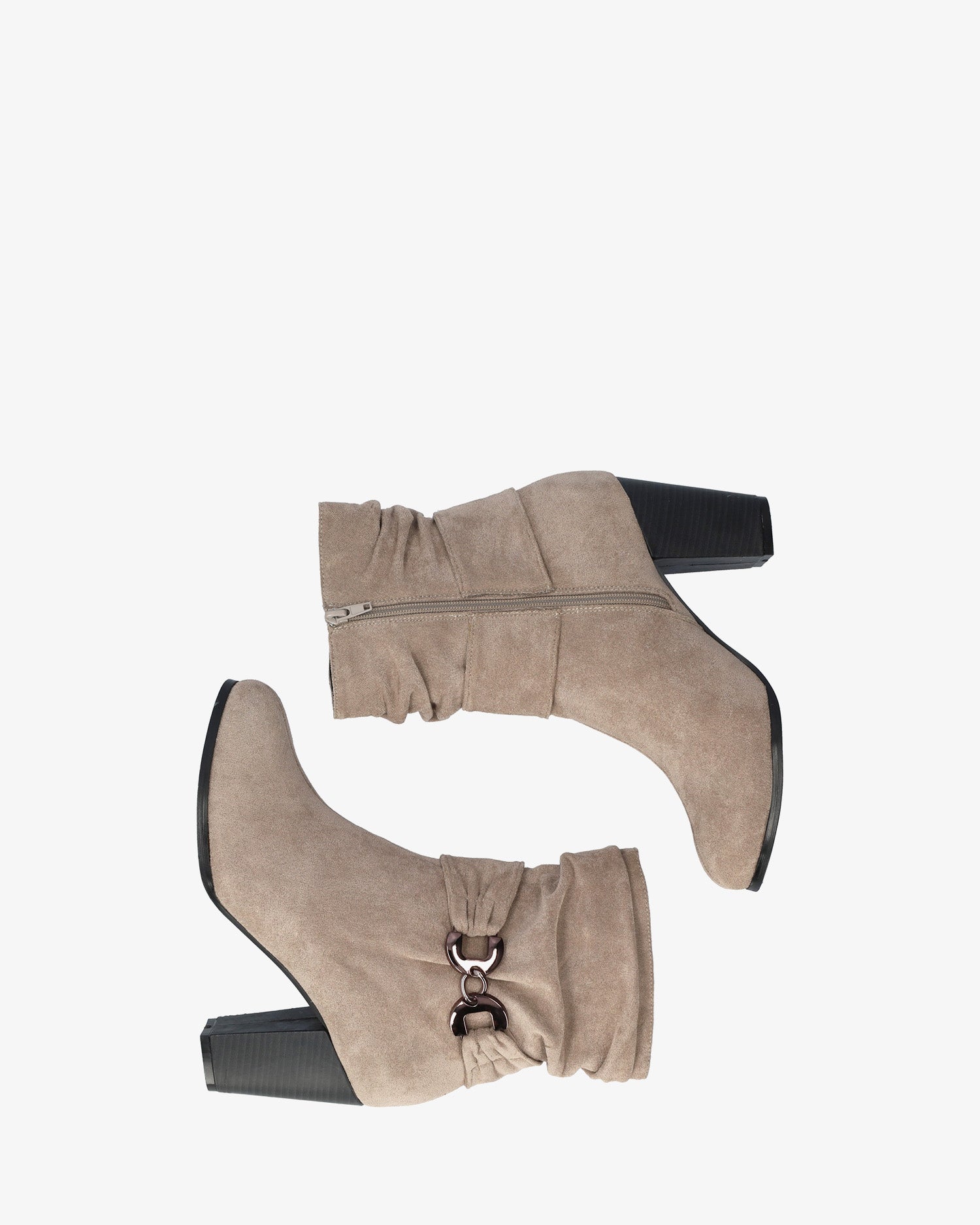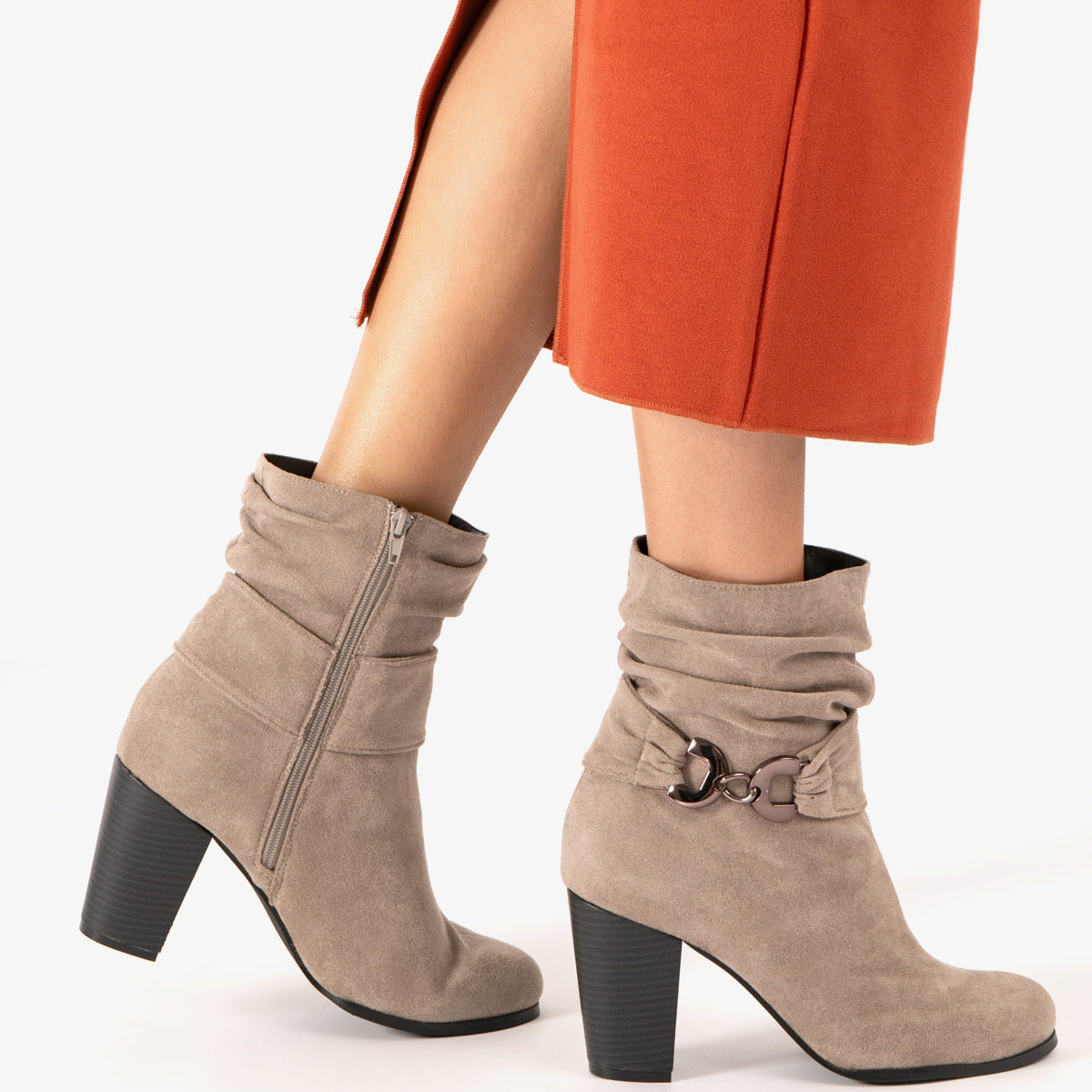 Hohe Stiefelette aus grauem Wildleder mit passendem Innenreißverschluss. Breiter Riemen um den Knöchel mit silberner Schnalle an der Außenseite und gekräuseltem Schaftdetail am Knöchel. Runde Zehenpartie. 7,5 cm quadratischer Absatz für kleine Größen 32 bis 35. 10 cm Absatz für große Größen 42 bis 45.