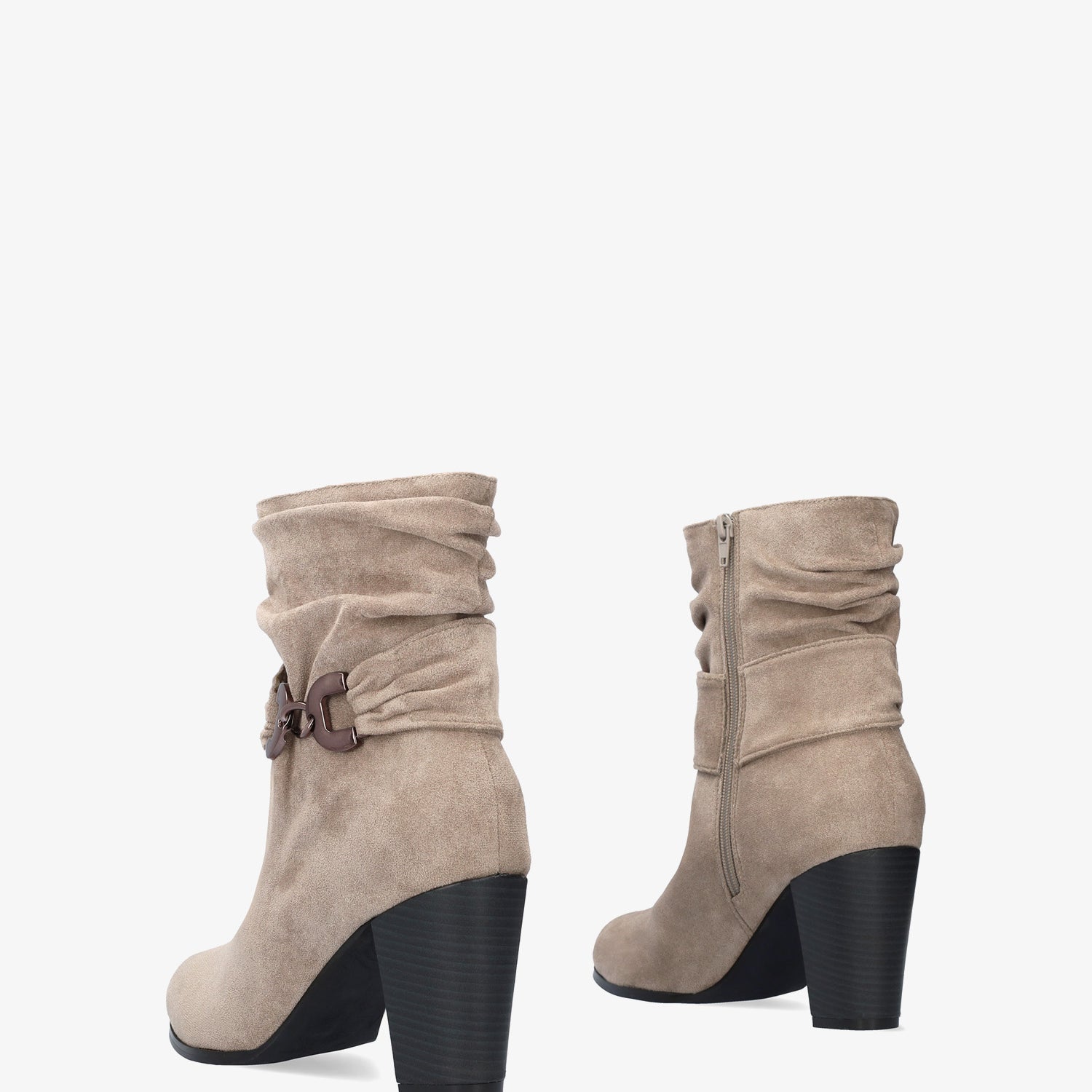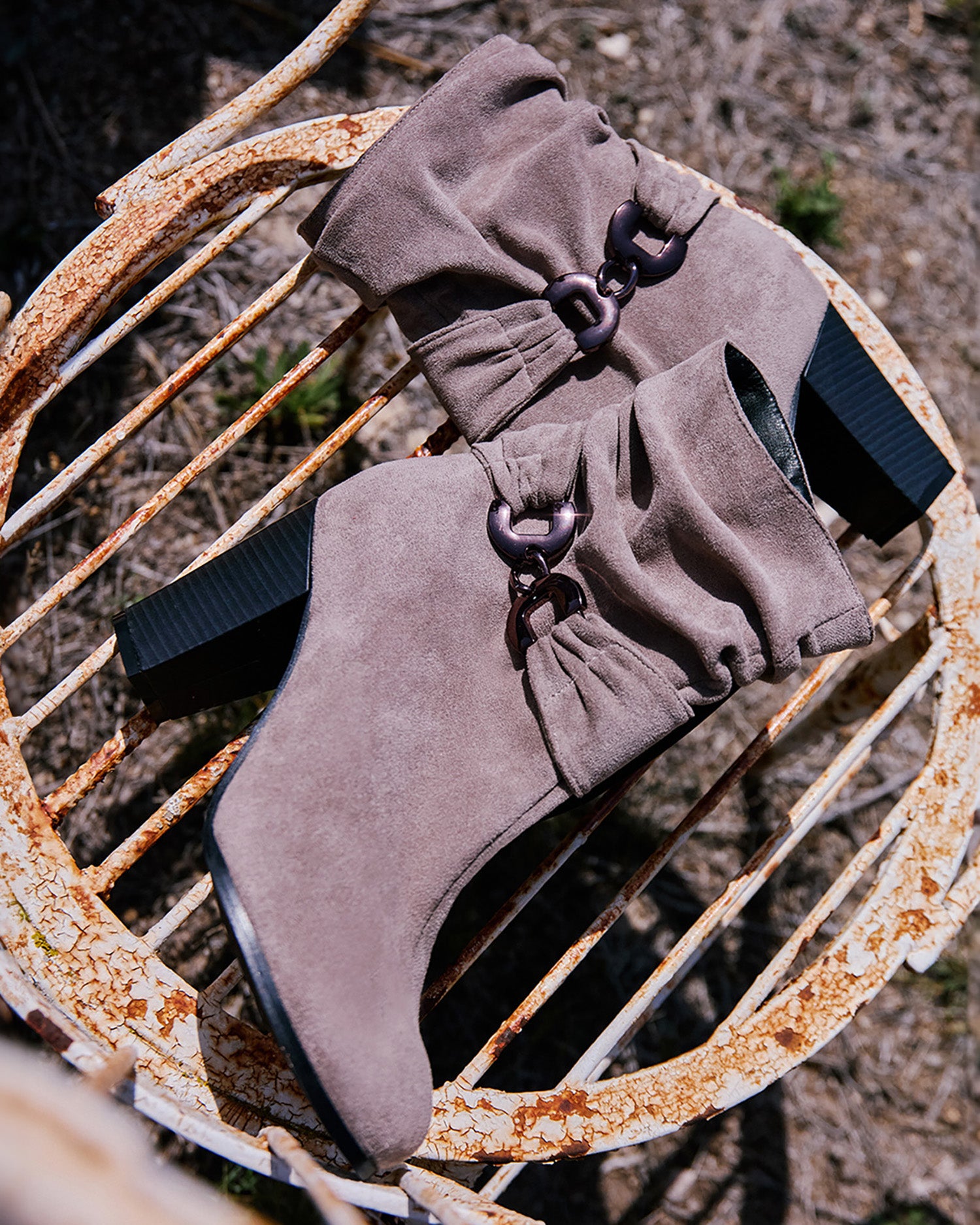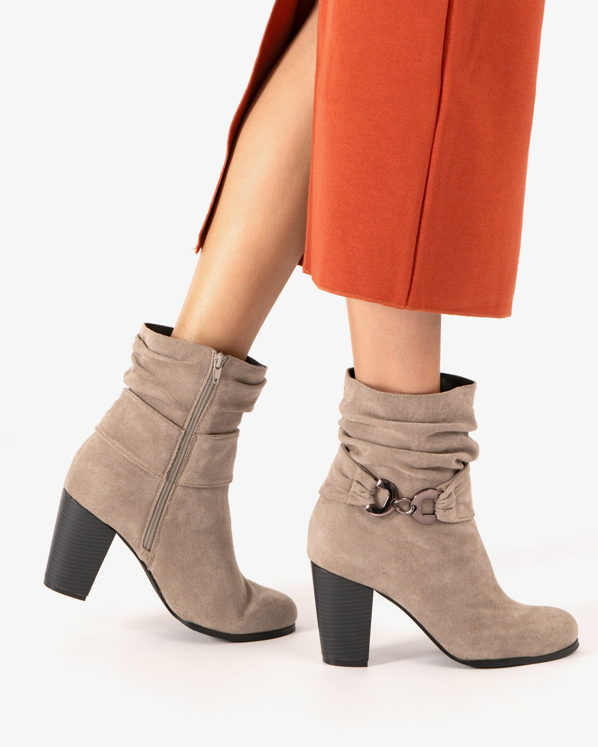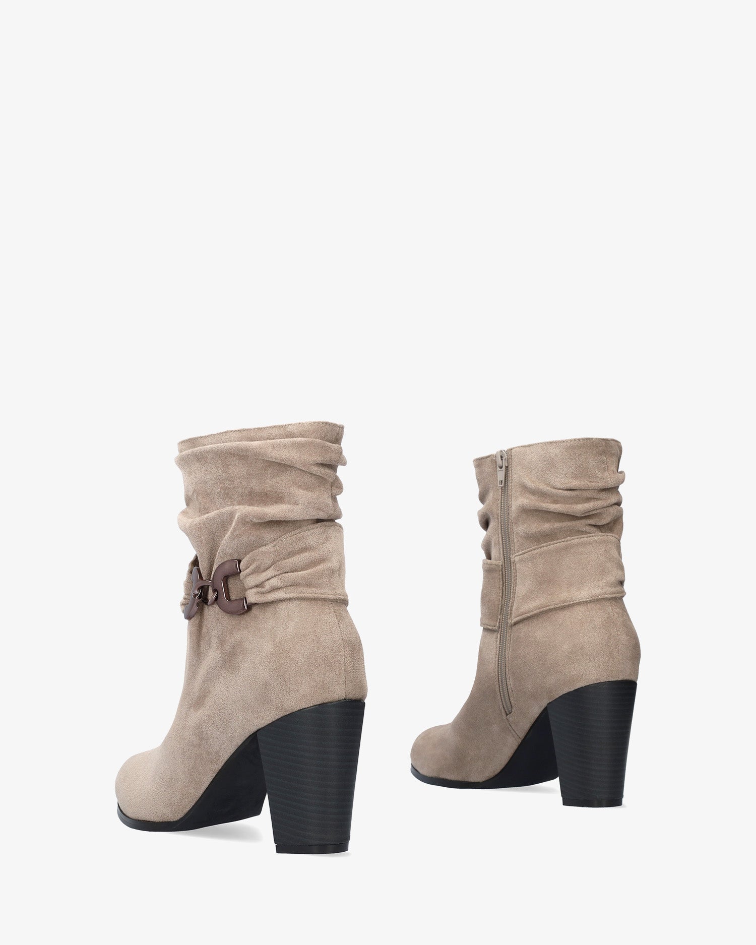 Hohe Stiefelette aus grauem Wildleder mit passendem Innenreißverschluss. Breiter Riemen um den Knöchel mit silberner Schnalle an der Außenseite und gekräuseltem Schaftdetail am Knöchel. Runde Zehenpartie. 7,5 cm quadratischer Absatz für kleine Größen 32 bis 35. 10 cm Absatz für große Größen 42 bis 45.