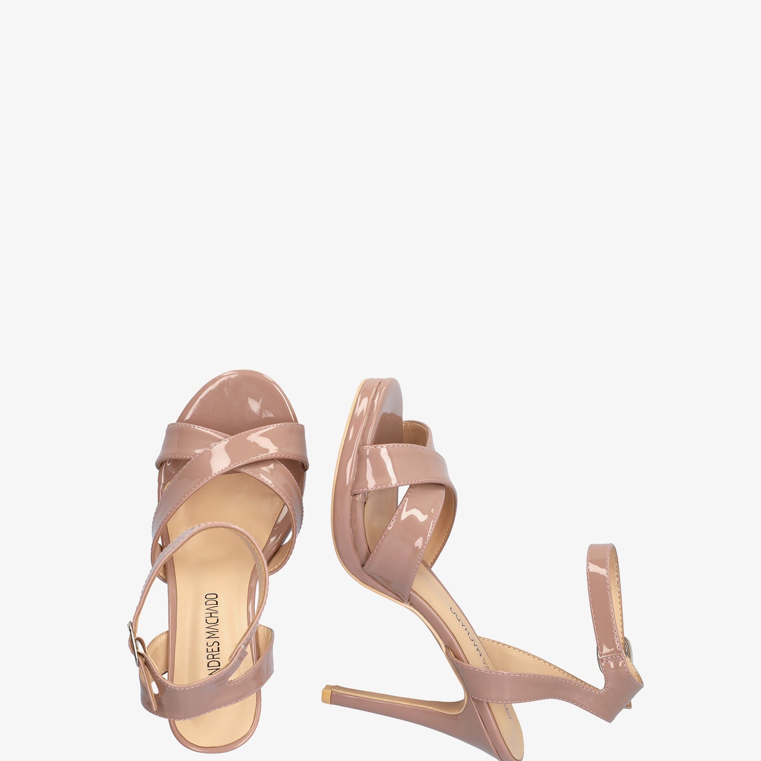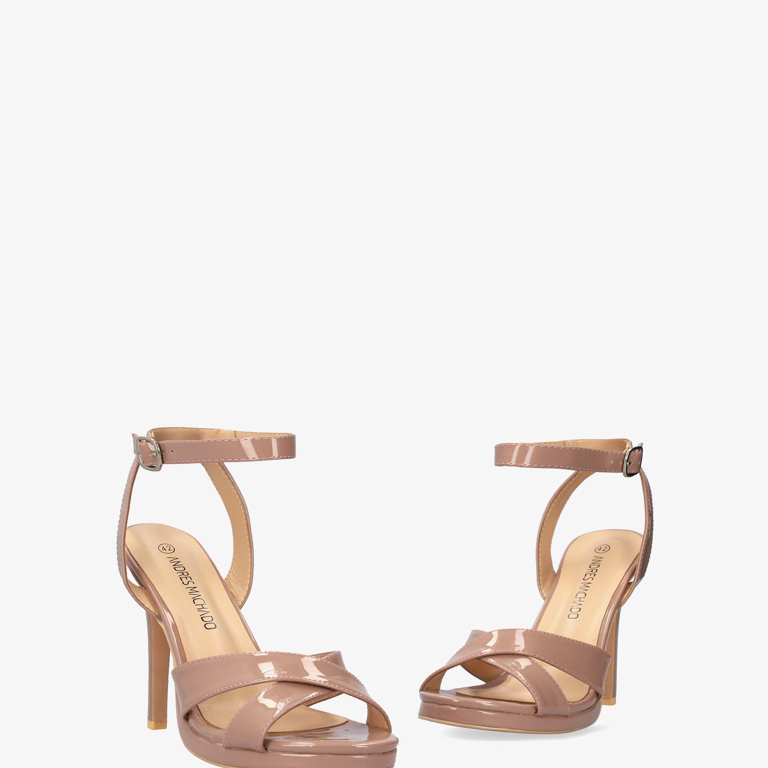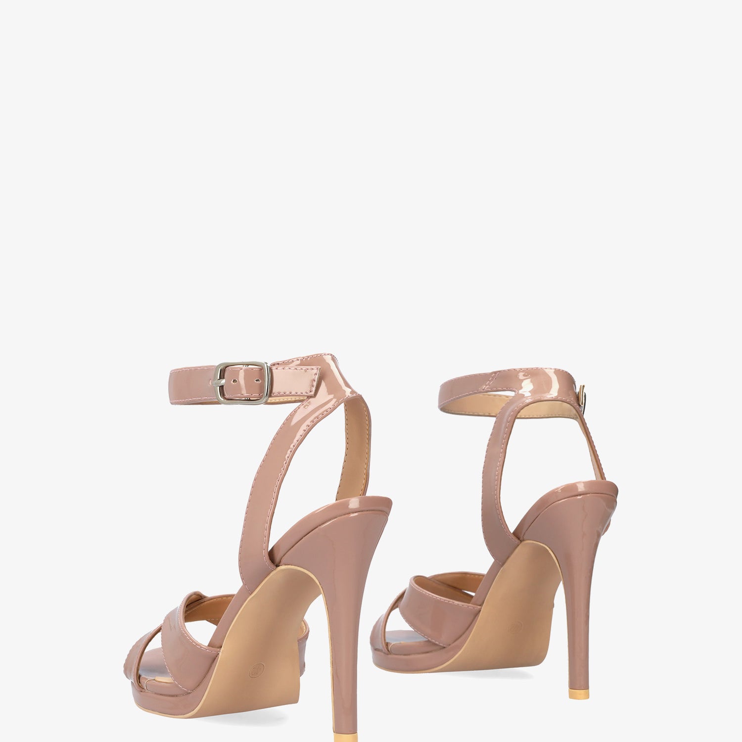 Lackledersandale in Make-up-Farbe. Design mit offener und abgerundeter Zehenpartie, überkreuzten Riemen vorne und einem Schnallenverschluss mit passendem Knöchelriemen. Ton in Ton gefütterte Ferse. 10,5 cm Absatz und 1 cm Plateau für die kleinen Größen 32 bis 35. 13 cm Absatz und 1,5 cm Plateau für die großen Größen 42 bis 45.