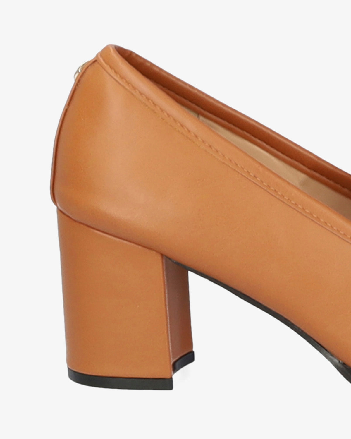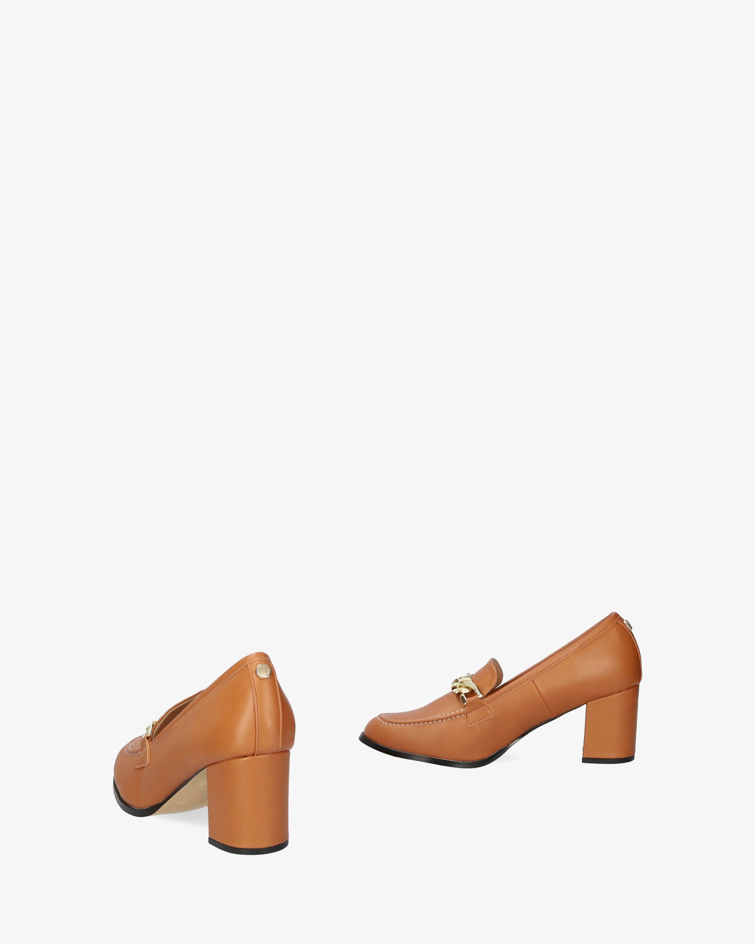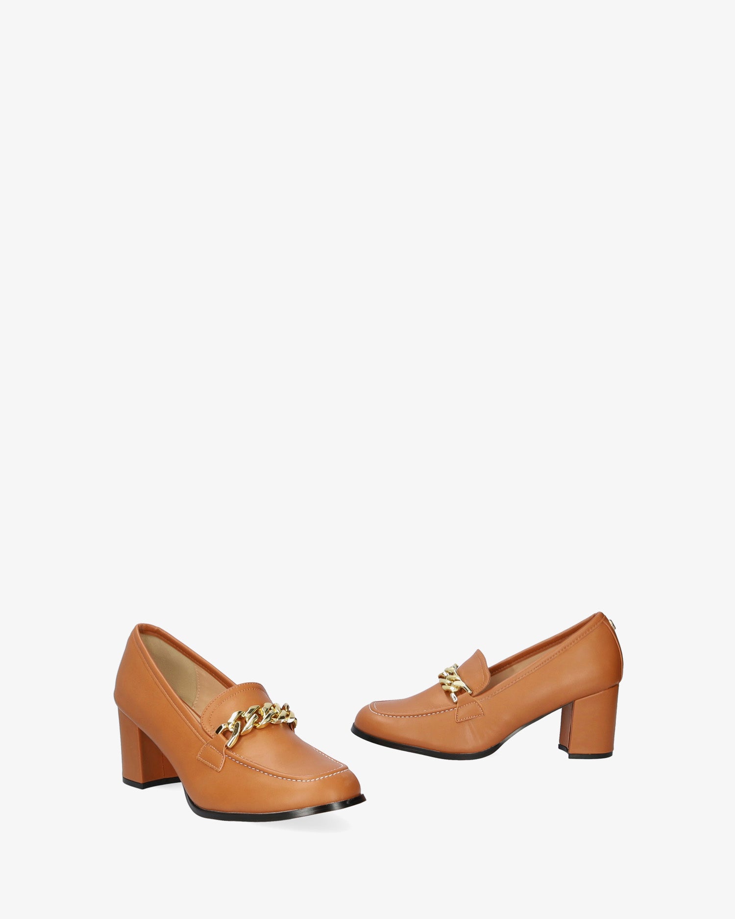 Schuh im Mokassin-Stil in sanfter Kamelfarbe. Detail der goldenen Maxi-Gliederkette an der Spitze. Mandelförmiges Finish. 7 cm breiter, Ton-in-Ton gefütterter Absatz für die kleinen Größen 32 bis 35. 7 cm Absatz für die großen Größen 42 bis 45.