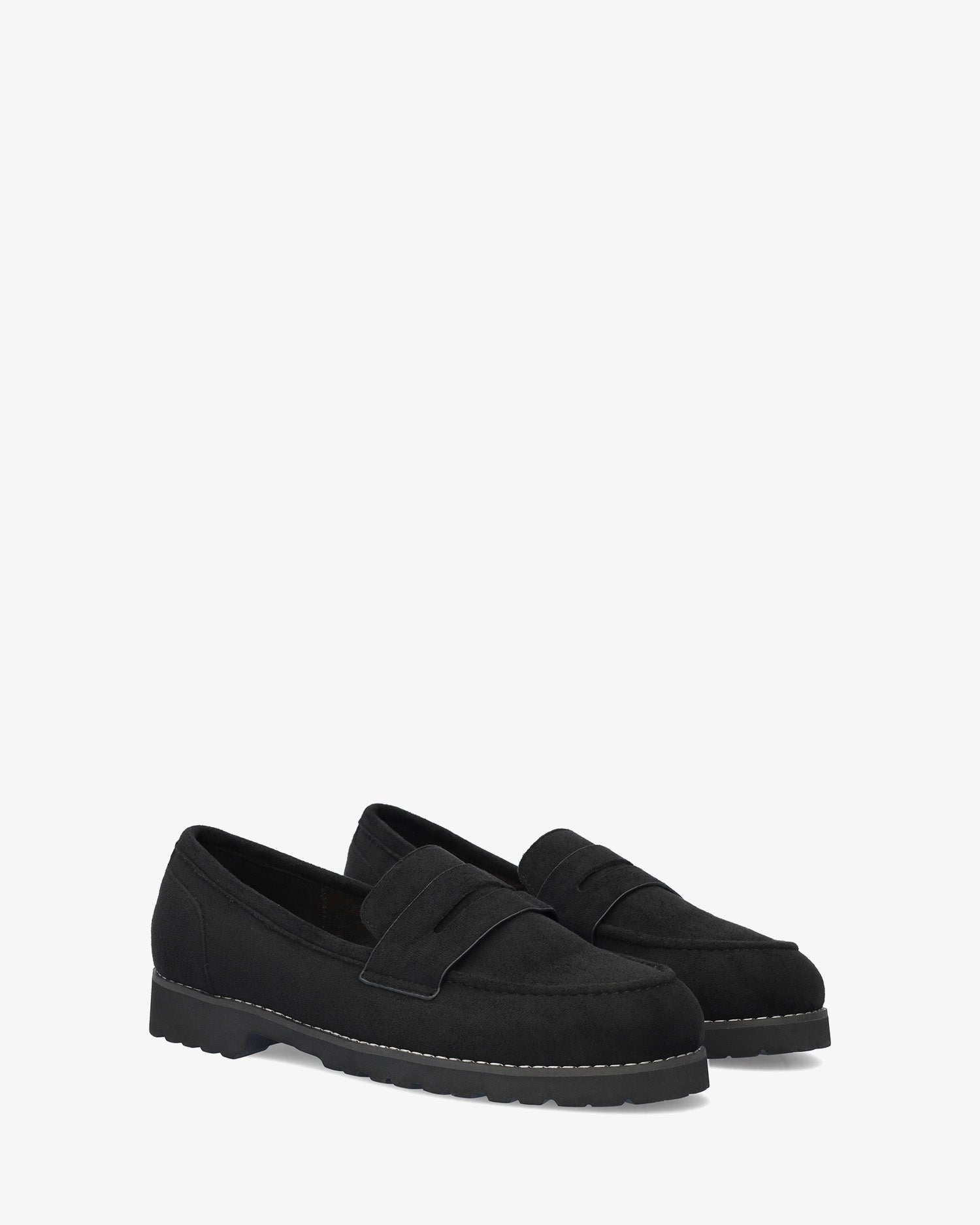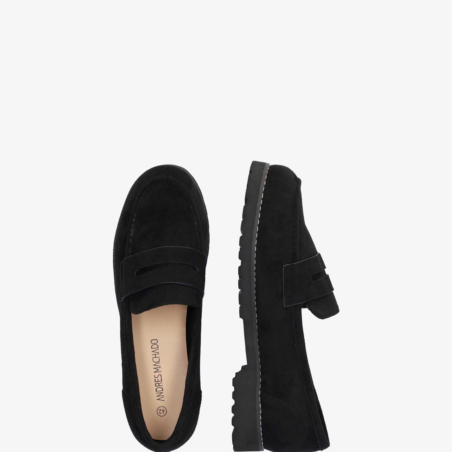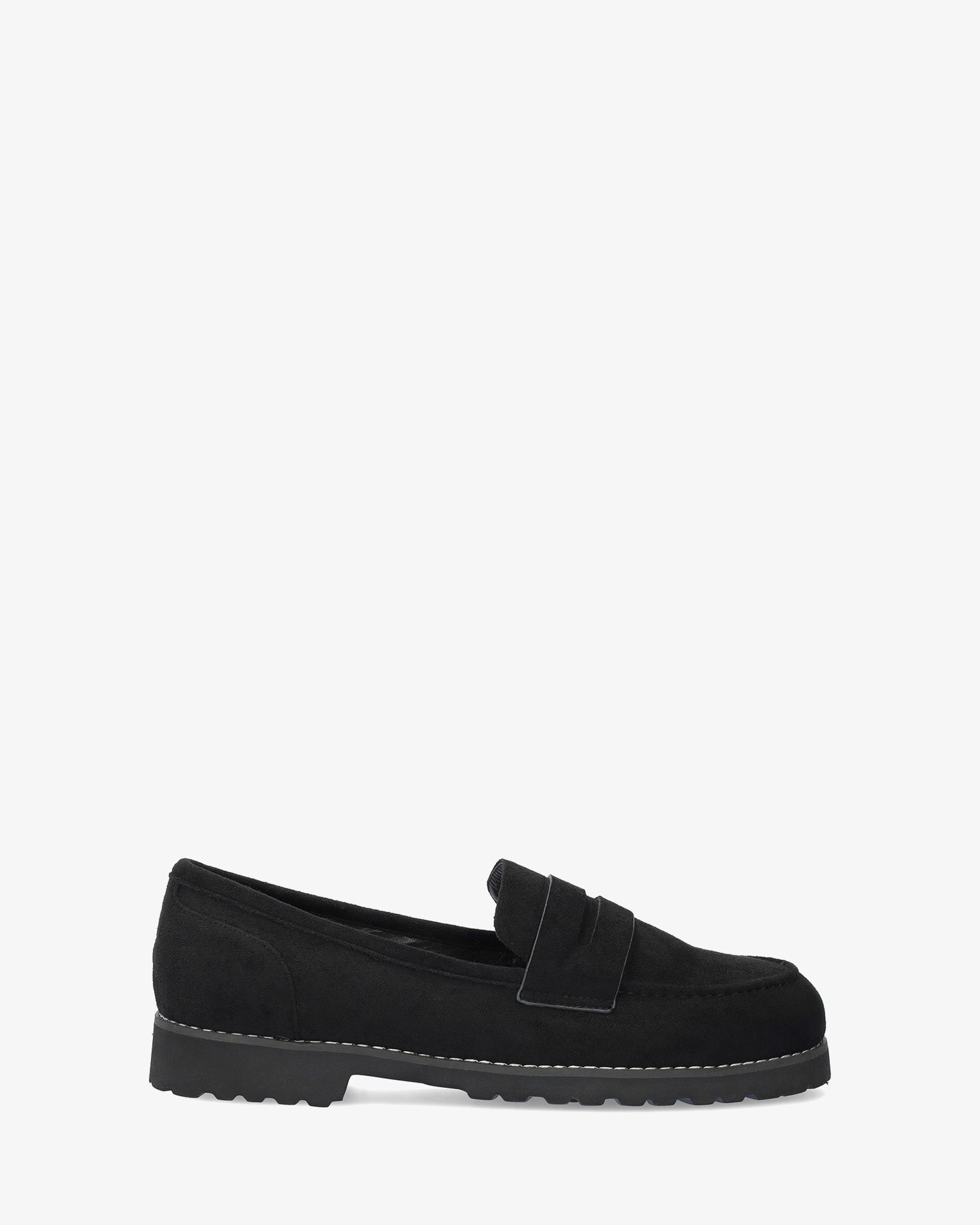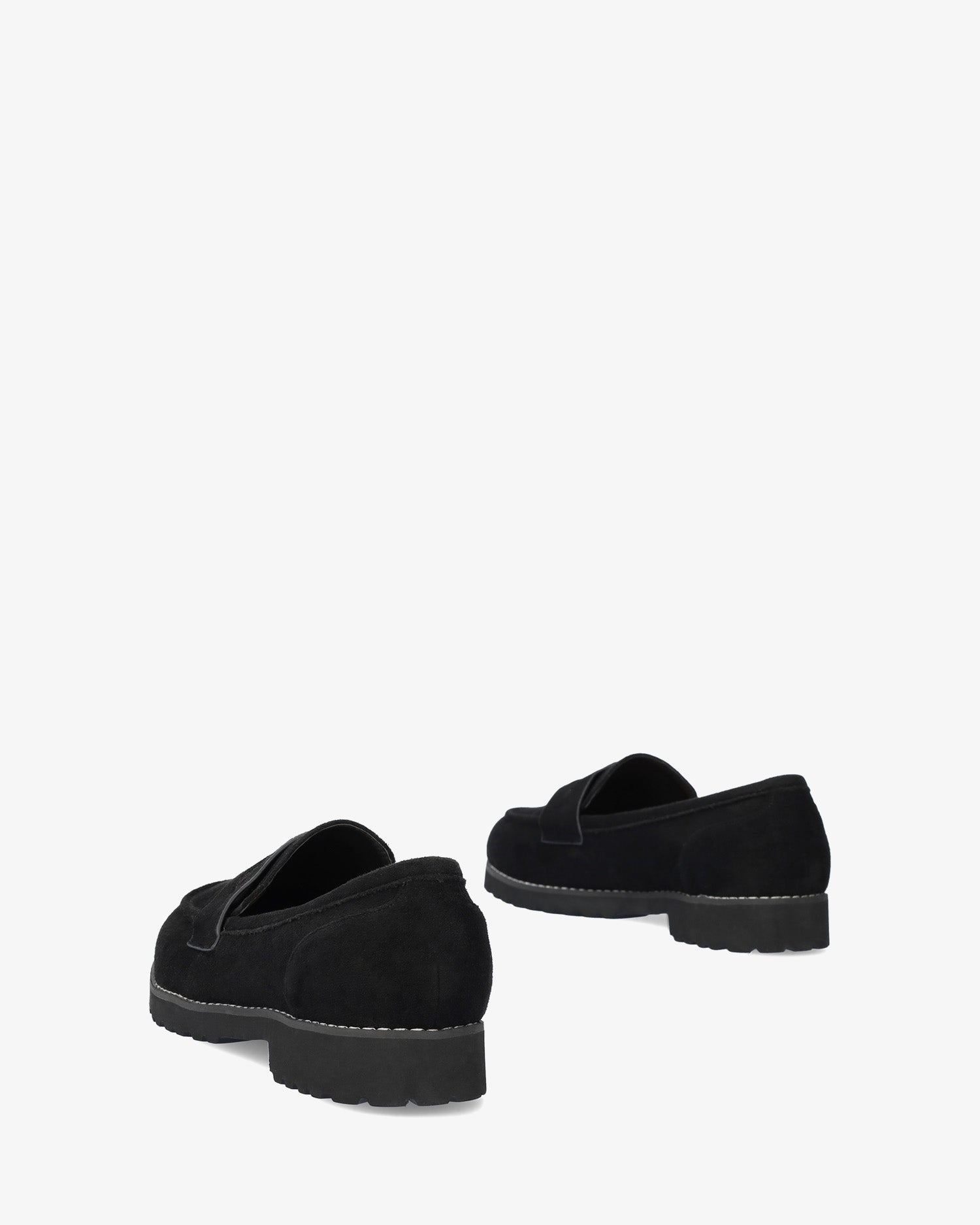 Schwarzer Mokassin in Wildlederoptik. Detail der passenden Maske auf dem Spann. Erhabene Nähte mit passendem Faden an der Spitze. Abgerundete Spitze. Schwarze Gummilaufsohle, 2 cm hoch, für große Größen von 42 bis 45.