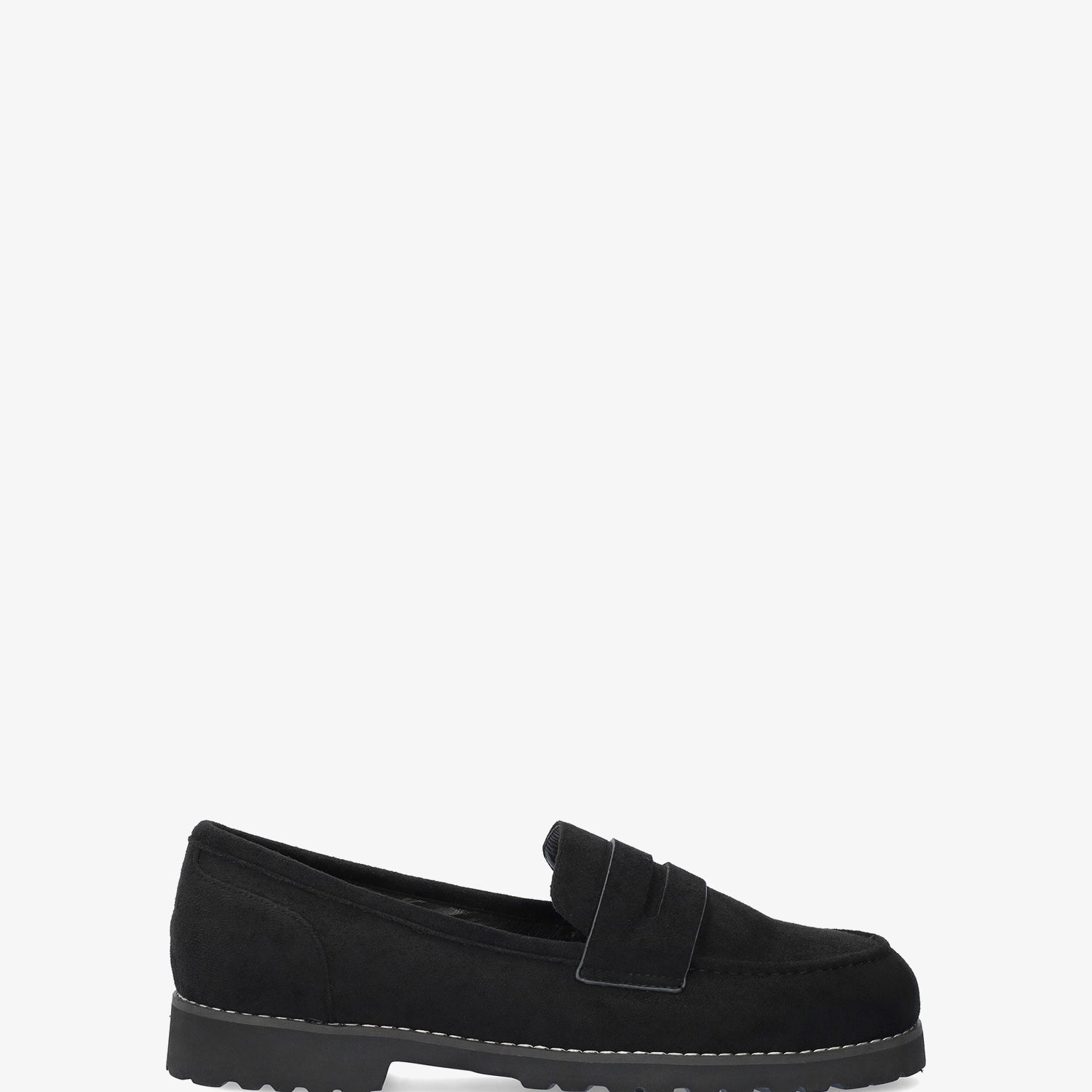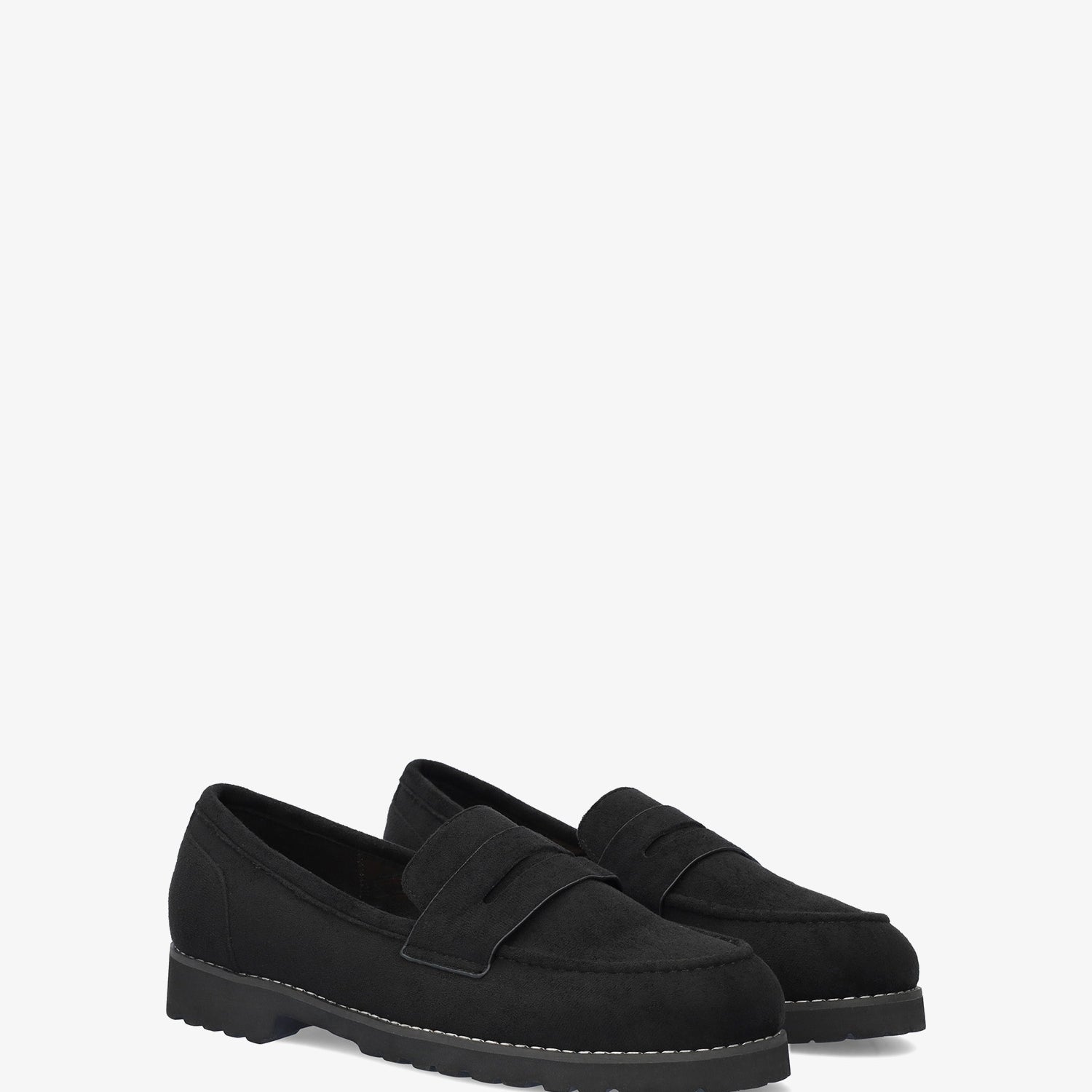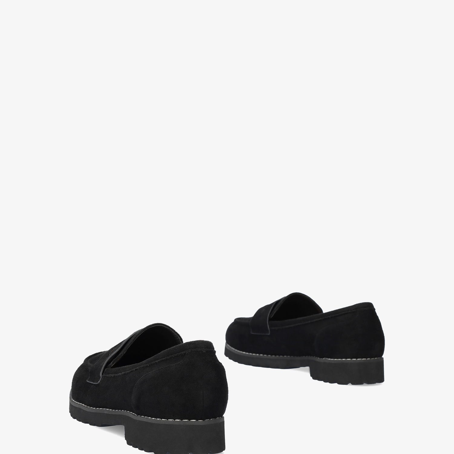 Schwarzer Mokassin in Wildlederoptik. Detail der passenden Maske auf dem Spann. Erhabene Nähte mit passendem Faden an der Spitze. Abgerundete Spitze. Schwarze Gummilaufsohle, 2 cm hoch, für große Größen von 42 bis 45.