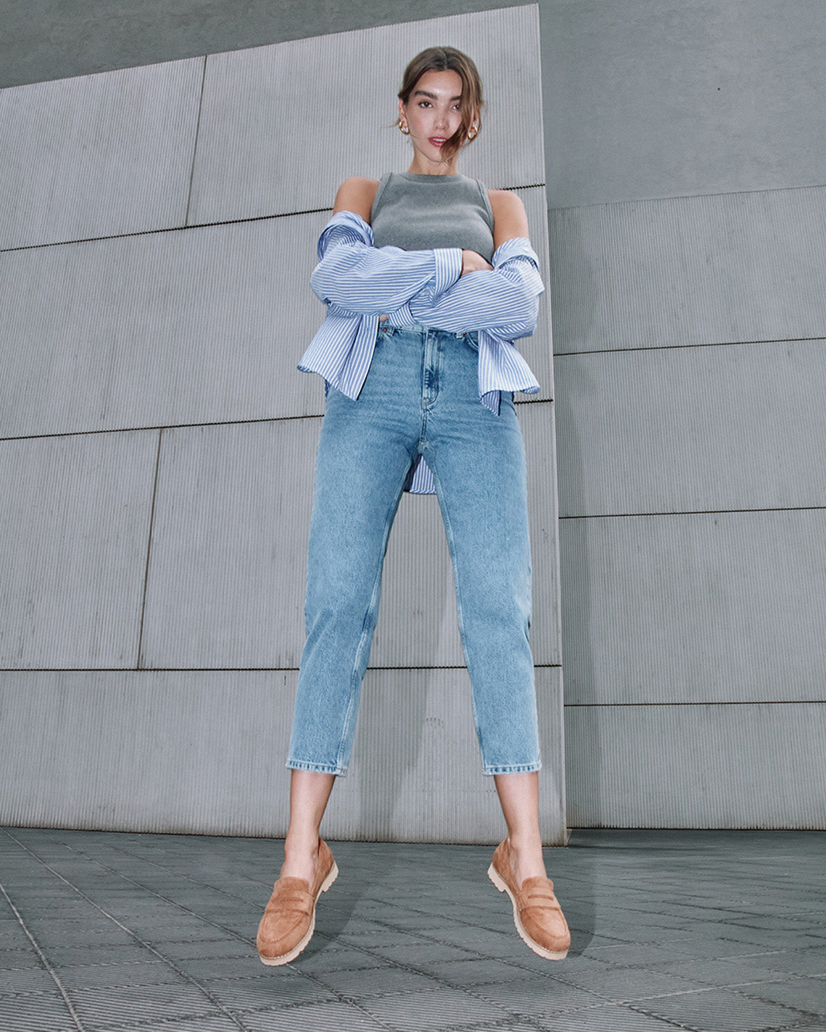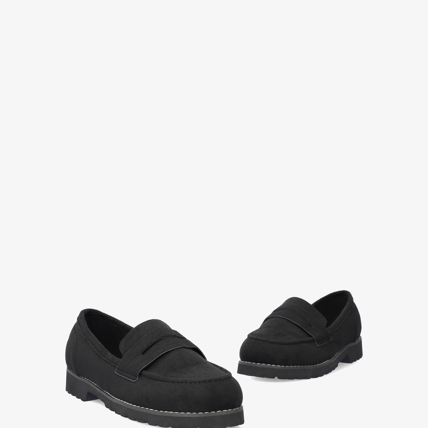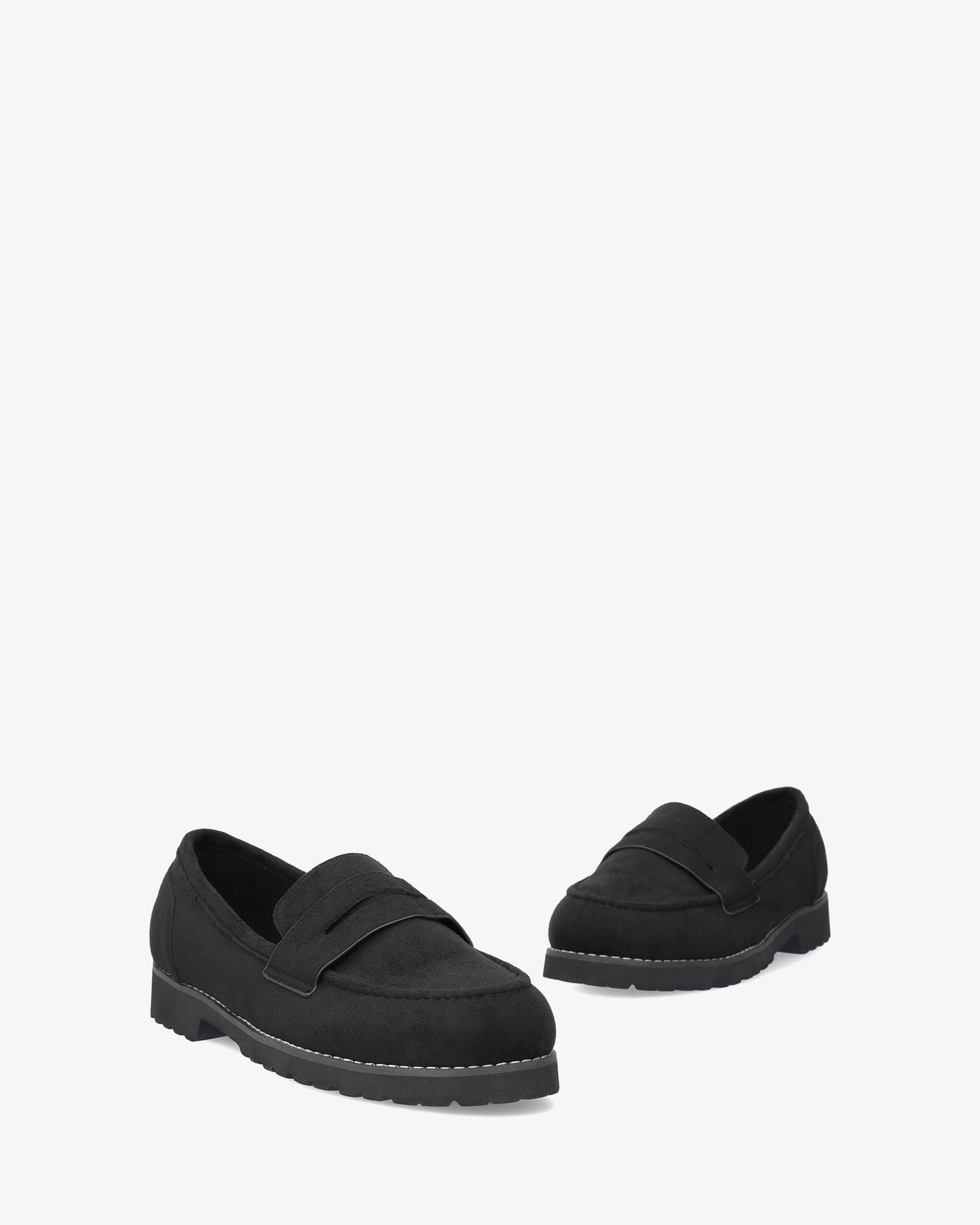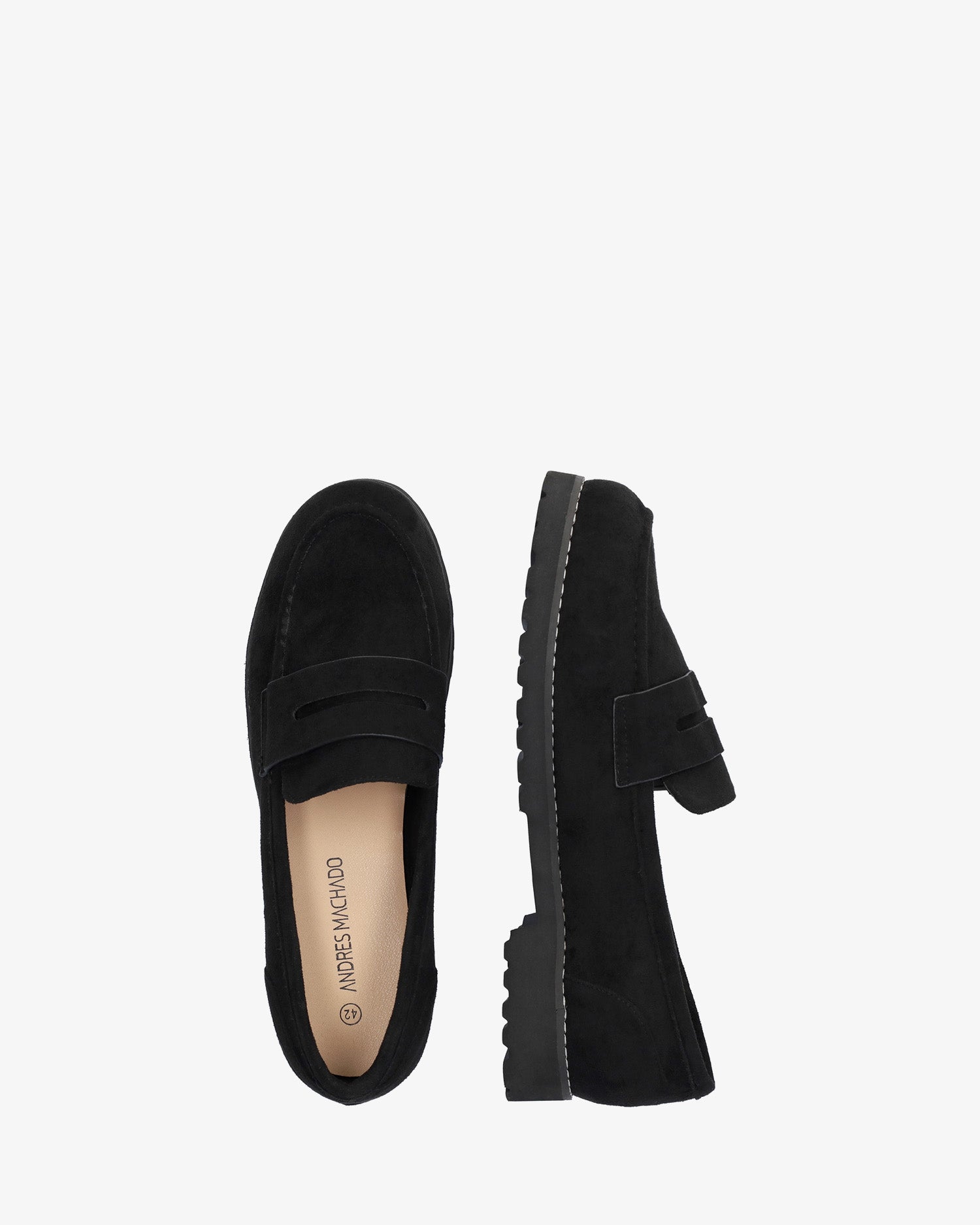 Schwarzer Mokassin in Wildlederoptik. Detail der passenden Maske auf dem Spann. Erhabene Nähte mit passendem Faden an der Spitze. Abgerundete Spitze. Schwarze Gummilaufsohle, 2 cm hoch, für große Größen von 42 bis 45.