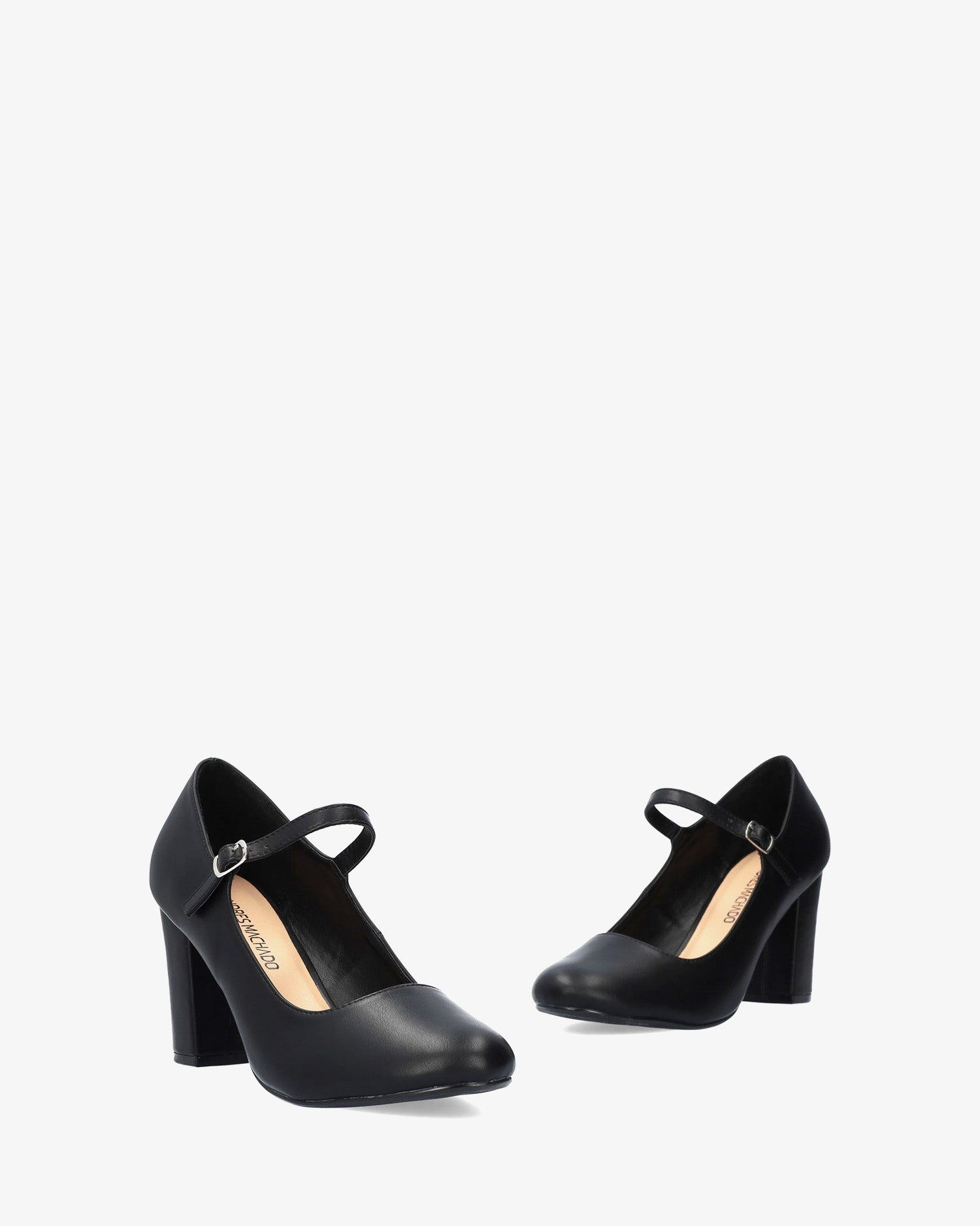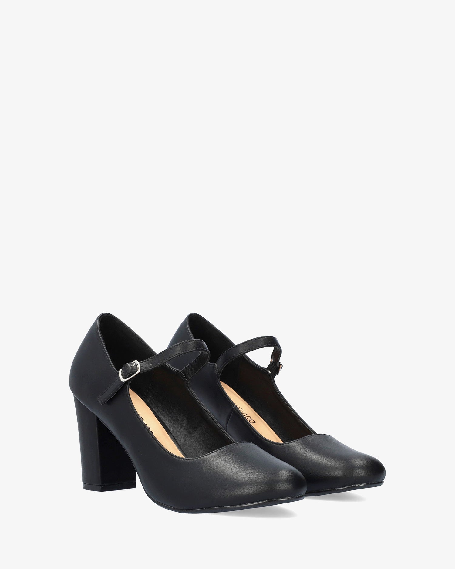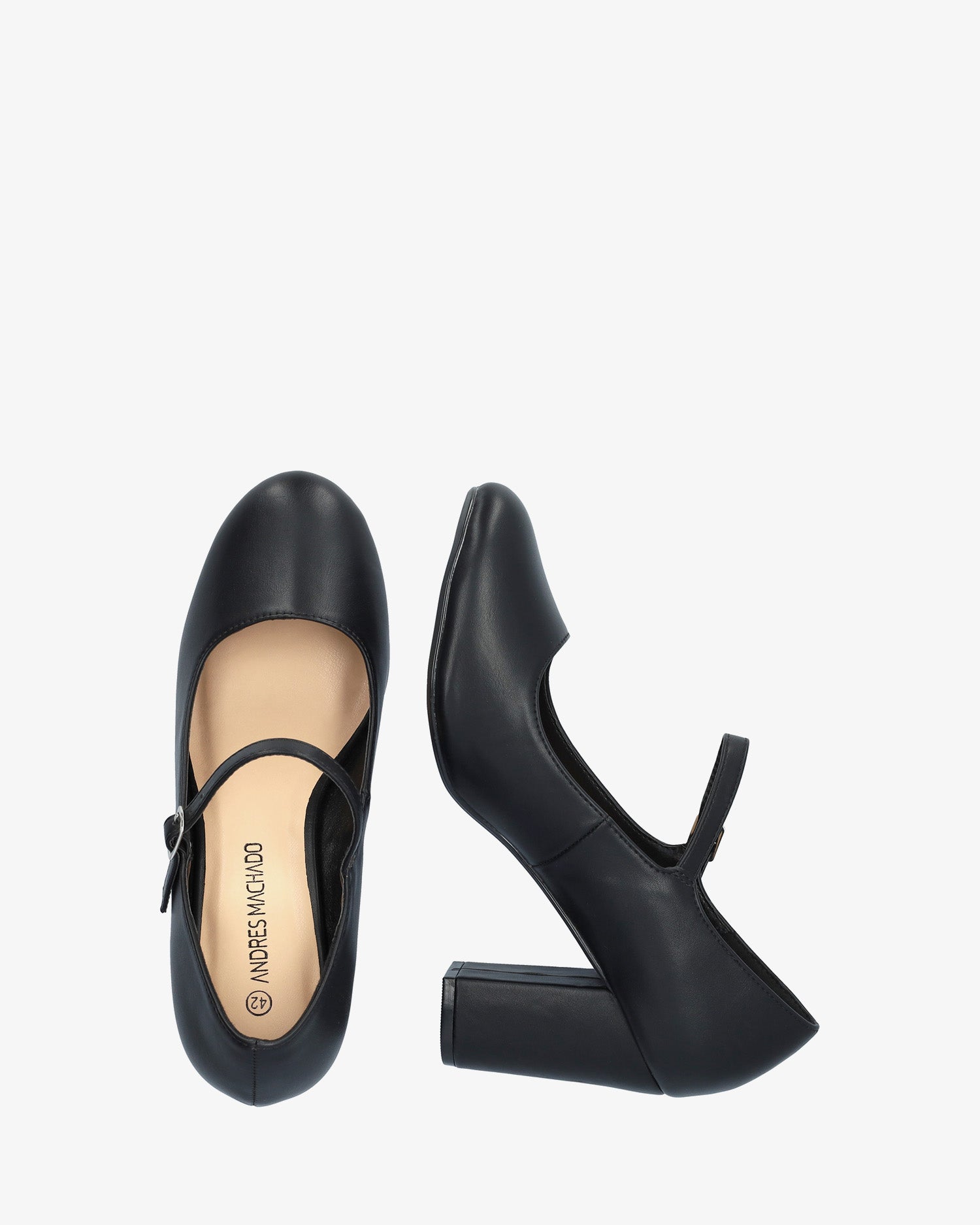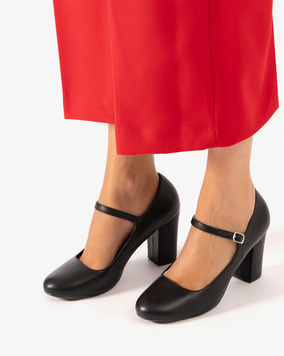 Schuh im Mary-Jane-Stil mit weichem, schwarzem Absatz. Abgerundet durch eine runde Zehenpartie und einen Riemen über dem Spann mit einer Metallschnalle an der Seite. Farblich passend gefütterter 9 cm hoher, quadratischer Absatz für die kleinen Größen 32 bis 35 und 9,5 cm Absatz für die großen Größen 42 bis 45.