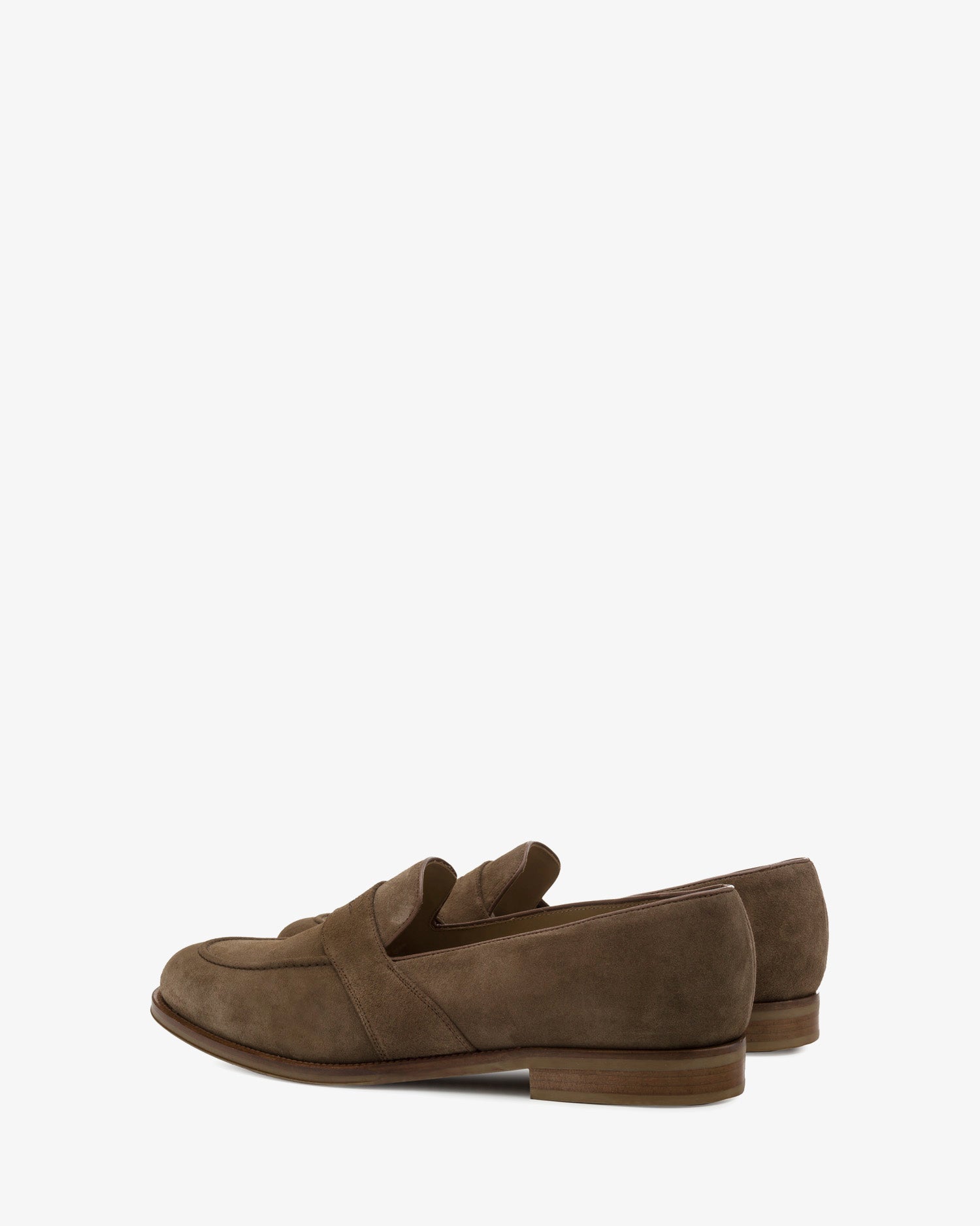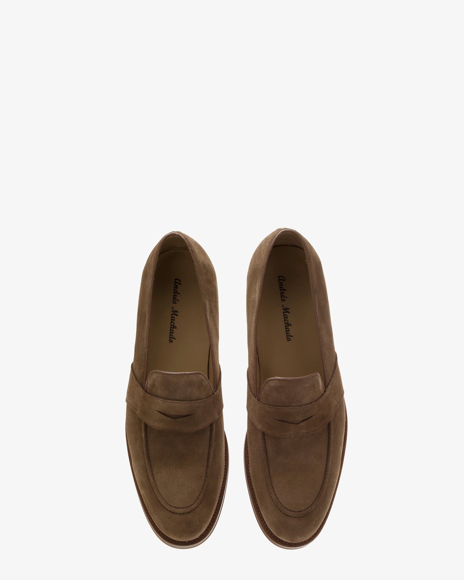 Mokassin aus erdfarbenem Wildleder mit kamelfarbenem Lederfutter. Detail der passenden Maske auf der Vorderseite. Beige Gummisohle. Herren-Übergrößen von 47 bis 50. Hergestellt in Spanien.