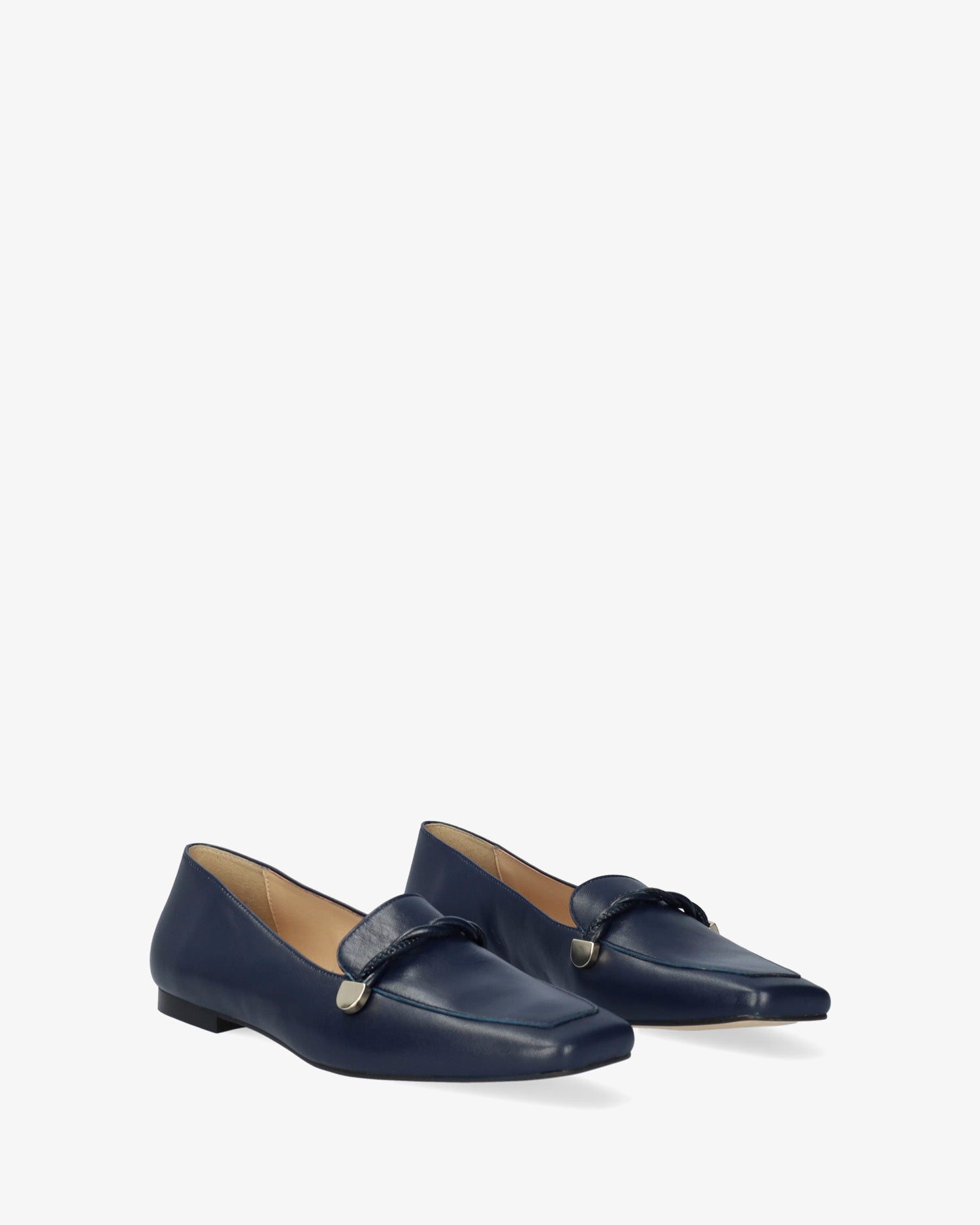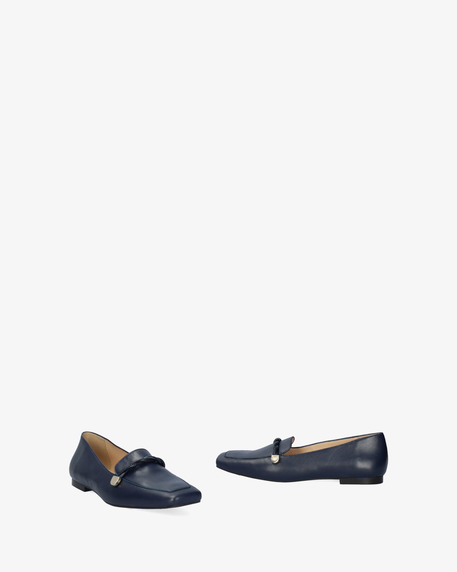 Marinefarbener Ledermokassin. Ton-in-Ton-Kordeldetail mit goldenen Applikationen an den Seiten. Dekorative Nähte aus passendem Garn. Innenfutter aus beigefarbenem Leder. Quadratische Zehenpartie. Verfügbare Größen von 32 bis 45. Hergestellt in Spanien.