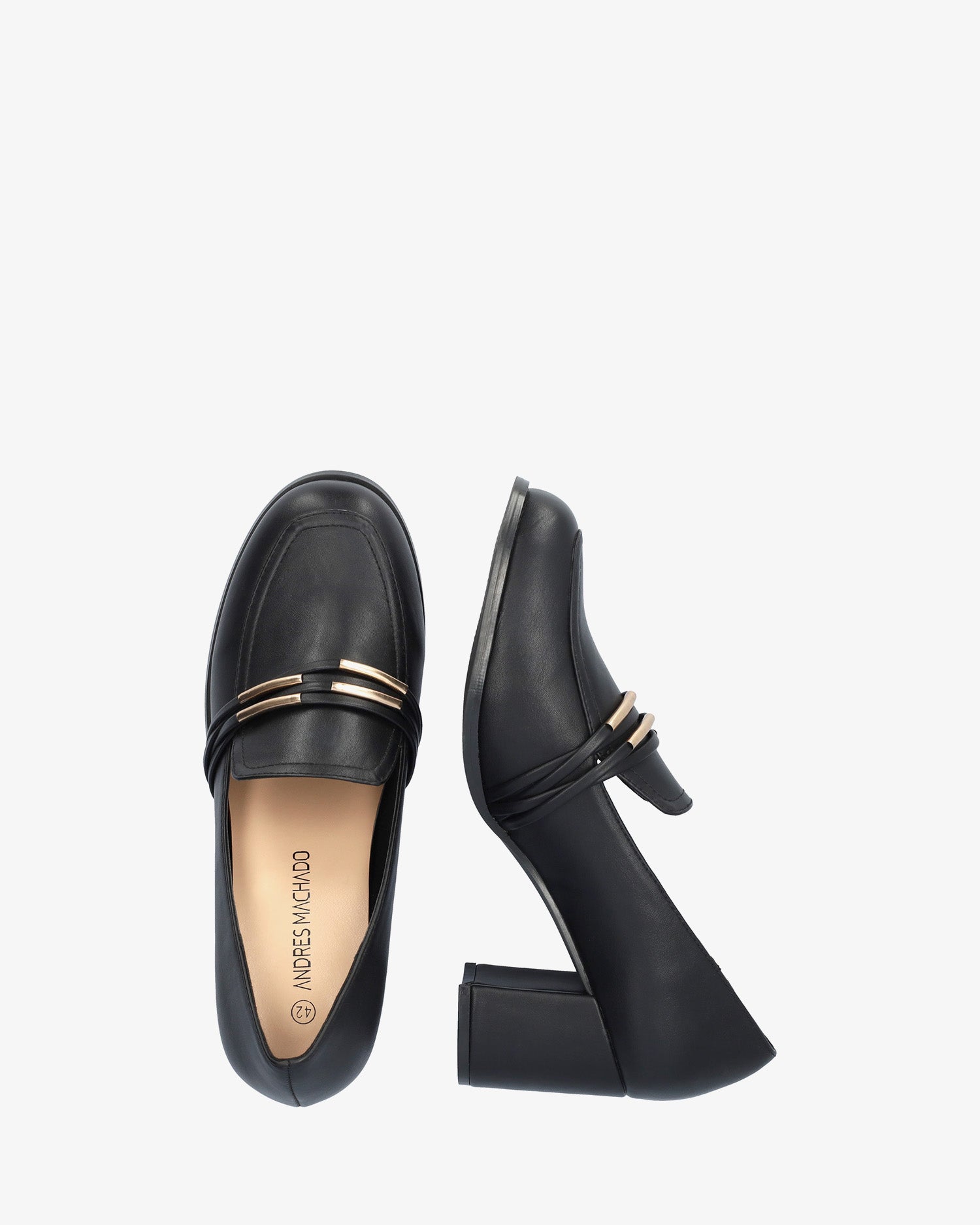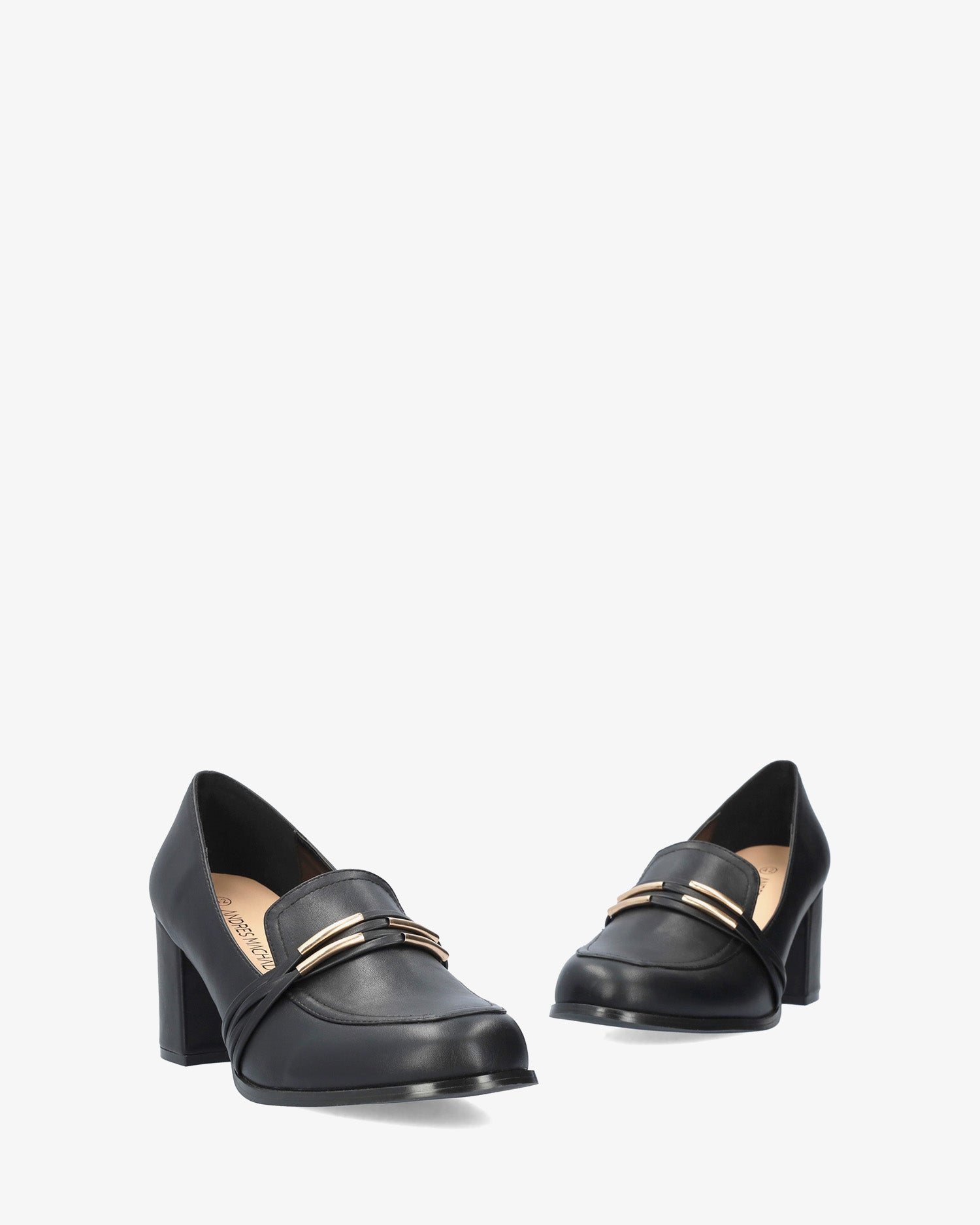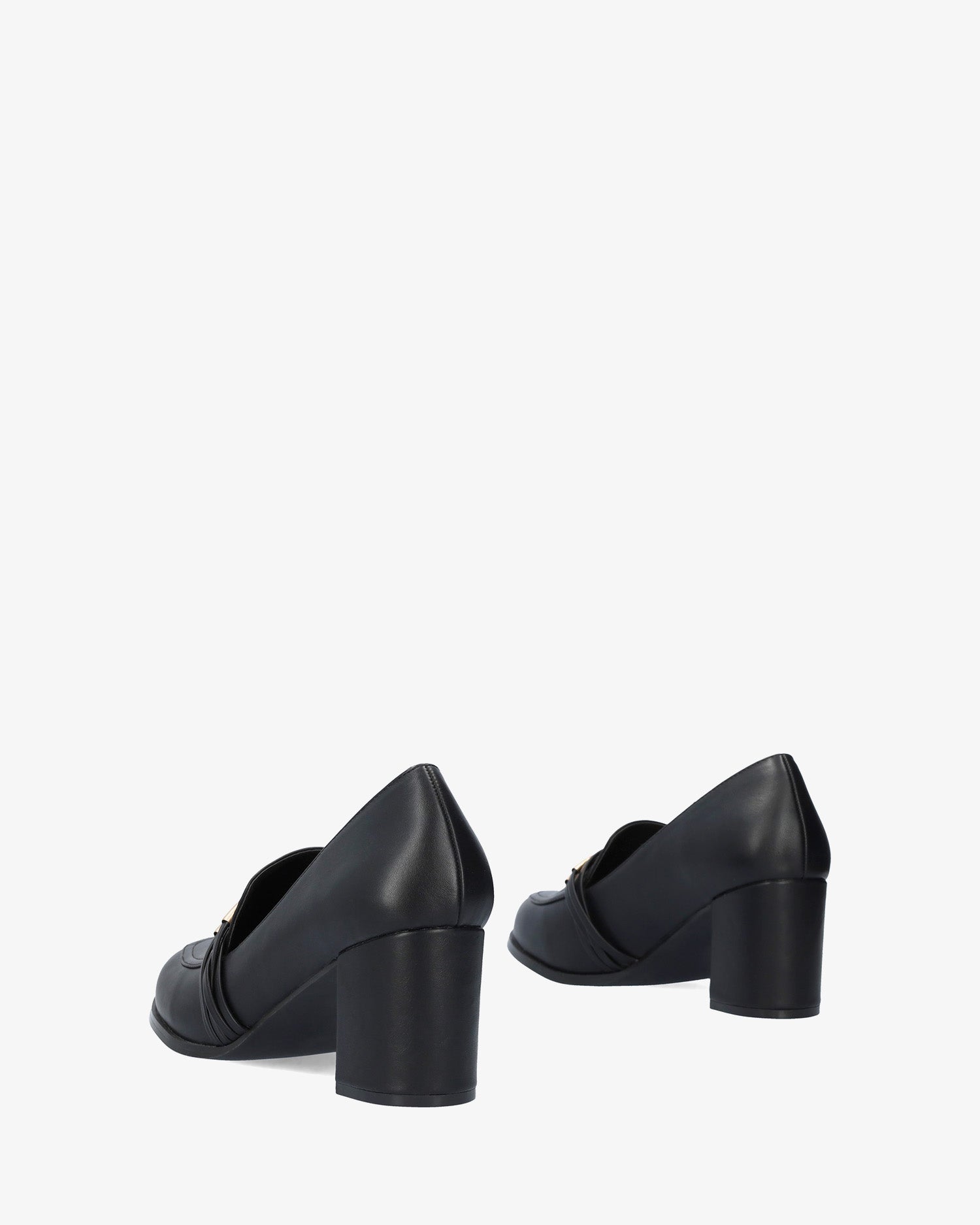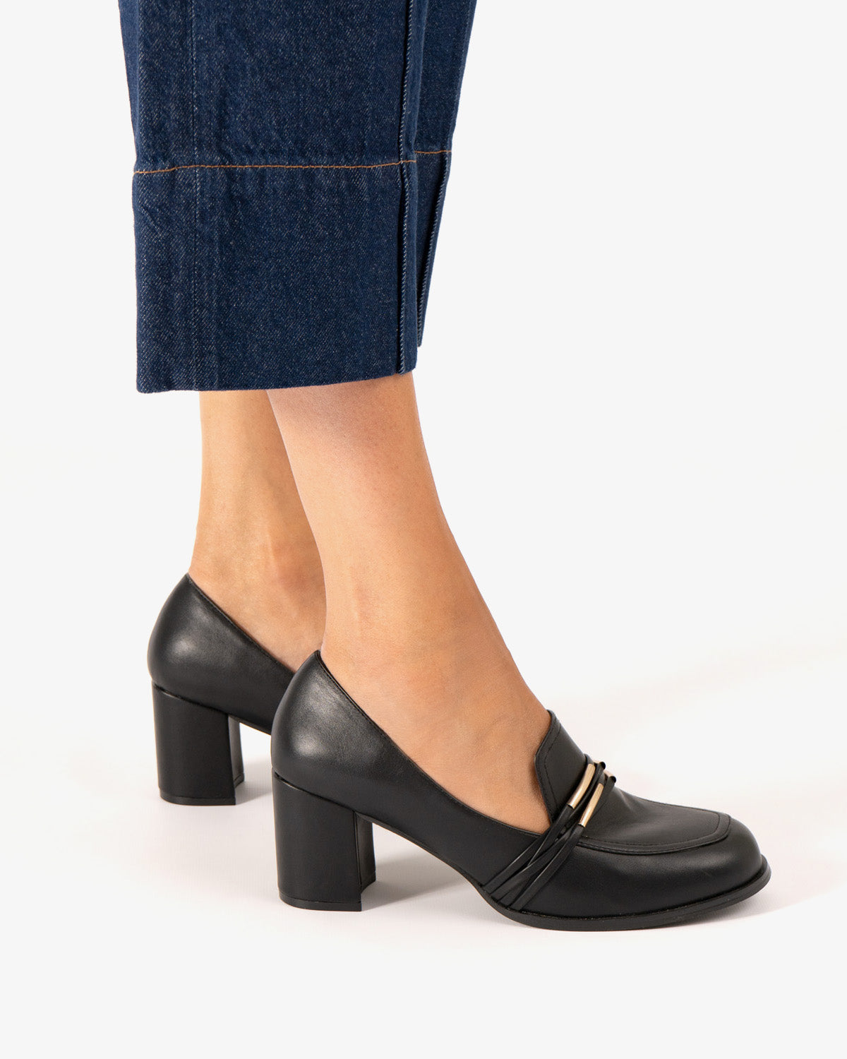 Schwarzer weicher Mokassin. Ton-in-Ton-Zunge und Augenmaskendetail mit feinen goldenen Röhrenverzierungen auf dem Spann. Abgerundete Spitze. 7 cm breiter, Ton-in-Ton gefütterter Absatz für die kleinen Größen 32 bis 35. 8 cm Absatz für die großen Größen 42 bis 45. Dieses Modell kann eine Maßabweichung vom Standard aufweisen; Wir empfehlen Ihnen, die cm-Größe der Innensohle bzw. Brandsohle zu überprüfen.