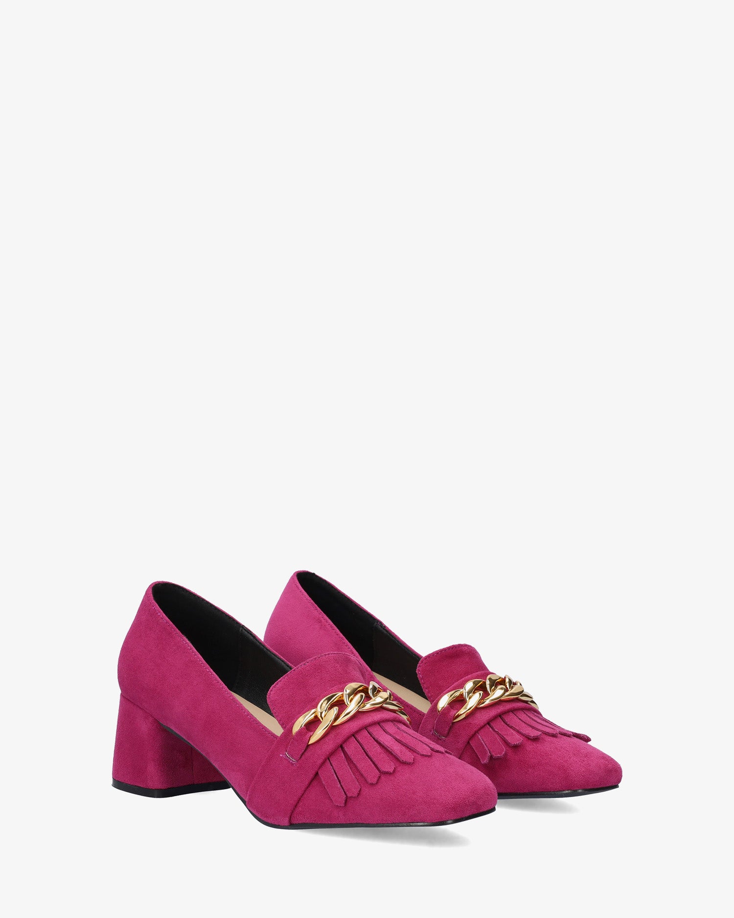 Fuchsiafarbener Schuh im Mokassin-Stil, ähnlich wie Wildleder. Ton in Ton gehaltenes Fransendetail und goldfarbene Gliederkette auf dem Spann. Quadratische Zehenpartie. 5,5 cm breiter, Ton-in-Ton gefütterter Absatz für die kleinen Größen 32 bis 35. 6 cm Absatz für die großen Größen 42 bis 45.