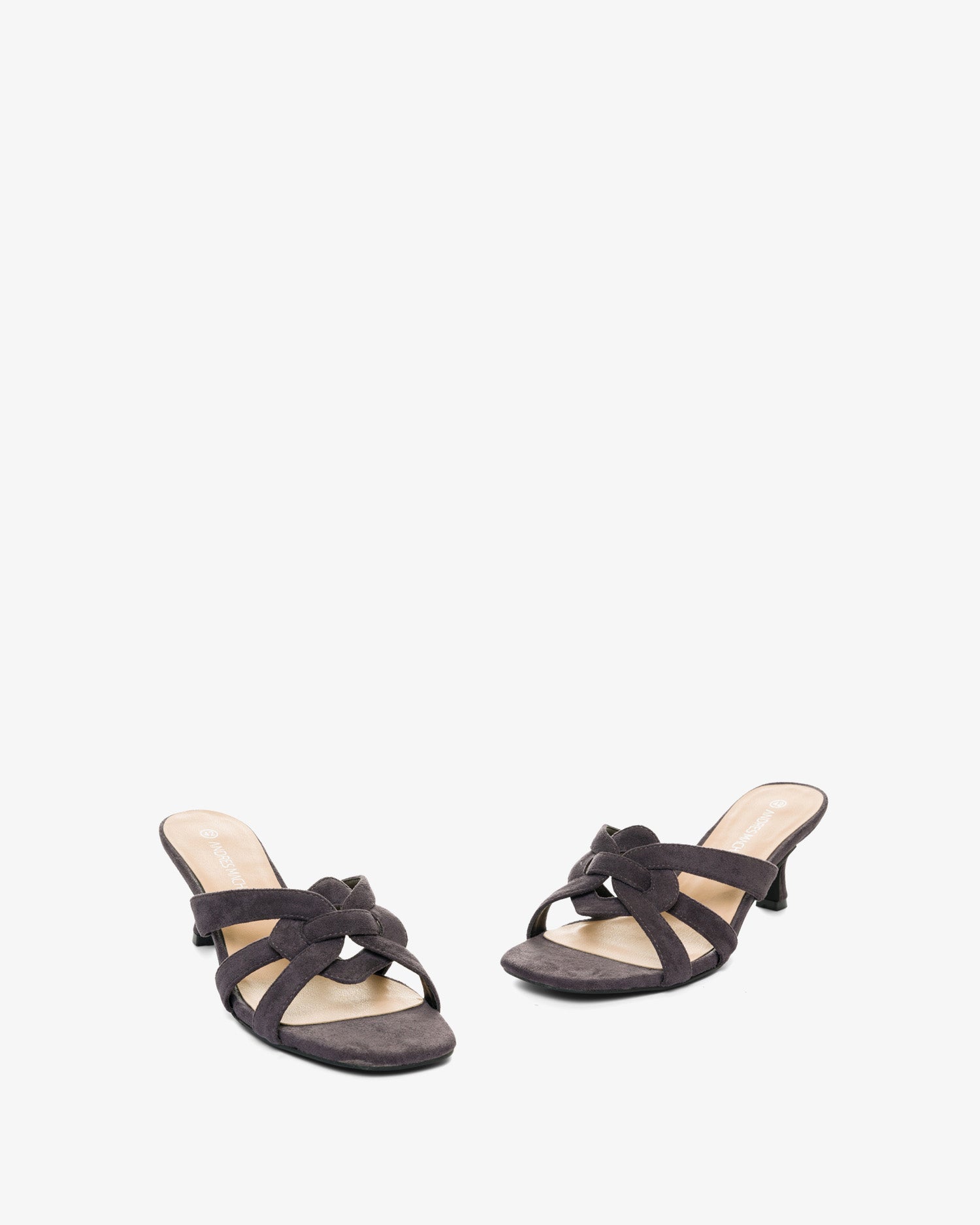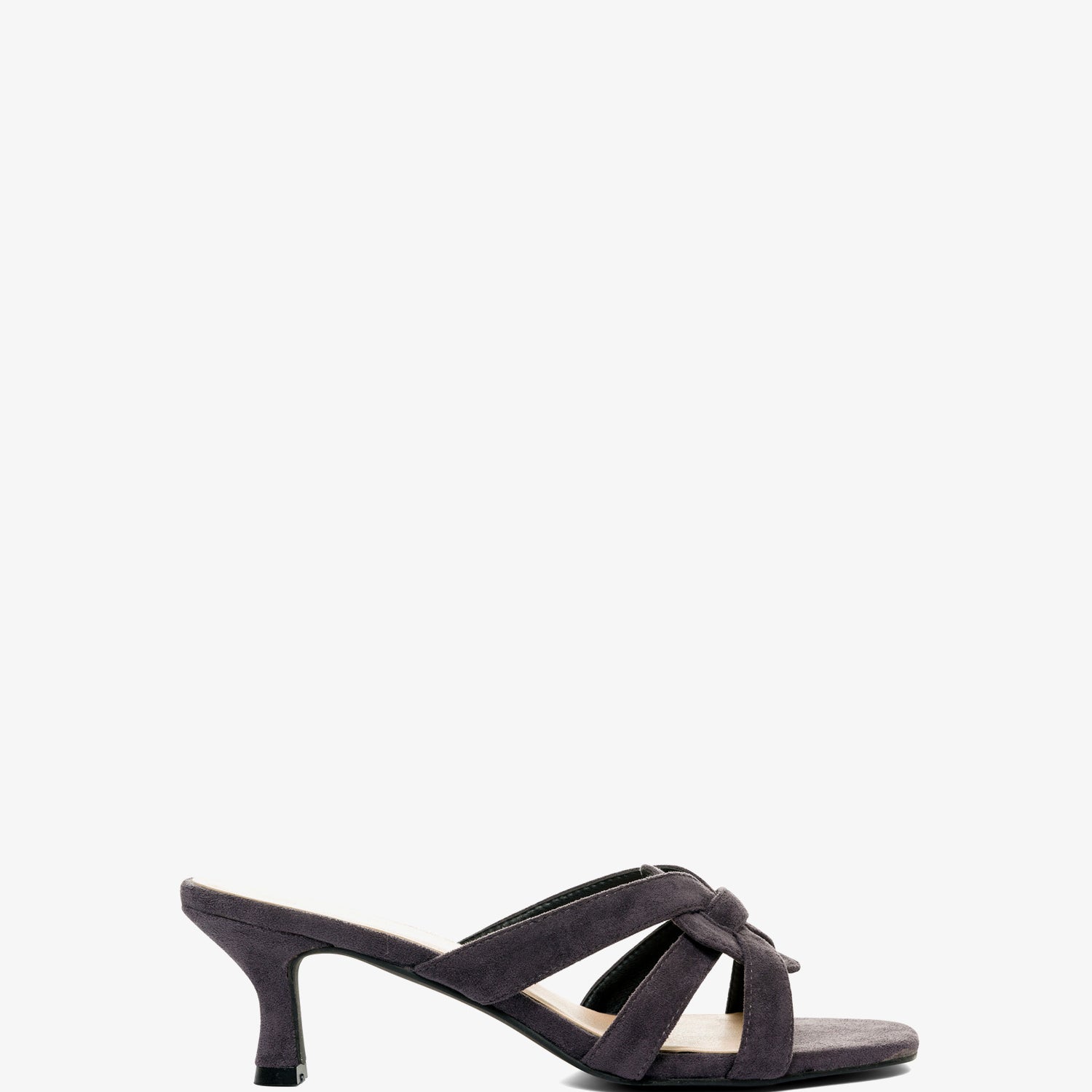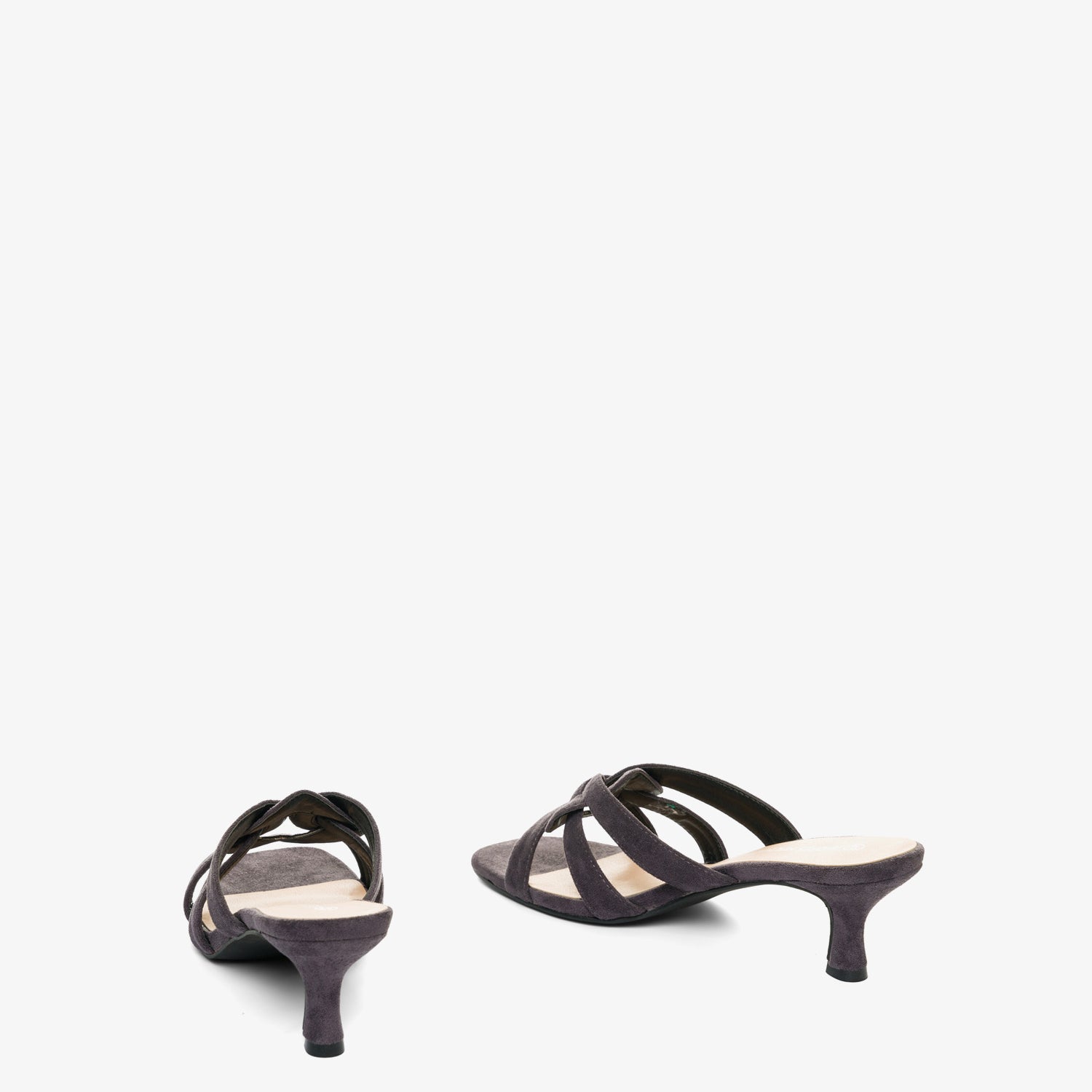 Pantoletten mit Kitten-Heel-Absatz aus grauem Wildleder. Detail aus verschlungenen und ovalen Riemen auf dem Spann im gleichen Ton. Offene und quadratische Spitze. 6,5 cm Absatz bei den kleinen Größen 32 bis 35. 7 cm Absatz bei den großen Größen 42 bis 45.