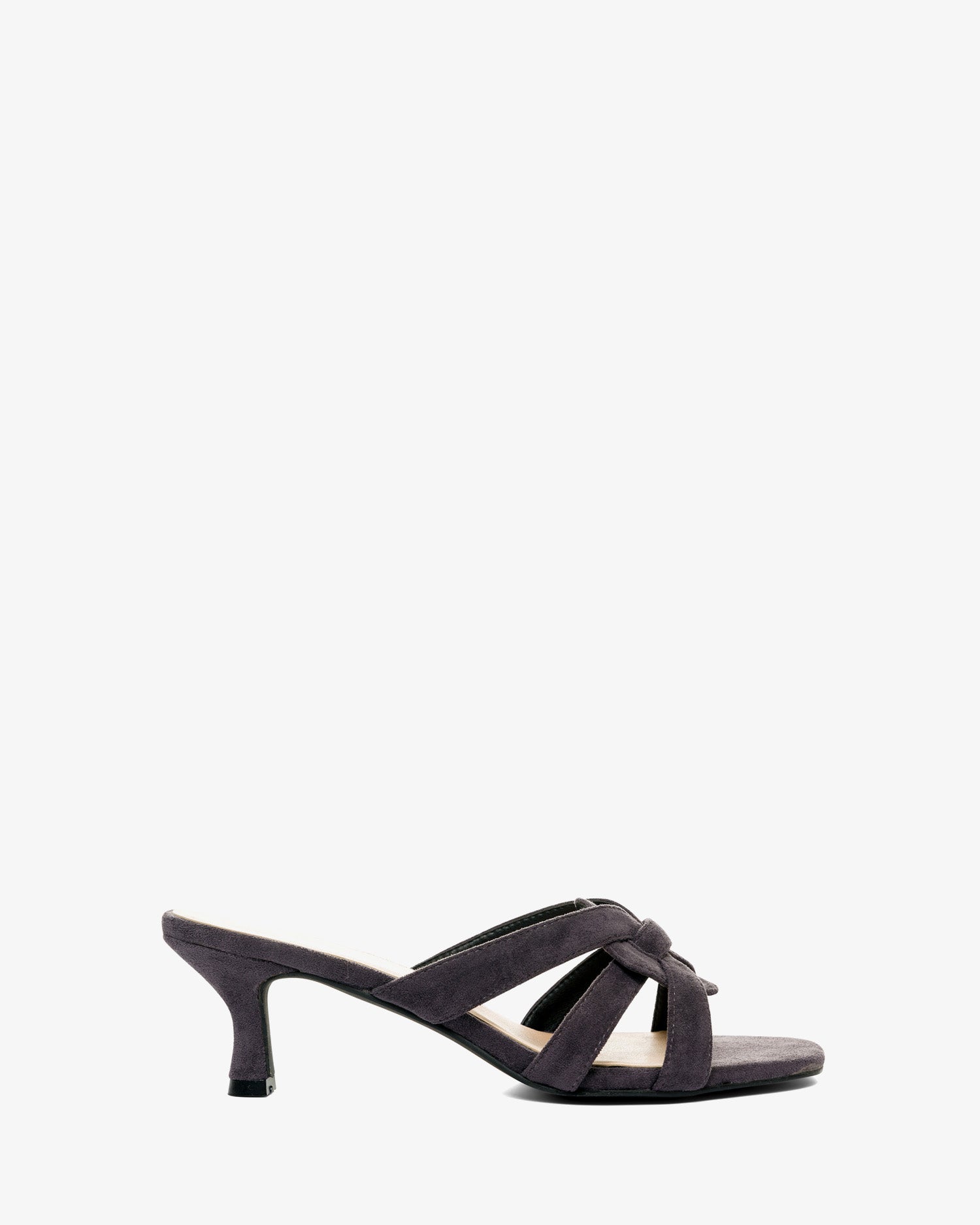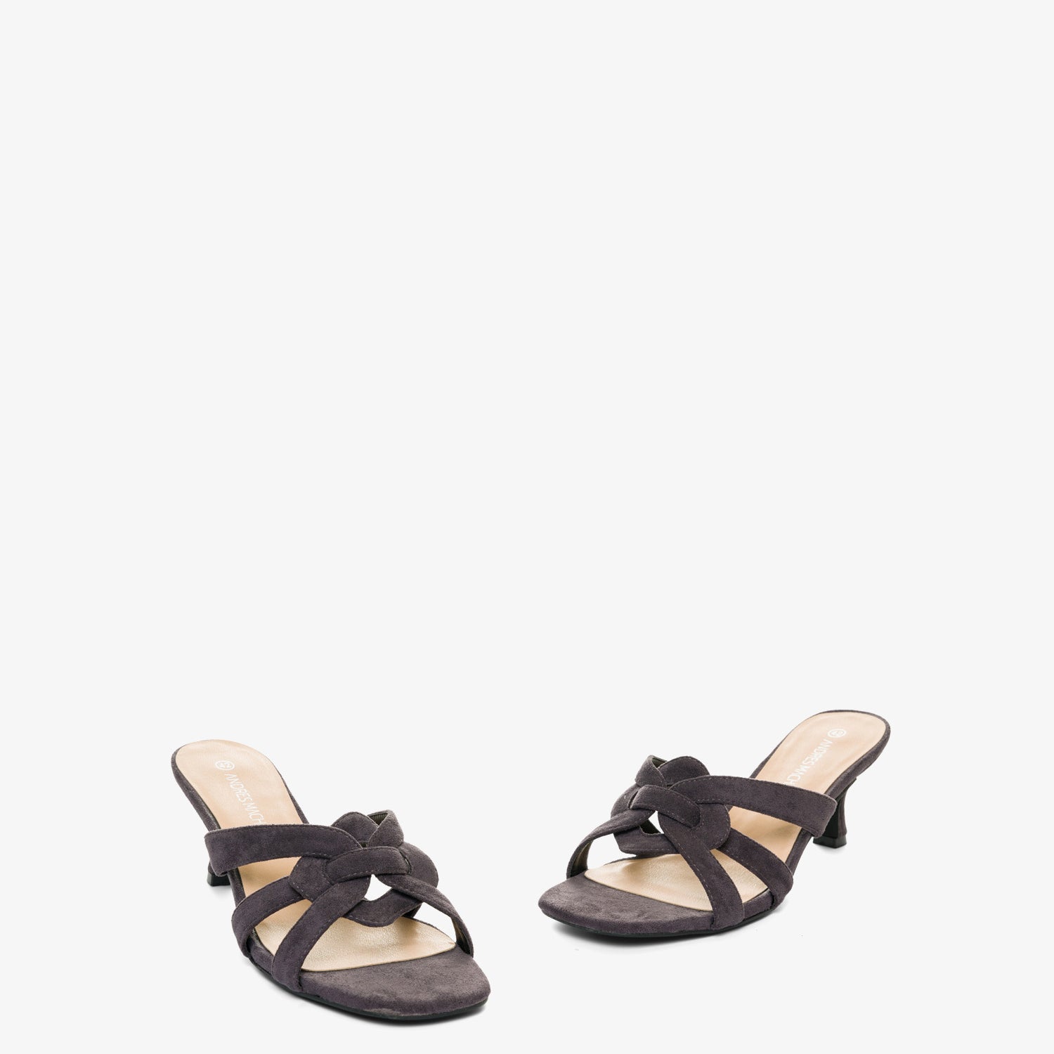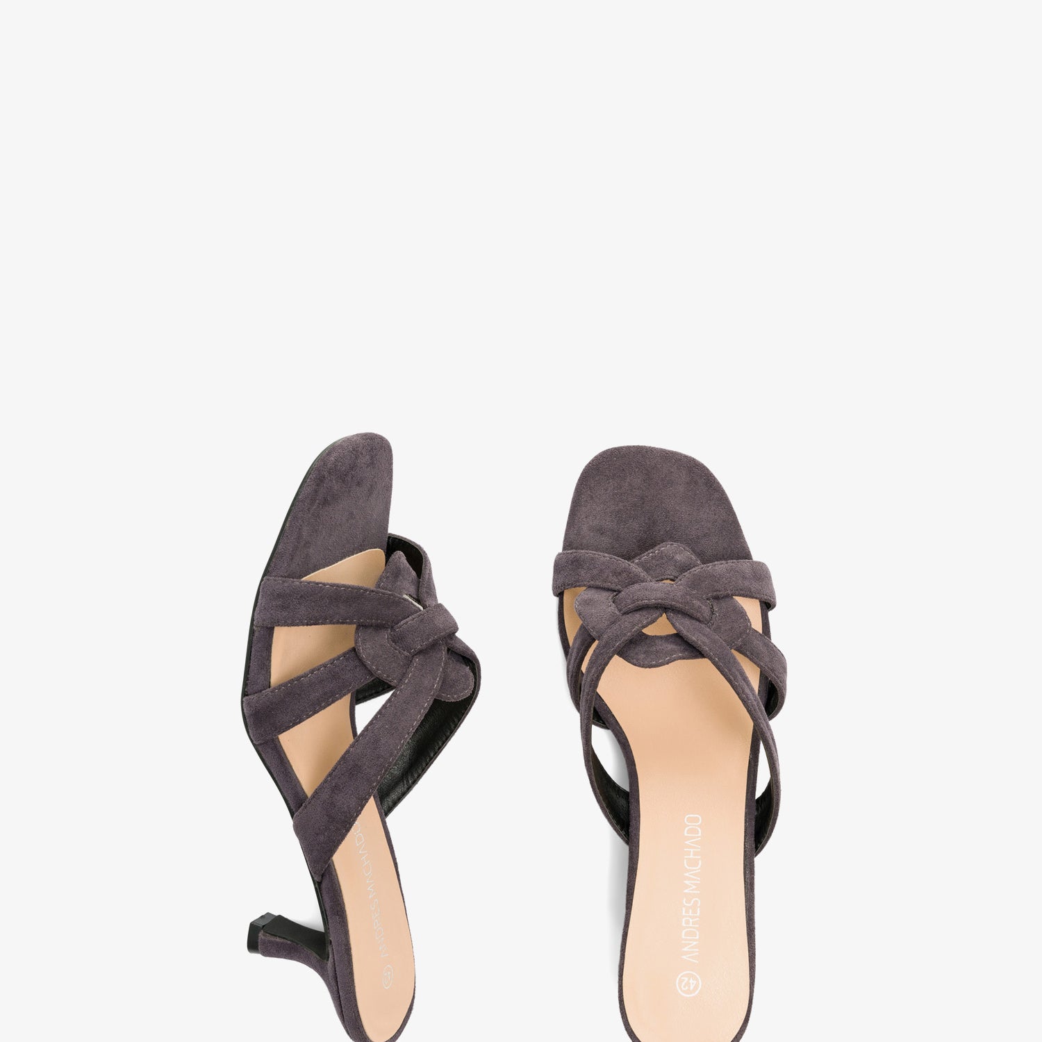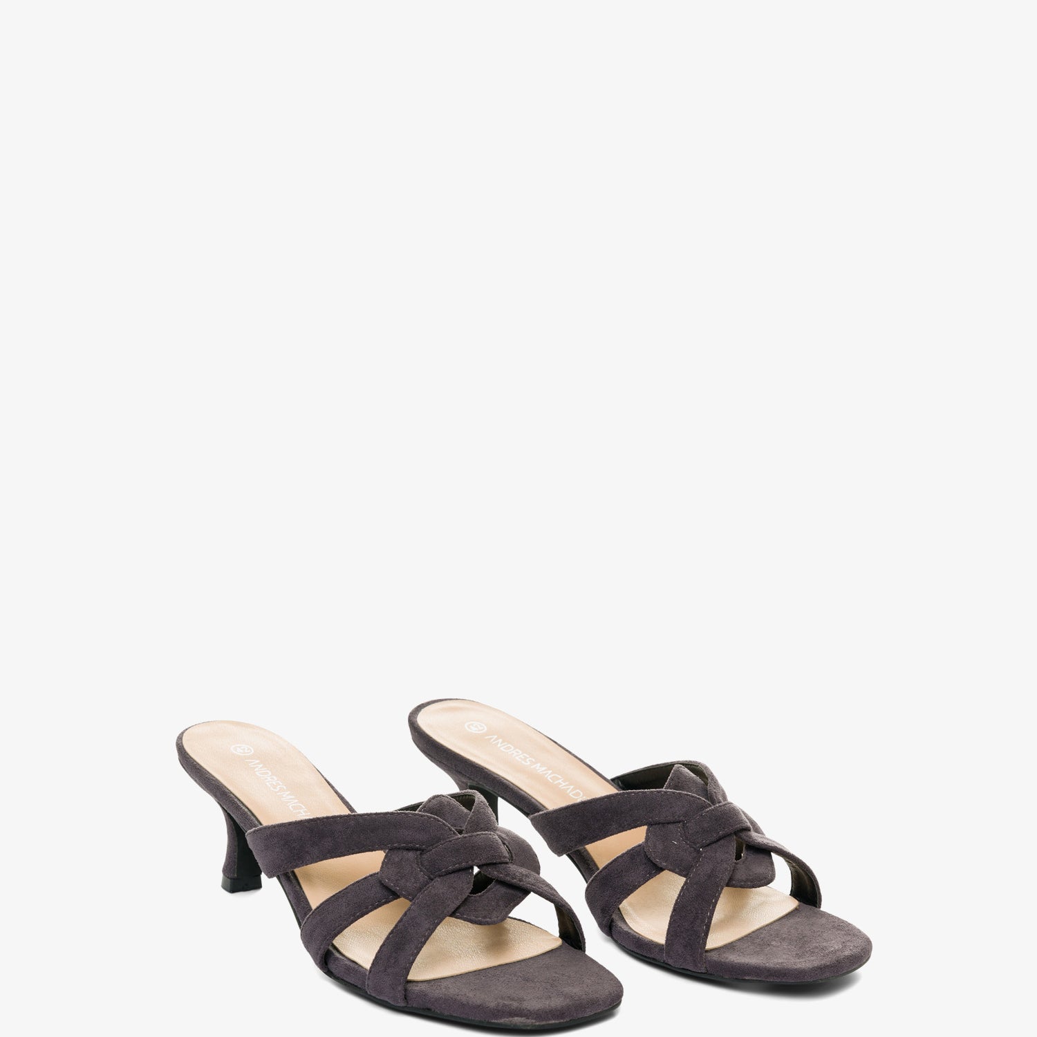 Pantoletten mit Kitten-Heel-Absatz aus grauem Wildleder. Detail aus verschlungenen und ovalen Riemen auf dem Spann im gleichen Ton. Offene und quadratische Spitze. 6,5 cm Absatz bei den kleinen Größen 32 bis 35. 7 cm Absatz bei den großen Größen 42 bis 45.